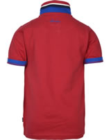 Klassisches Polo-Piqué-Shirt in rot mit verstärktem Kragen von TOM JOULE für Jungen. Am Halsausschnitt befindet sich eine typische Knopfleiste und an der linken Brustseite eine kleine Häschen-Stickerei, das Markenzeichen von TOM JOULE. Der Kragen ist auf der Unterseite blau, rot und weiß gestreift.