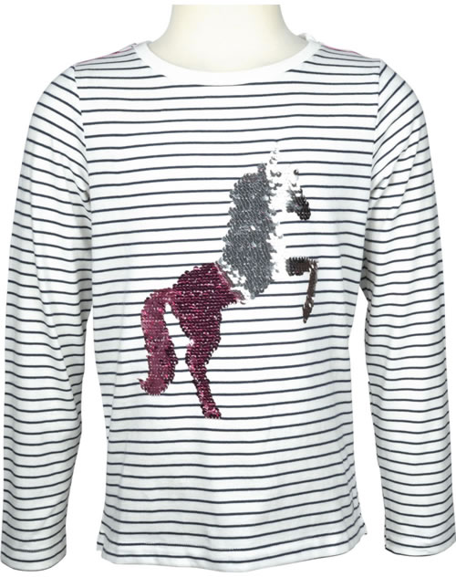 Hübsches gestreiftes Langarm-Shirt von TOM JOULES in french navy für Mädchen. Das große Wendepailletten-Einhorn ist ein toller Blickfang. Es lässt sich prima kombinieren und sorgt durch sein weiches Material für einen hohen Tragekomfort. Auf der Rückseite ist das Shirt etwas länger geschnitten. Der kleine Joule-Hase ist linksbündig unten aufgestickt.