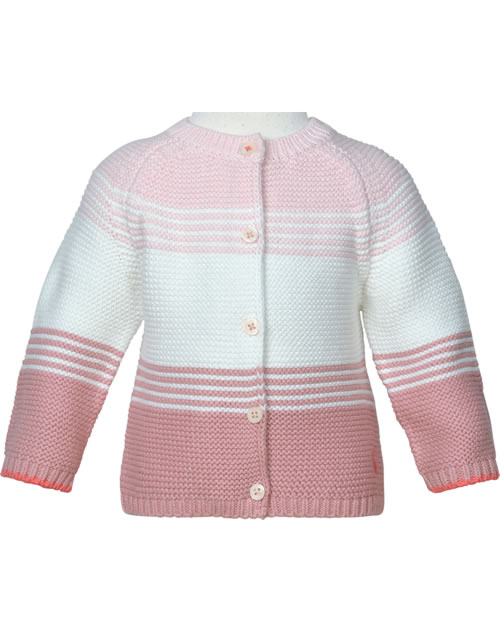 Hochwertige Baby-Strickjacke von TOM JOULE für Mädchen. Die grobgestrickte Baumwoll-Jacke in zarten rosa/weiß Tönen läßt sich mit Knöpfen verschließen. Farbige Paspeln an den Ärmeln bilden einen schönen Kontrast. Das Joules Logo befindet sich linksbündig.