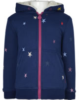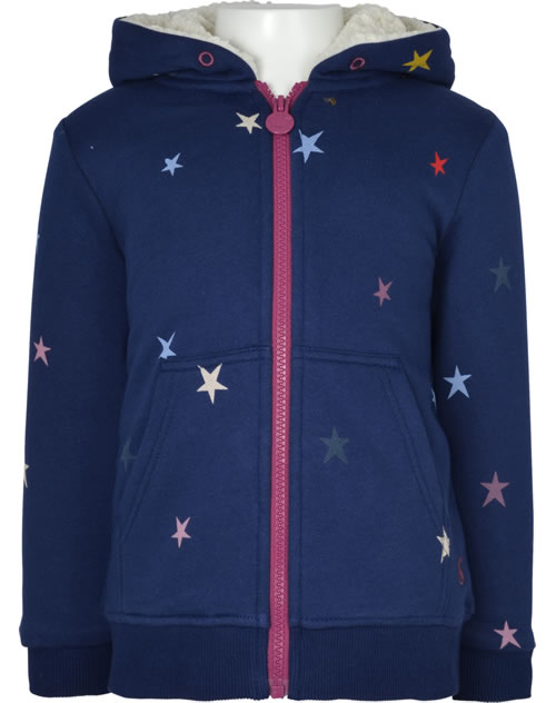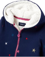 Teddyfell- Sweatjacke mit Kapuze in dunkelblau von TOM JOULE. Das hübsche Sternenmuster zieht alle Blicke auf sich. Die Jacke ist komplett mit kuscheligem Teddyfell gefüttert und somit der ideale Begleiter für Herbst und Winter. Das kleine Häschen-Logo ist auf der Vorderseite. Zwei Bauchtaschen bieten Platz für Kleinigkeiten.