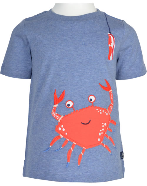 Blaues Kurzarm-Shirt von TOM JOULE für Jungen. Ein toller Hingucker ist die Krabben-Applikation in knalligem orange auf der Vorderseite. Das weiche Material sorgt für einen hohen Tragekomfort.