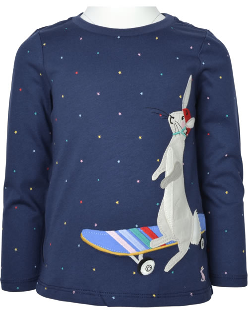 Dunkelblaues Langarm-Shirt von TOM JOULE für Mädchen mit Sternenhimmel. Ein toller Hingucker ist die Hasen mit Skatebord-Applikation auf der Vorderseite. Das weiche Material sorgt für einen hohen Tragekomfort.
