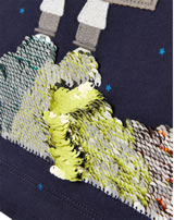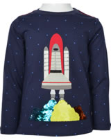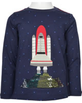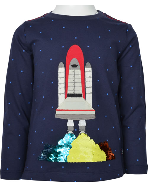 Dunkelblaues Langarmshirt von TOM JOULE mit Sternendruck. Ein echter Hingucker ist das Raketen-Motiv mit Wendepailetten auf der Vorderseite. Das Joules-Logo befindet sich im Nacken. Das weiche Material sorgt für einen hohen Tragekomfort und der Rücken ist etwas länger geschnitten.