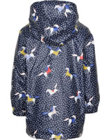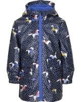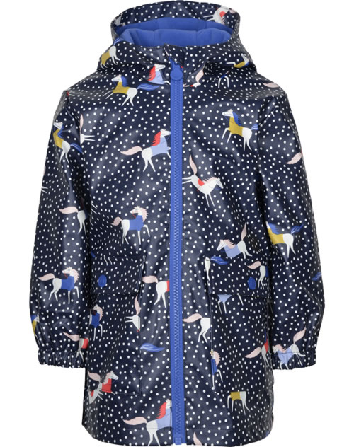 Eine dunkelblaue wasserdichte Regenjacke für Mädchen von TOM JOULE. Die mit weichem Fleece gefütterte Jacke mit fester Kapuze ist an grauen und verregneten Tagen unverzichtbar. Die Nähte sind versiegelt, sodass keine Feuchtigkeit in das Material gelangt. Ein besonderer Hingucker sind die tanzenden Pferde und der farblich abgesetzte Reißverschluss. Zwei Taschen bieten Paltz für Kleinigkeiten.