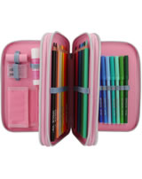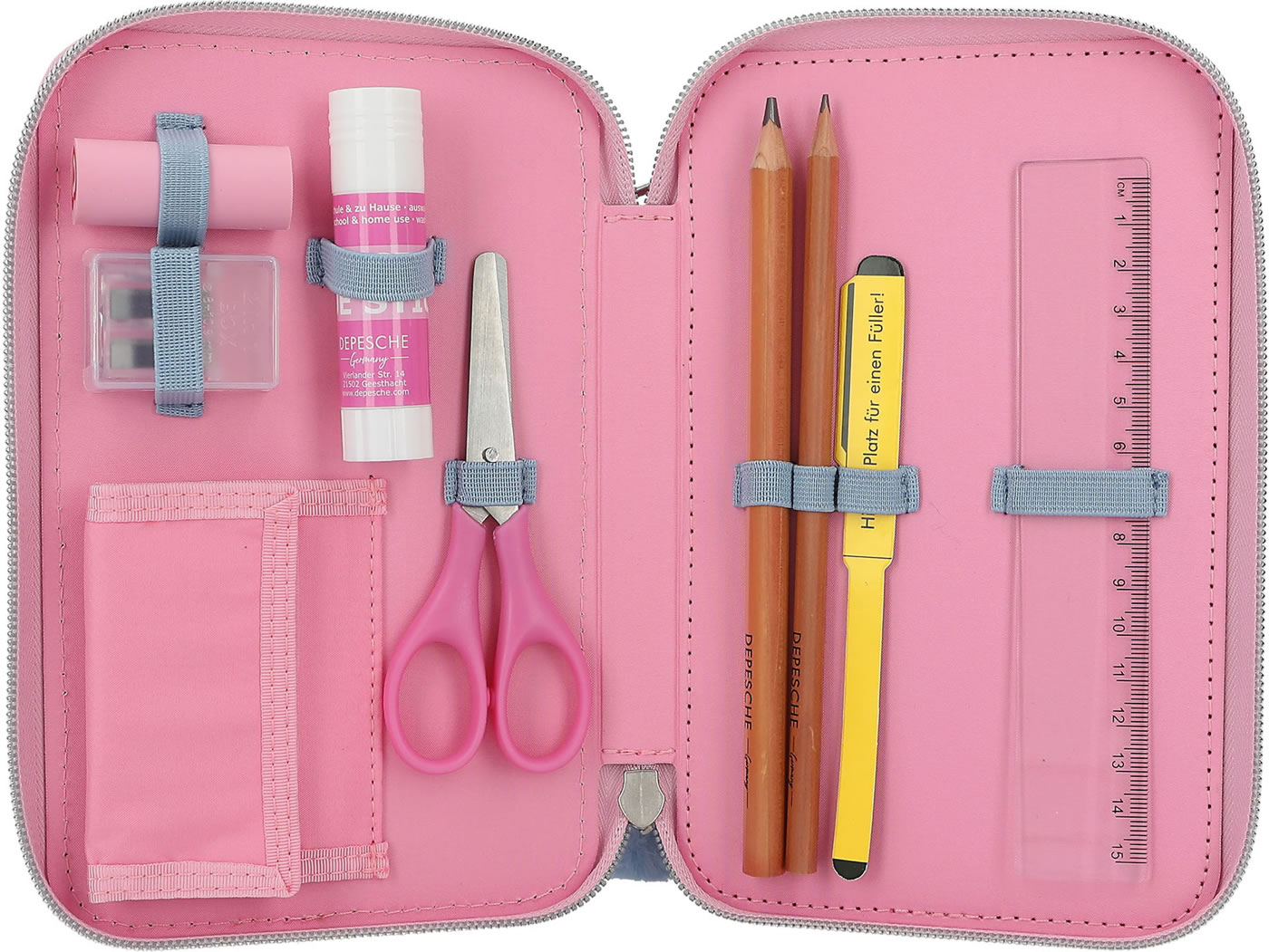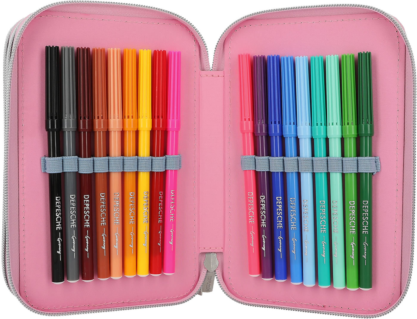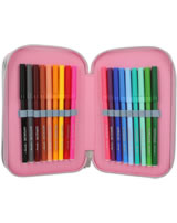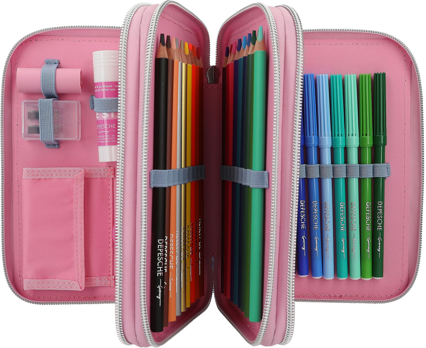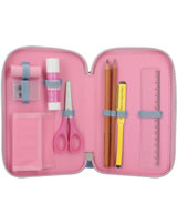 Die drei separaten Fächer sind komplett gefüllt mit je 18 Bunt- und Filzstiften, 2 Bleistiften, Anspitzer, Radierer, Lineal, Schere, Klebestift und einem kleinen Klett-Täschchen.
