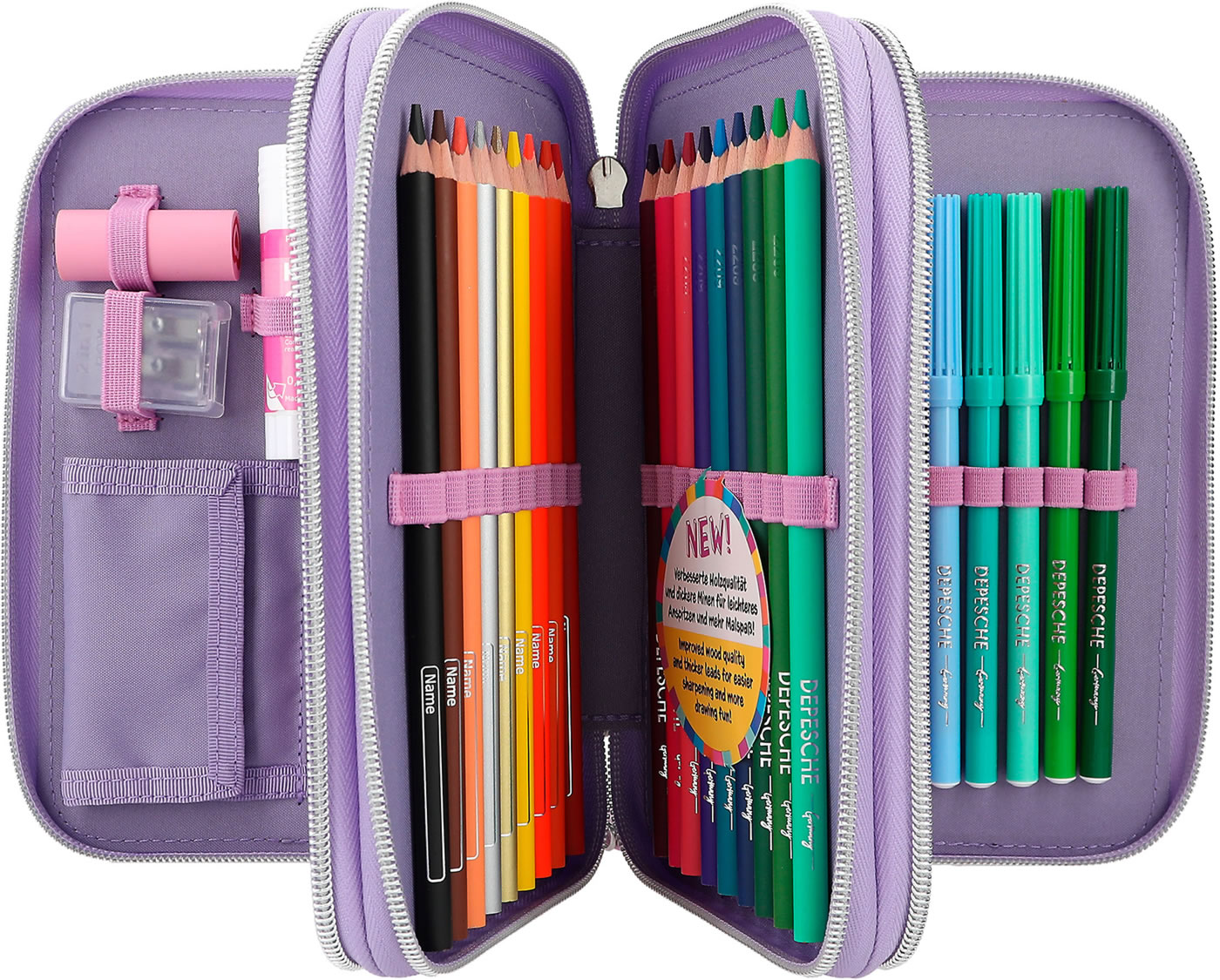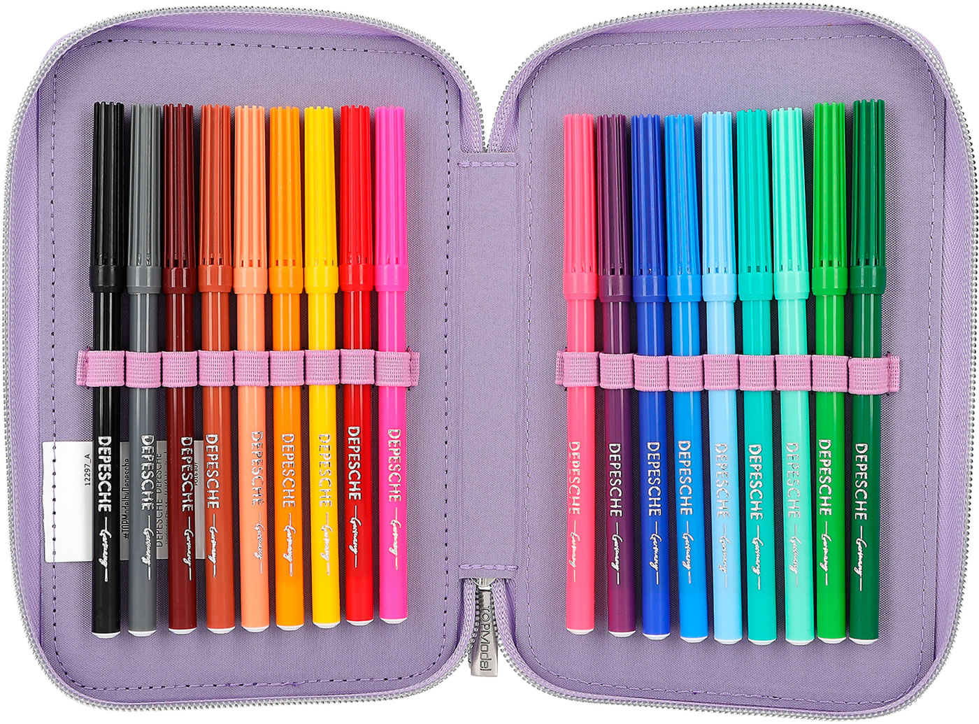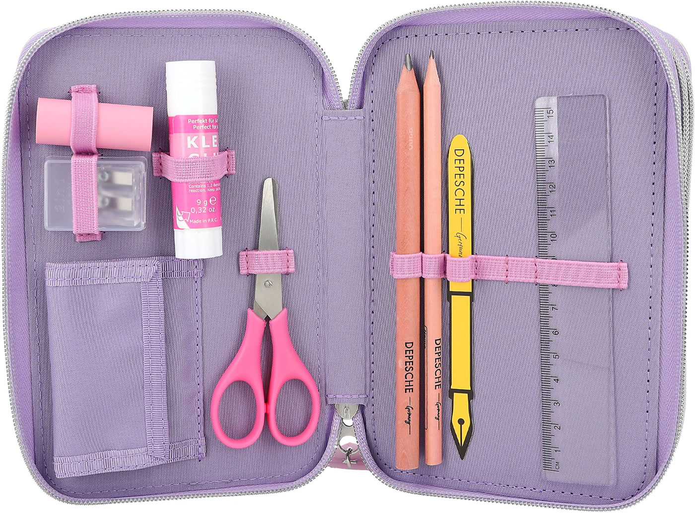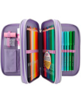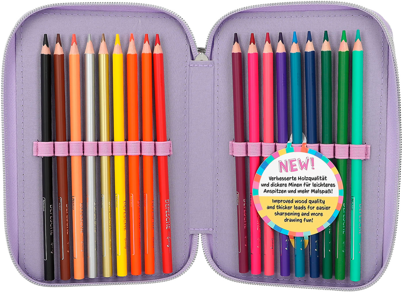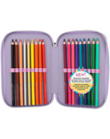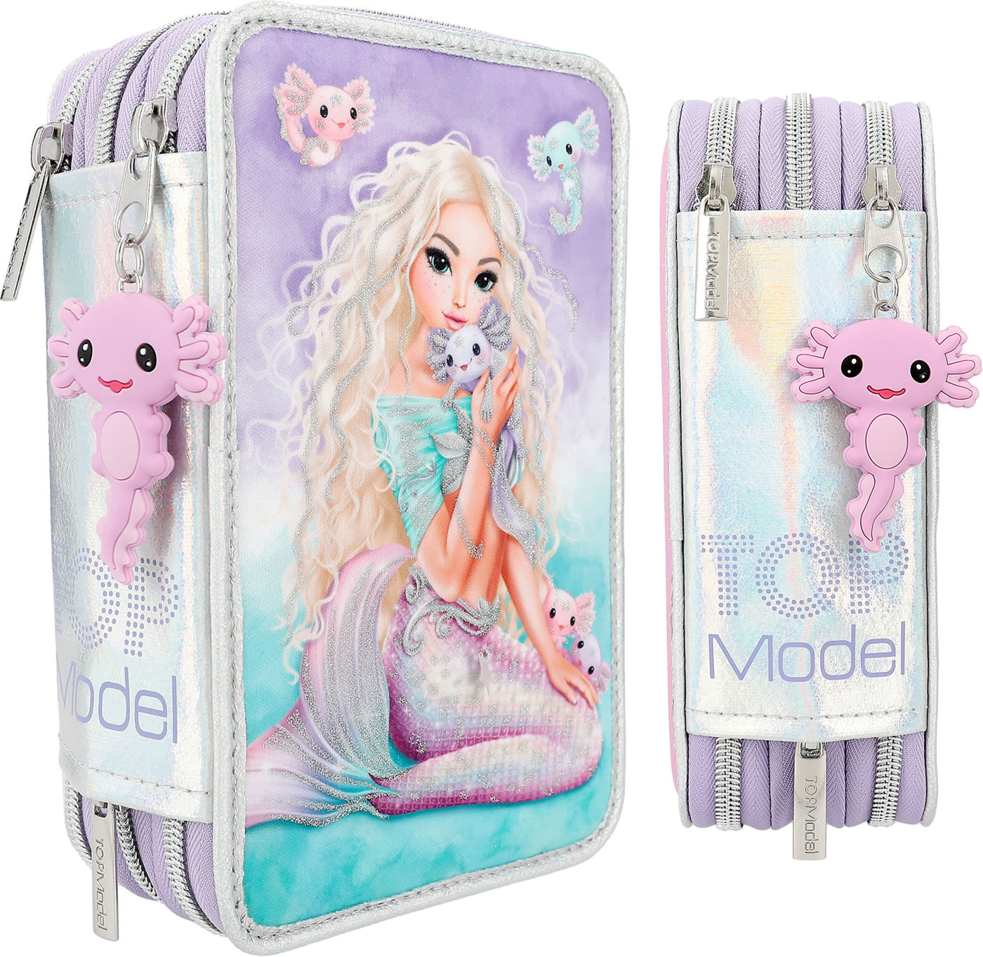 Eine wunderschöne Meerjungfrau und süße Axolotl! Die TOPModel-Federtasche ist aber auch innen ein Highlight: Die drei separaten Fächer sind komplett gefüllt mit je 18 Bunt- und Filzstiften, 2 Bleistiften, Anspitzer, Radierer, Lineal, Schere und Klebestift. Mit dabei und so niedlich: der Axolotl-Anhänger am Reißverschluss.