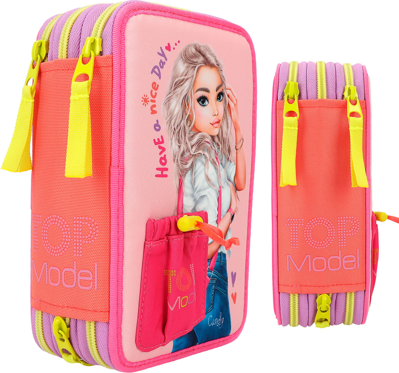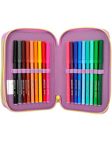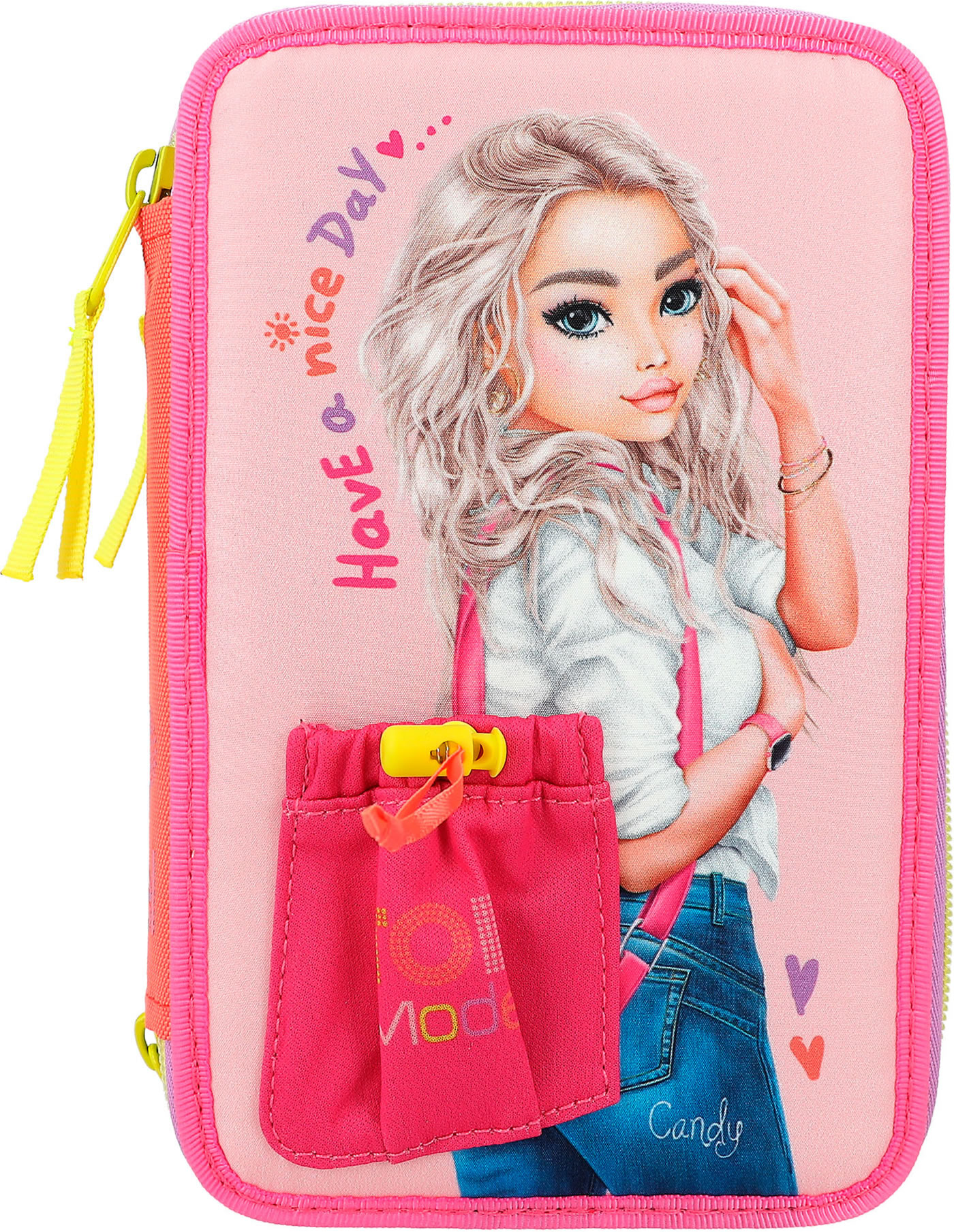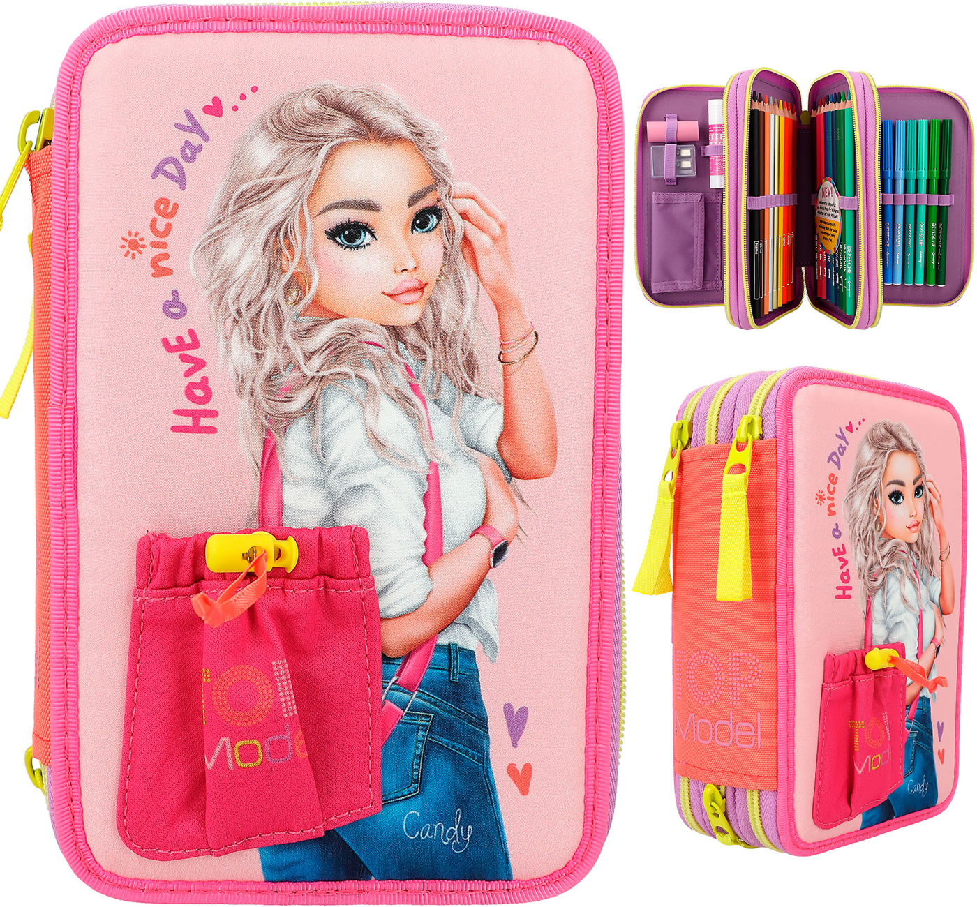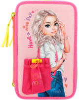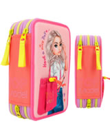 Die Federtasche mit der Tasche: Das TOPModel auf der Front trägt eine applizierte Beuteltasche, in die man eine geheime Kleinigkeit stecken kann. In angesagter, farbenfroher Colourblock-Optik. Die drei separaten Fächer sind komplett gefüllt mit je 18 Bunt- und Filzstiften, 2 Bleistiften, Lineal, Anspitzer, Radierer, Schere, Klebestift und einer kleinen Klett-Tasche.