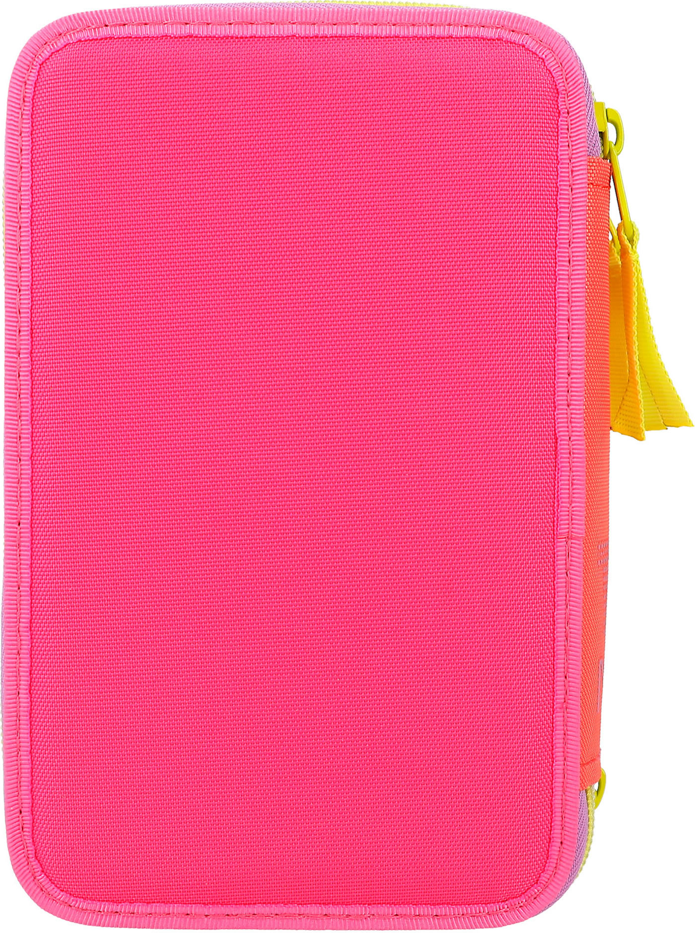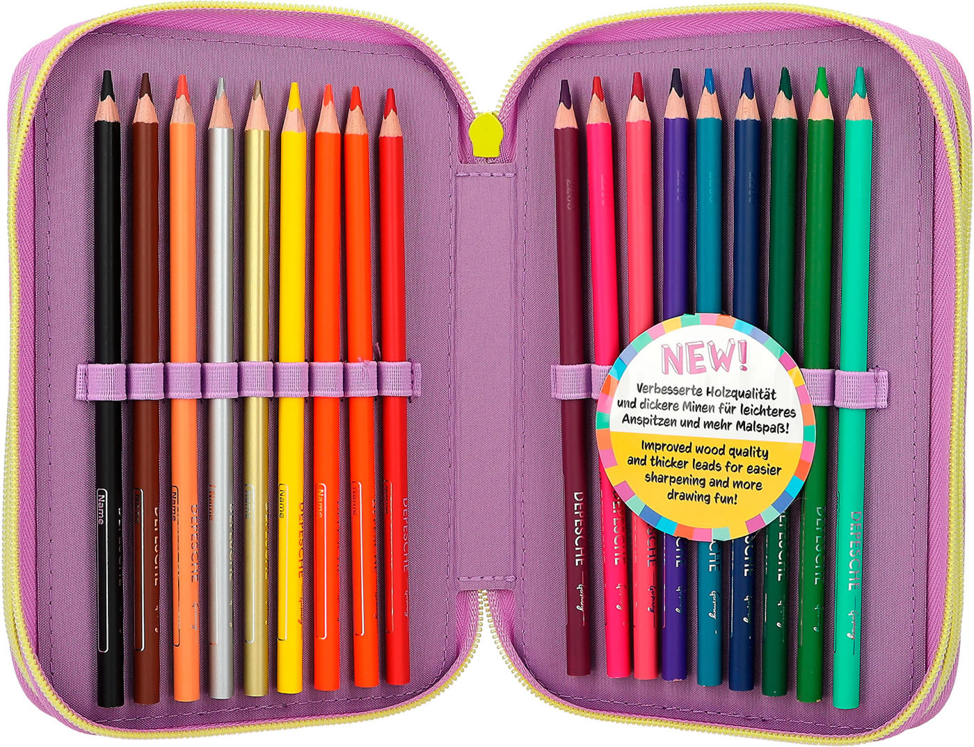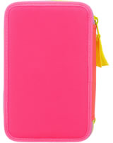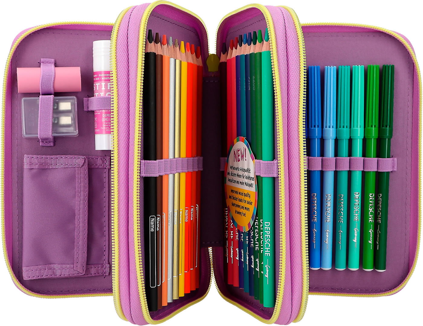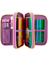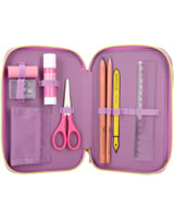 Die Federtasche mit der Tasche: Das TOPModel auf der Front trägt eine applizierte Beuteltasche, in die man eine geheime Kleinigkeit stecken kann. In angesagter, farbenfroher Colourblock-Optik. Die drei separaten Fächer sind komplett gefüllt mit je 18 Bunt- und Filzstiften, 2 Bleistiften, Lineal, Anspitzer, Radierer, Schere, Klebestift und einer kleinen Klett-Tasche.