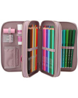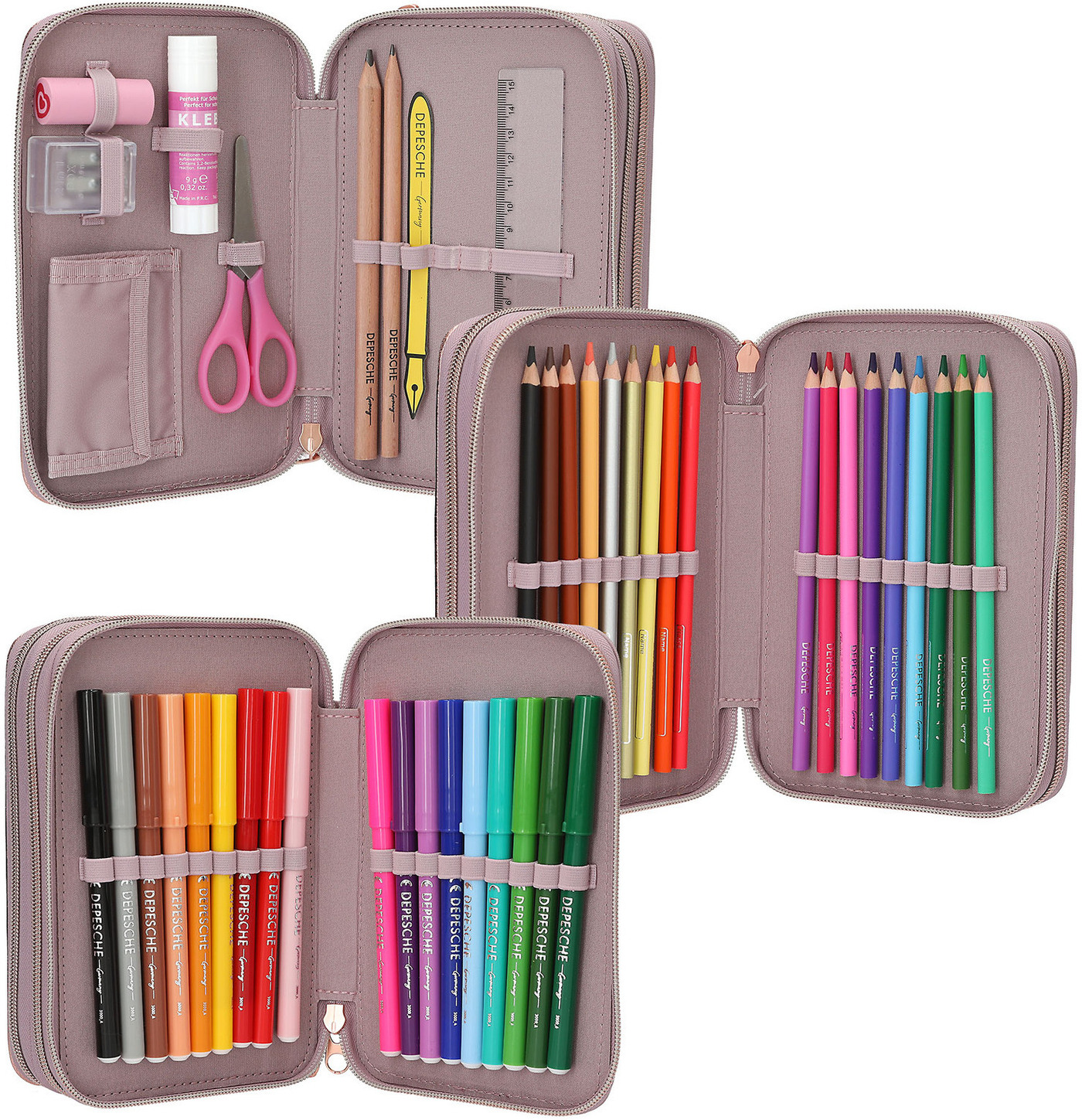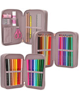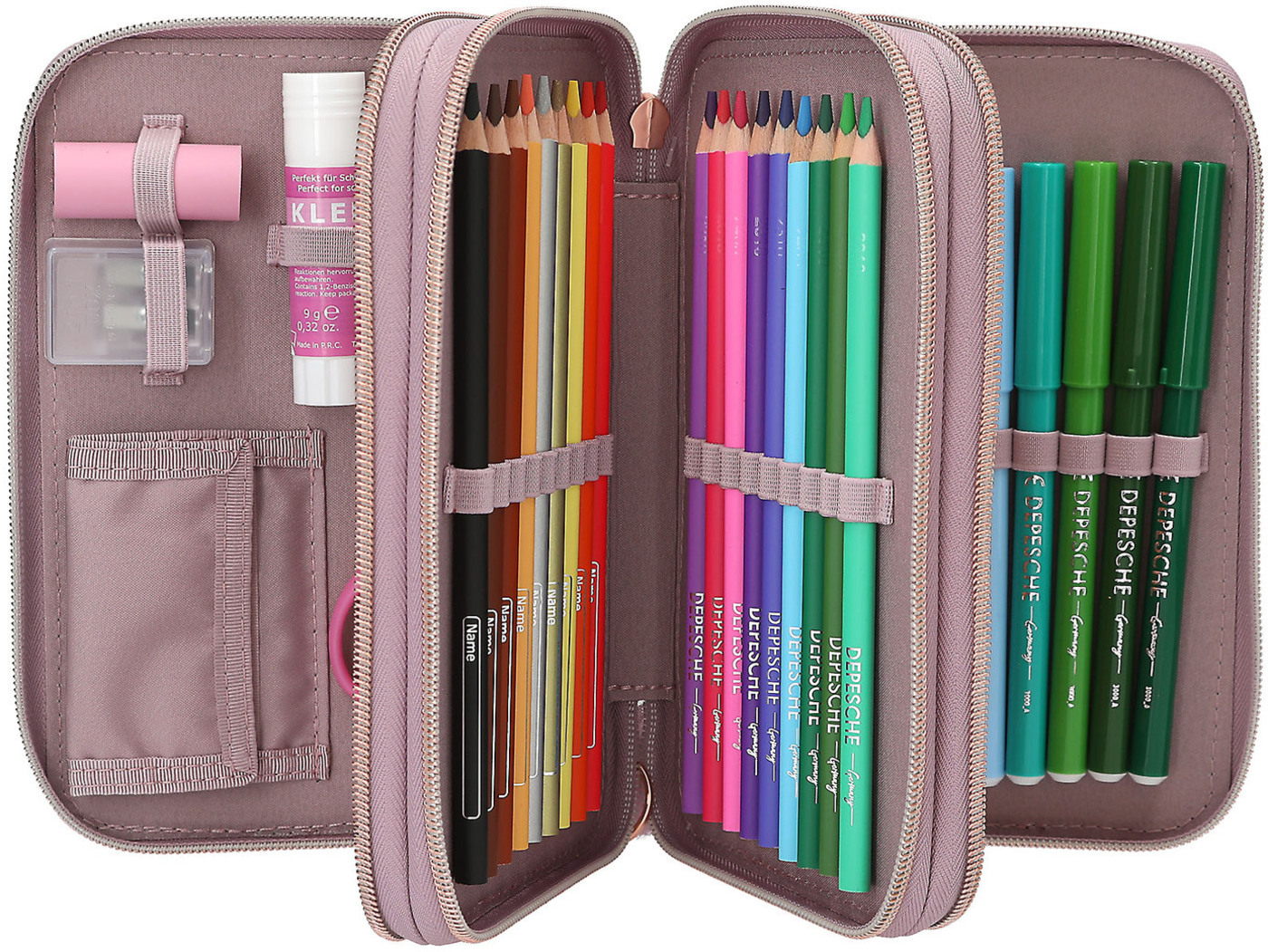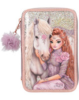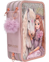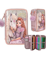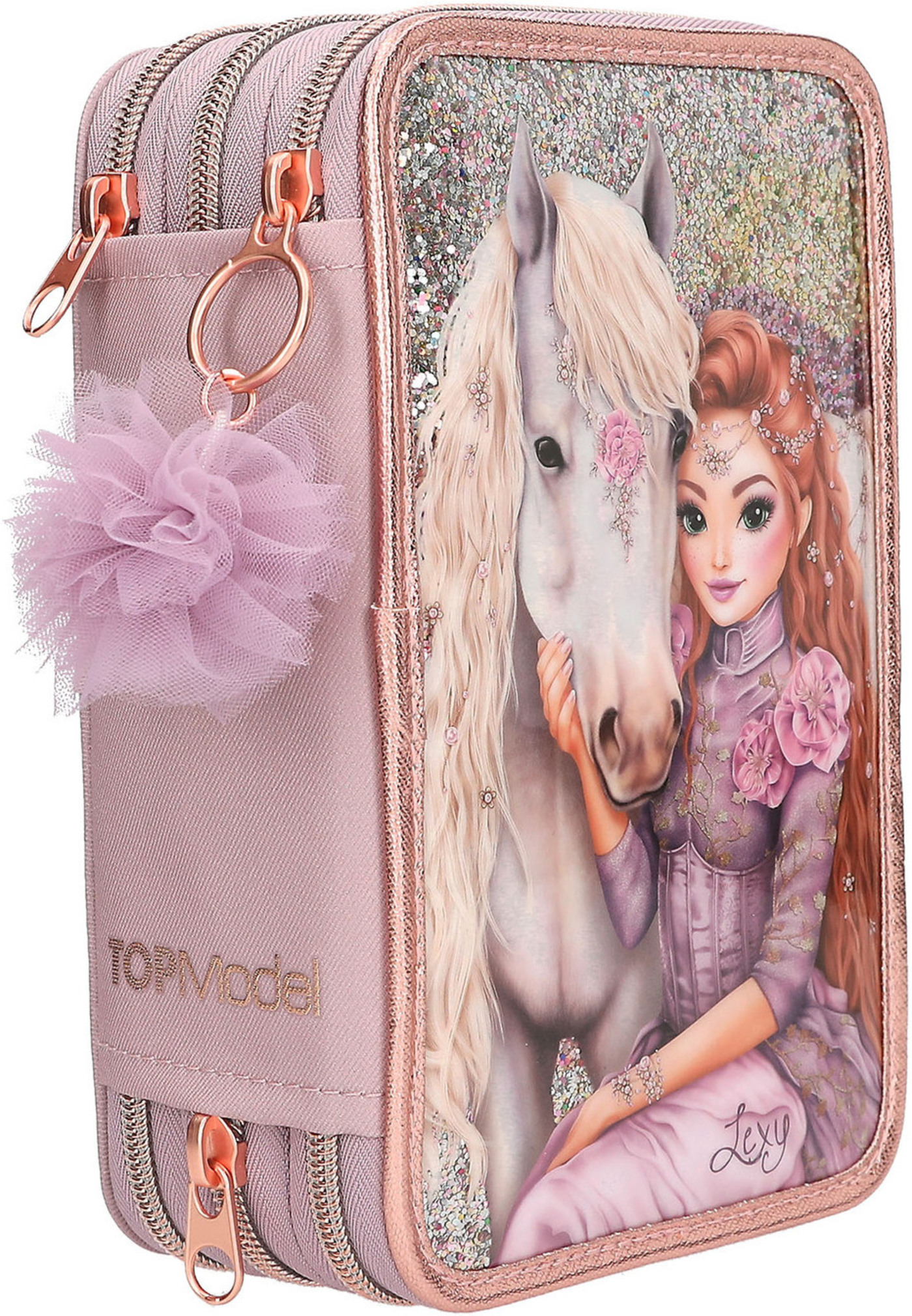 Viva Violet: Die TOPModel-Federtasche in gedecktem Lila hat auf der glitzernden Front ein großes Model-Motiv mit einem wunderschönen Pferd. Am Reißverschluss baumelt ein ausgefallener, blumiger Tüll-Anhänger. Die drei separaten Fächer sind komplett gefüllt mit je 18 Bunt- und Filzstiften, 2 Bleistiften, Radierer, Anspitzer, Lineal, Schere, Klebestift und einem kleinen Klett-Täschchen.