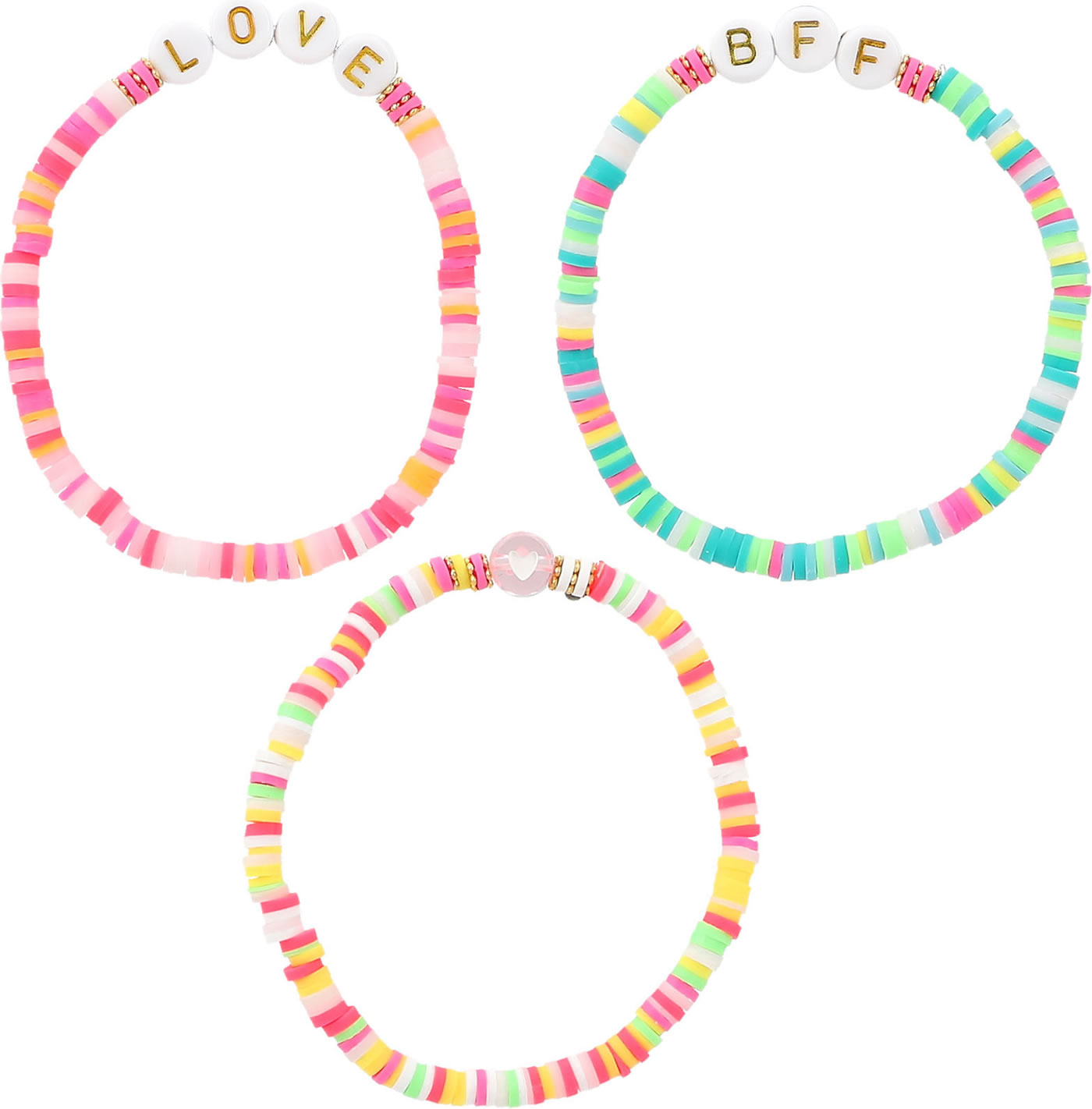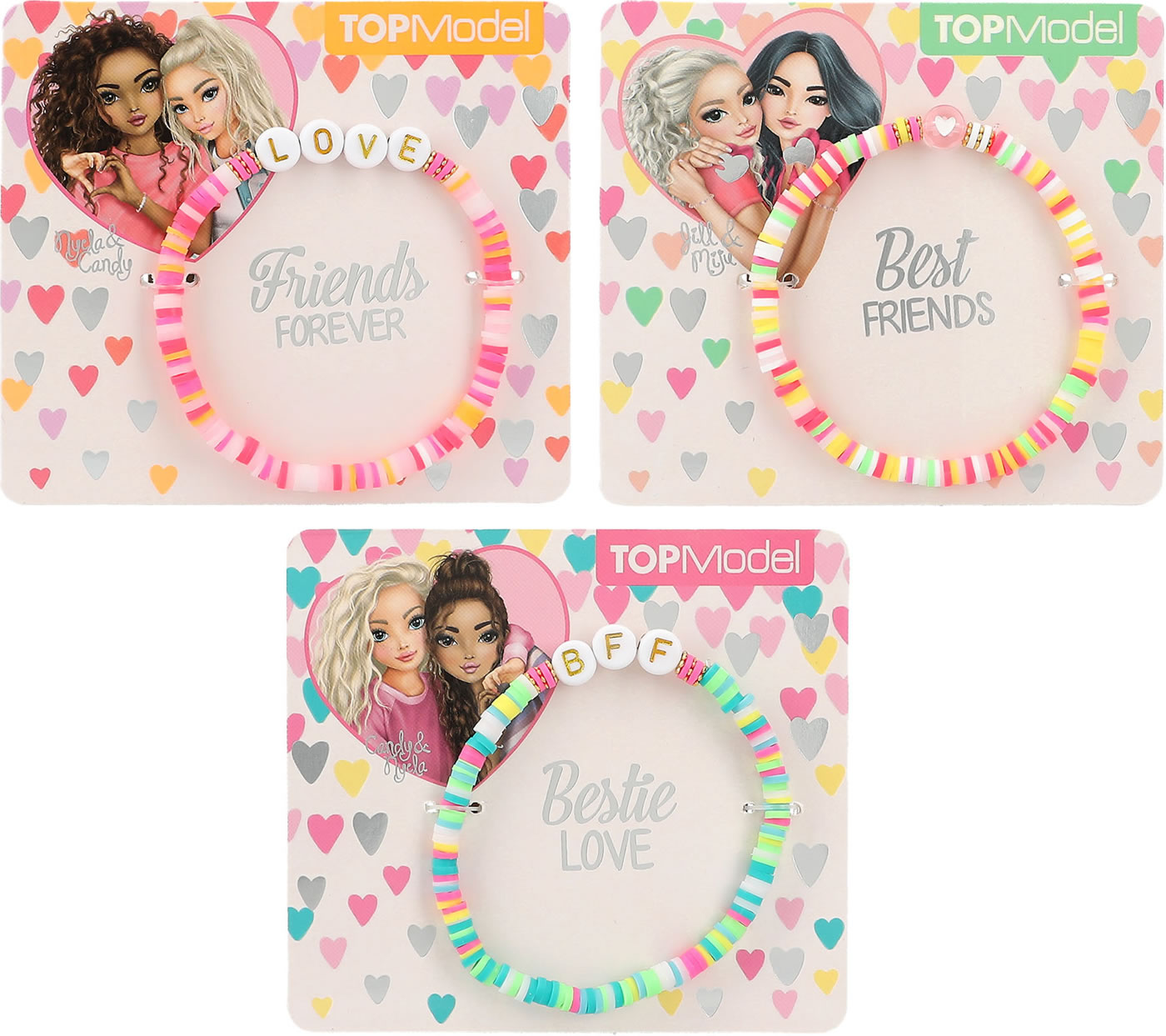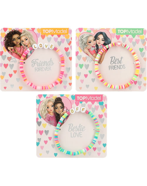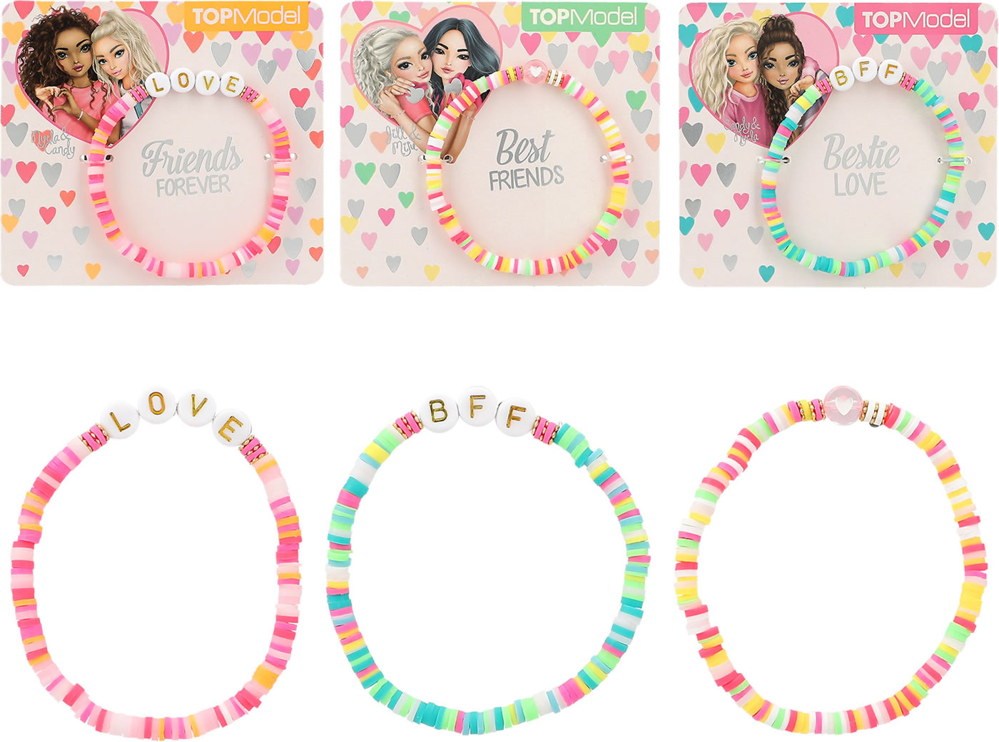 Knallig bunt und fröhlich: Die angesagten TOPModel-Perlenarmbänder haben in der Mitte ein cooles Statement aus Buchstabenperlen (LOVE, BFF) oder ein süßes Zeichen (Herz). Jedes Armband auf einer hübsch illustrierten Geschenkkarte