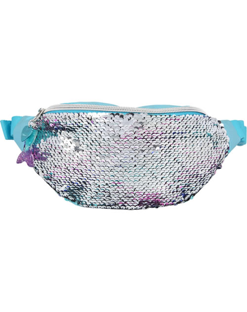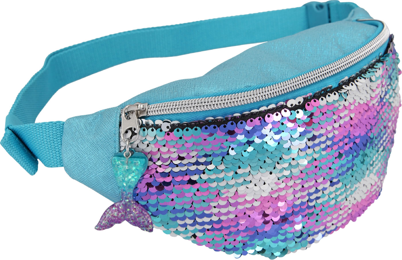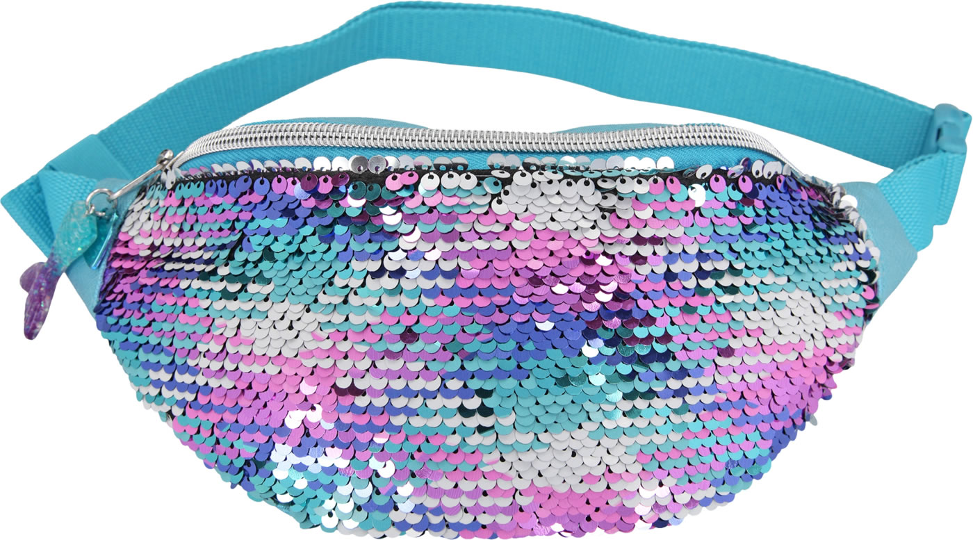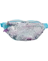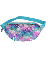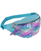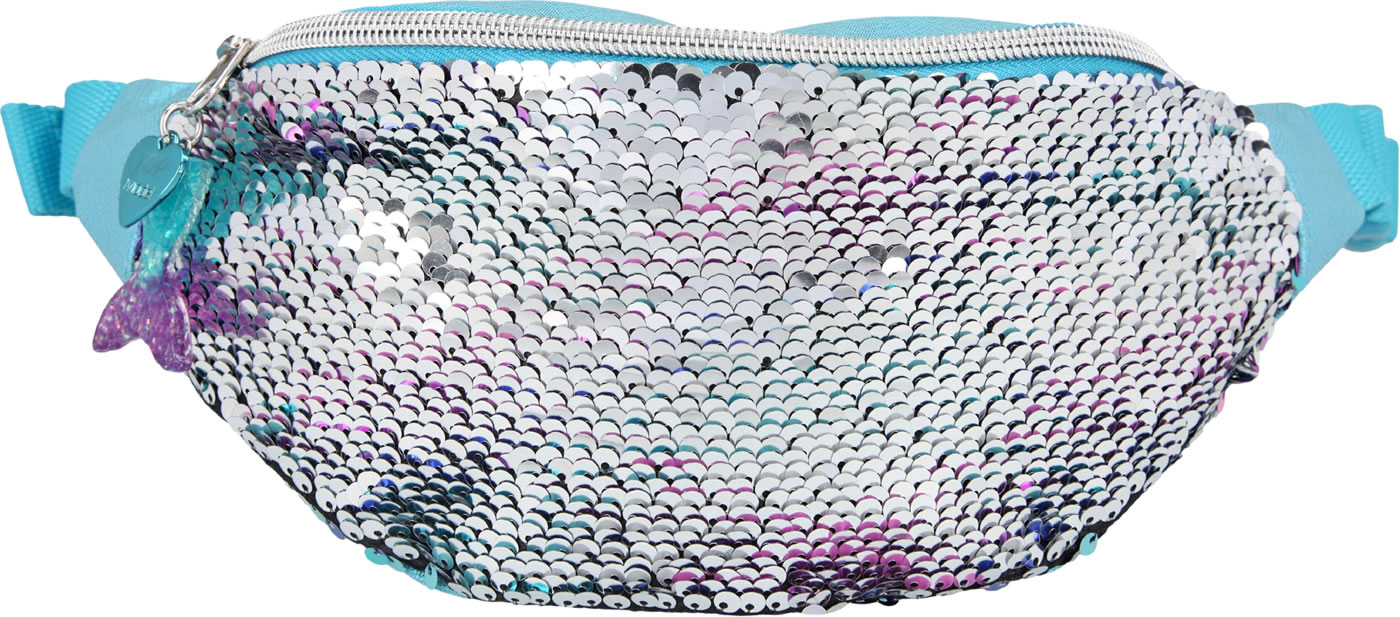 Diese Bauchtasche hat auf der Vorderseite Wende-Pailletten, die wunderschön glänzen und immer wieder verschiedene Muster ergeben. Ein besonderes Detail ist die Glitzer-Flosse am Reißverschluss.