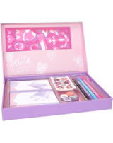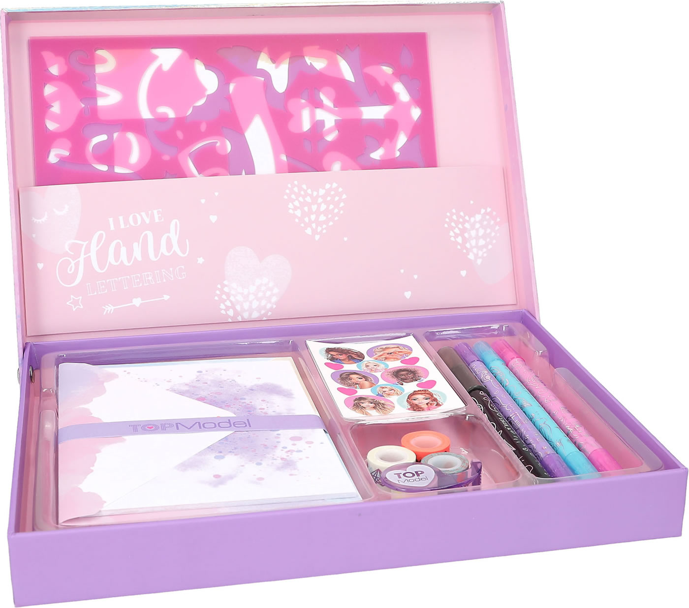 Handlettering ist Trend! In dieser Kreativ-Box von TOPModel findet sich alles, was man für wundschön gestaltete Briefe und Karten braucht: 10 Briefblätter, 3 Stickerbogen (1x Silber-Holo mit Schwarz, 1x Weiß mit Gold-Holo, 1x Models und Herzen), 5 Postkarten, 10 Briefumschläge, 1 Abroller mit 4 hübschen Tape-Rollen, 4 Stifte (3 Doppelfasermaler in Lila, Türkis und Rosa, 1 Magic Handlettering Stift), 2 Schablonen und 1 Büchlein mit einfachen Gestaltungs-Anleitungen