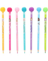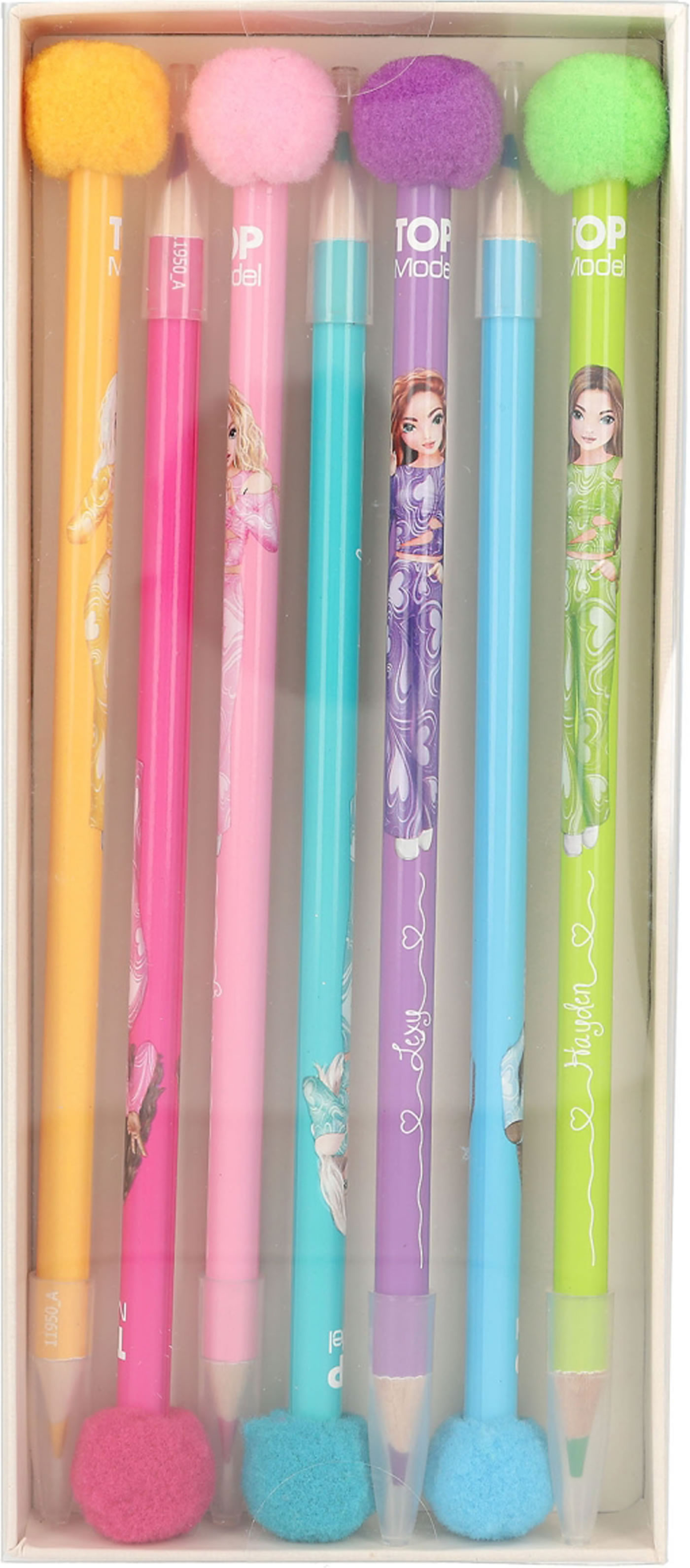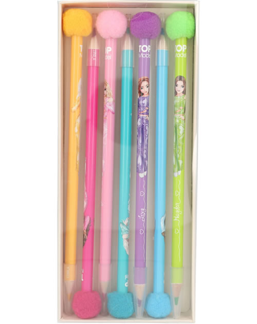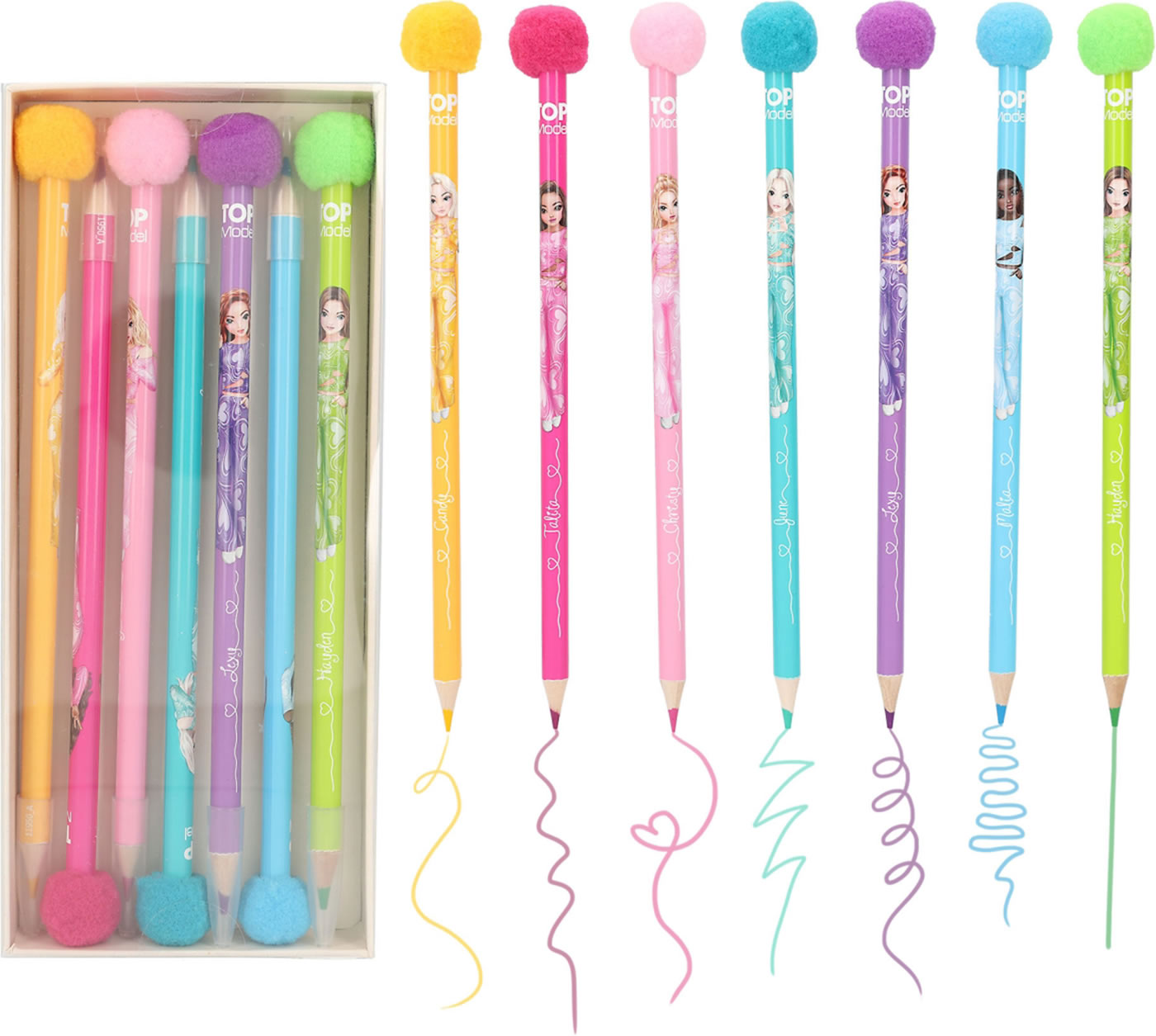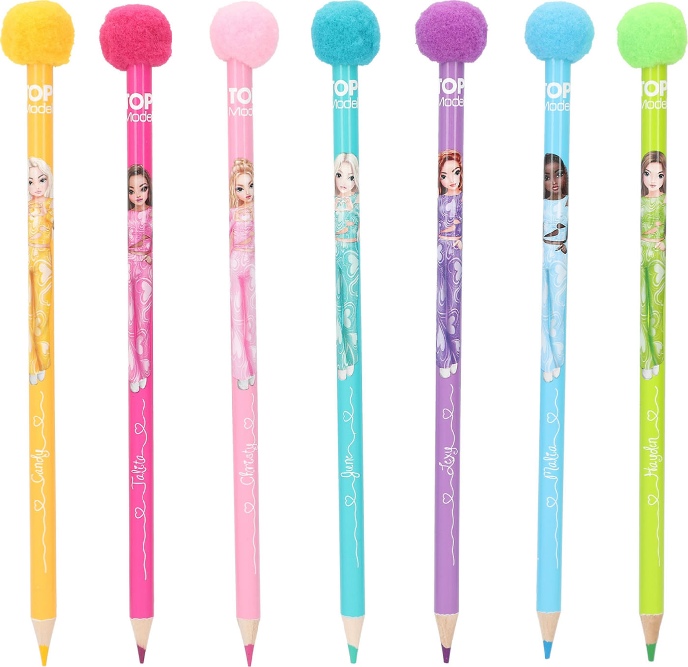 Hier ist jeder Stift ein Pompon-Highlight! Und jede Farbe hat ein anderes Model-Print: Gelb mit Candy, Pink mit Talita, Rosa mit Christy, Türkis mit June, Lila mit Lexy, Blau mit Malia und Grün mit Hayden.