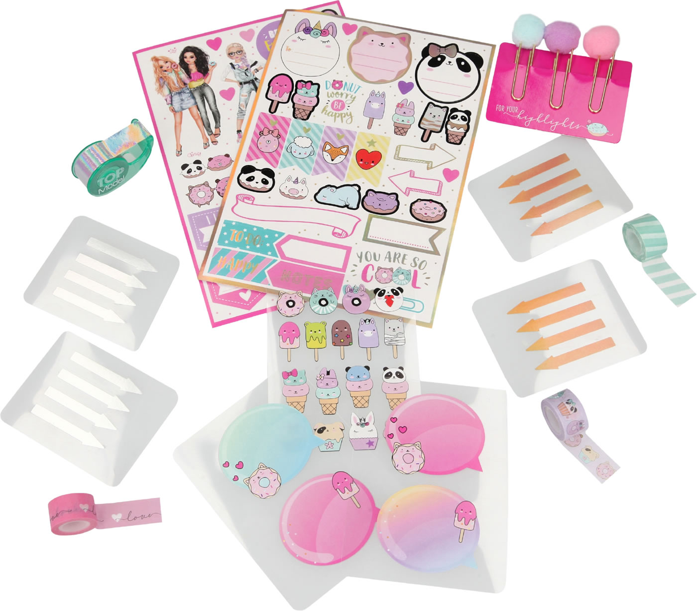 Mit dabei: 3 Deko-Tapes, 1 Abroller, 3 große Büroklammern mit niedlichen Bommeln und jede Menge Sticker zum gestalterischen Austoben. Ein Heft mit Anleitungen und Anregungen ist auch dabei.