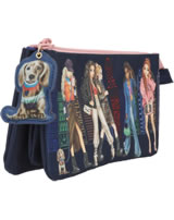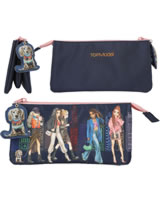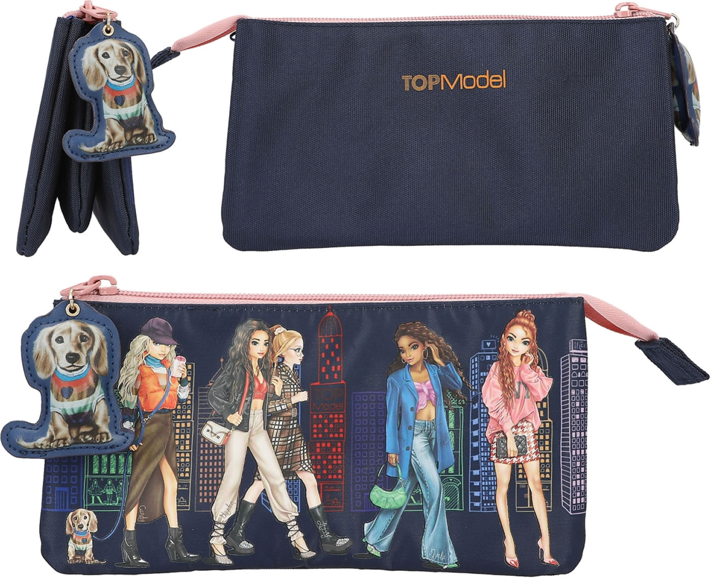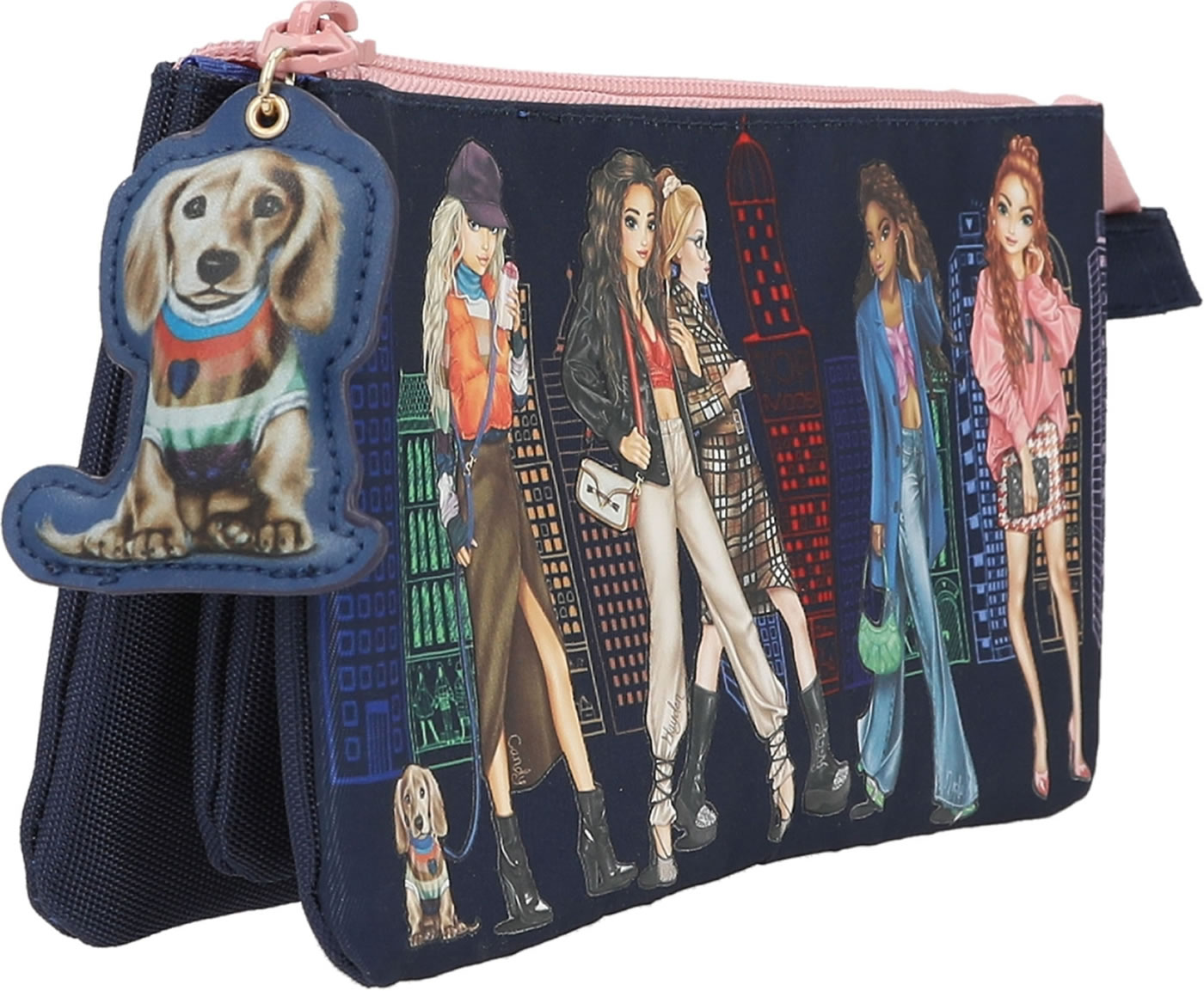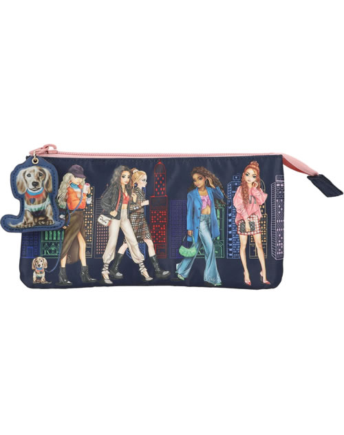 Cooler City-Style: Die Fächer-Schlampertasche von TOPModel hat eine bunt illustrierte Skyline und ein 6er-Model-Motiv aufgedruckt, das vor dem dunkelblauen Hintergrund zu strahlen scheint. Tolle Akzente: die zwei Reißverschlüsse in Rosa und der niedliche Hunde-Anhänger. In den drei Fächern der Schlampertasche ist viel Platz für Stifte & Co.