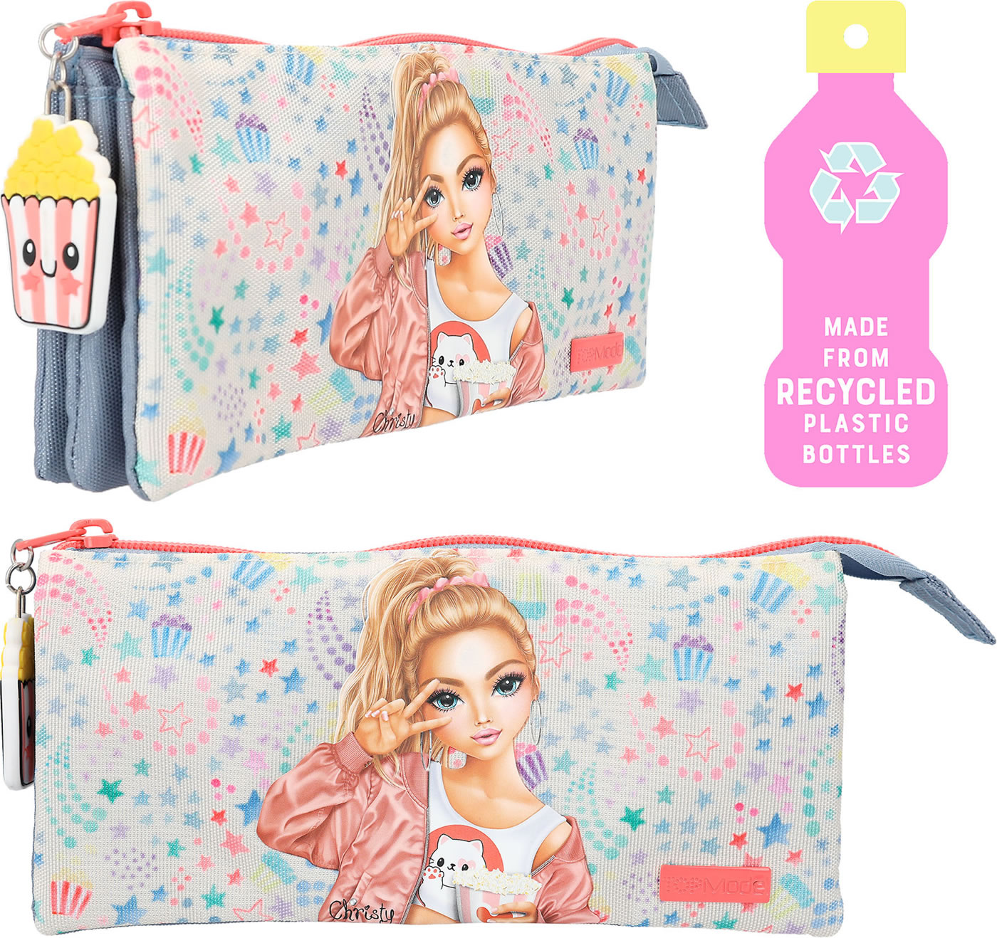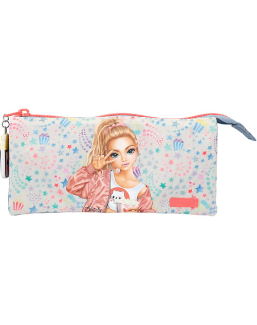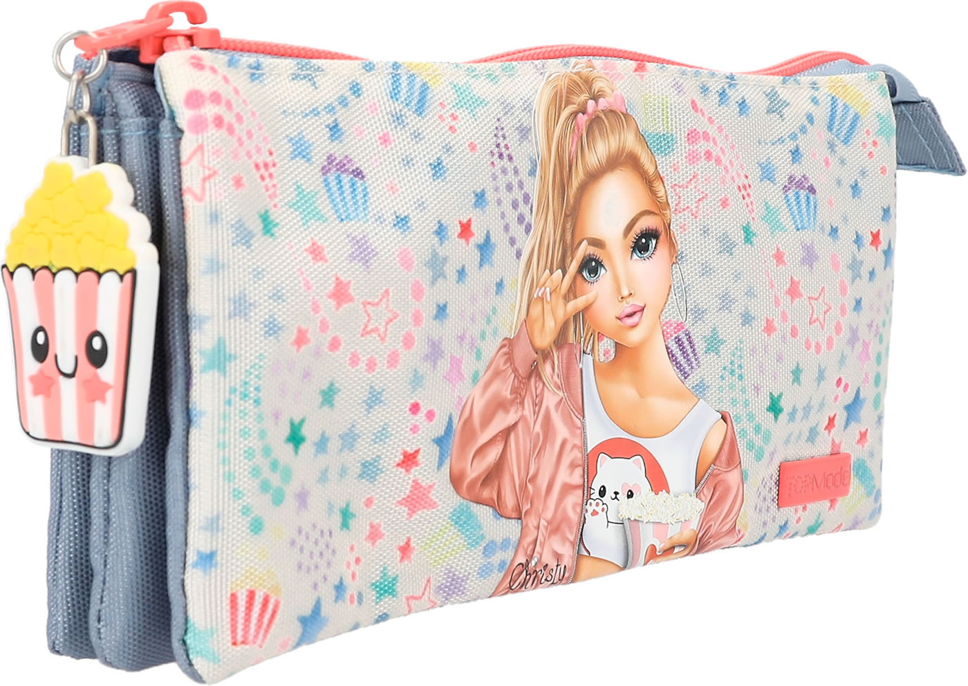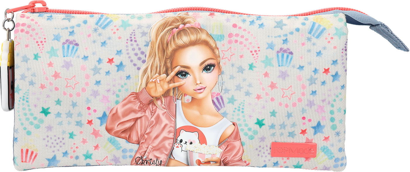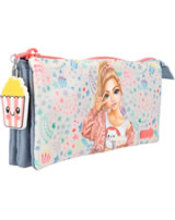 Die Schlampertasche, die gute Laune macht: fröhlich-buntem Allover-Muster, XL-TOPModel-Print auf der Frontseite, im stylishem Jeans-Blau, und superniedlichem Popcorn-Anhänger am Reißverschluss. In den 3 separaten Fächern mit 2 Reißverschlüssen ist viel Platz für Stifte & Co.