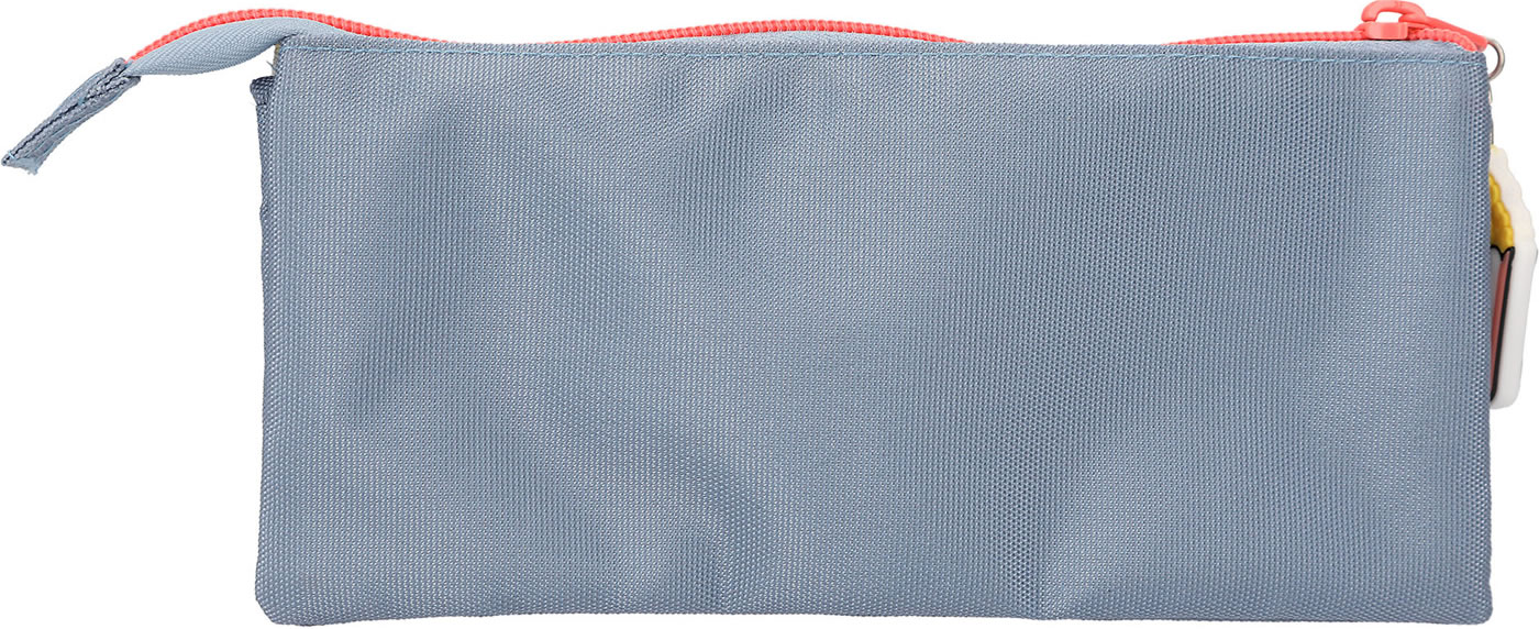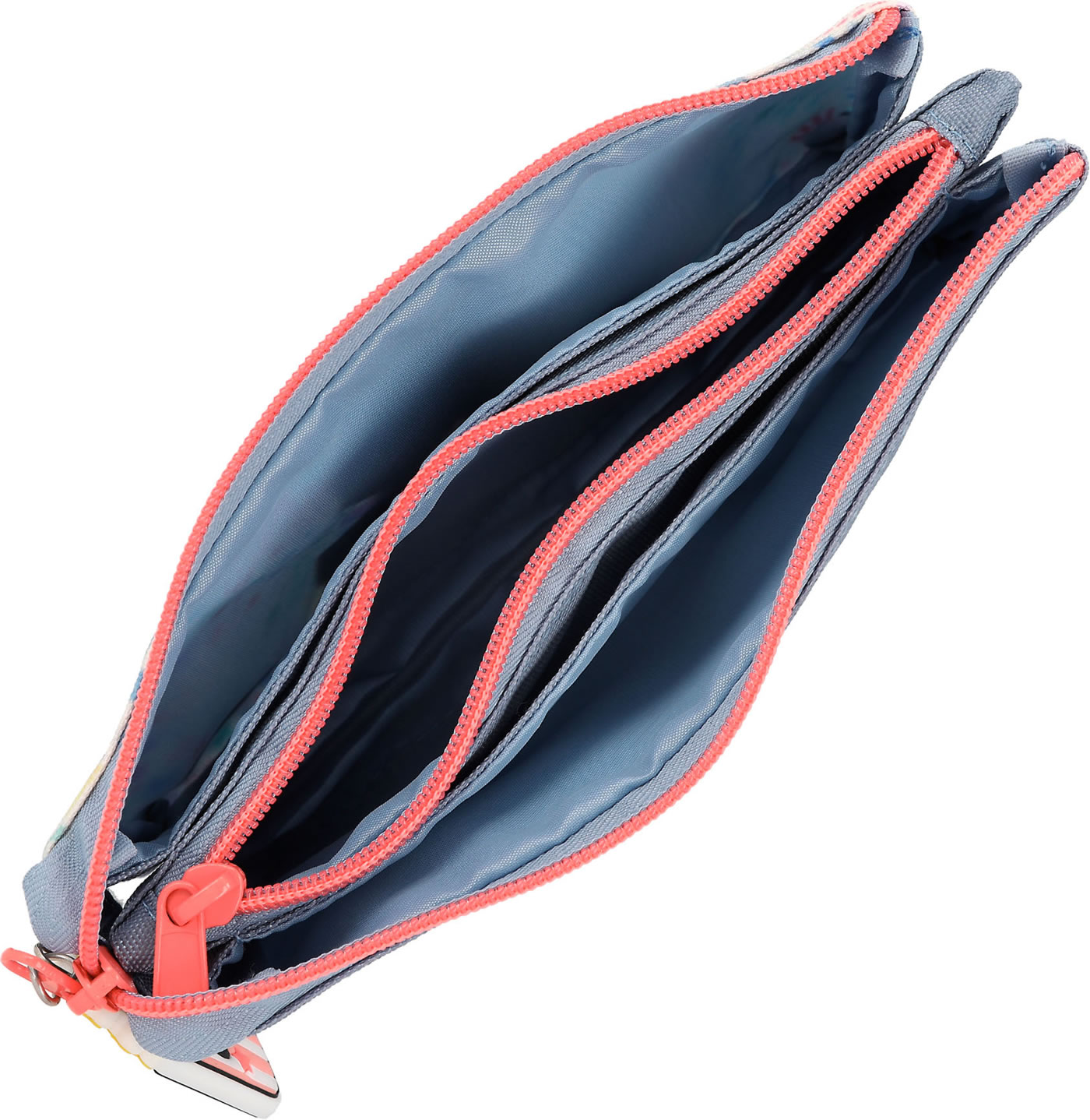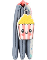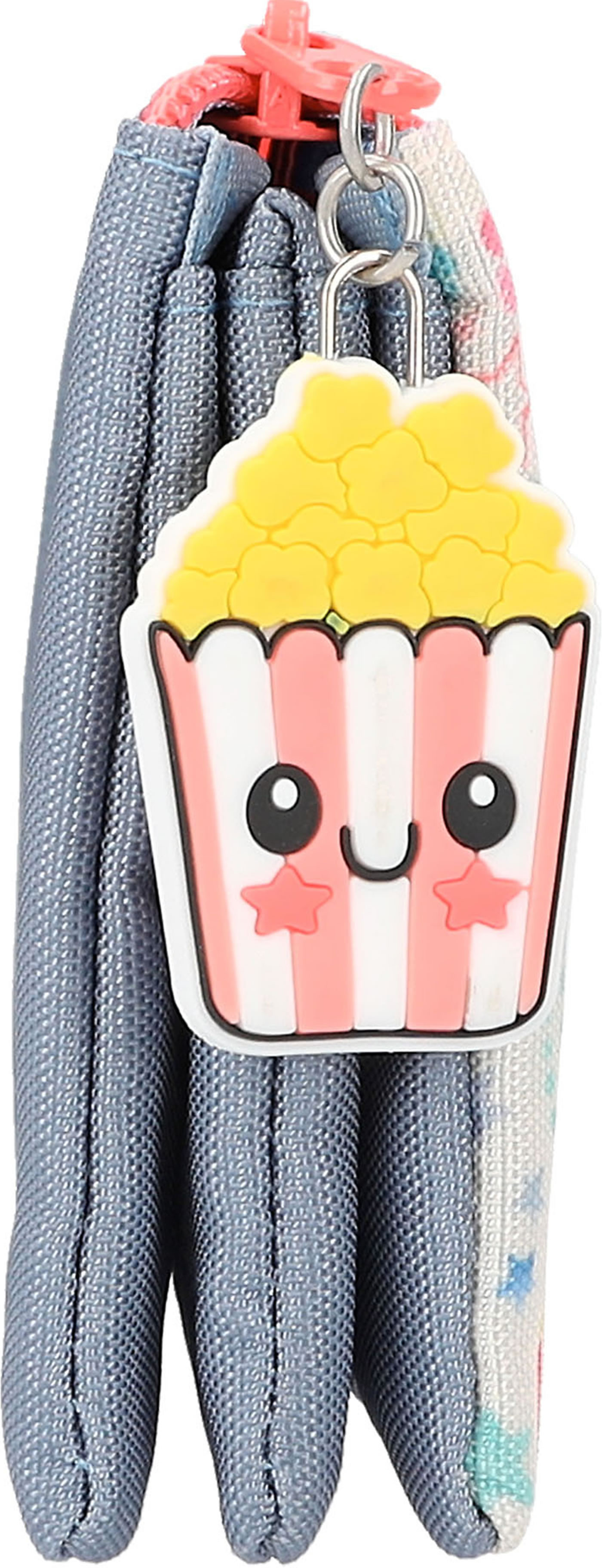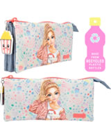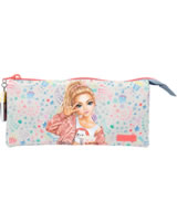 Die Schlampertasche, die gute Laune macht: fröhlich-buntem Allover-Muster, XL-TOPModel-Print auf der Frontseite, im stylishem Jeans-Blau, und superniedlichem Popcorn-Anhänger am Reißverschluss. In den 3 separaten Fächern mit 2 Reißverschlüssen ist viel Platz für Stifte & Co.