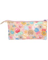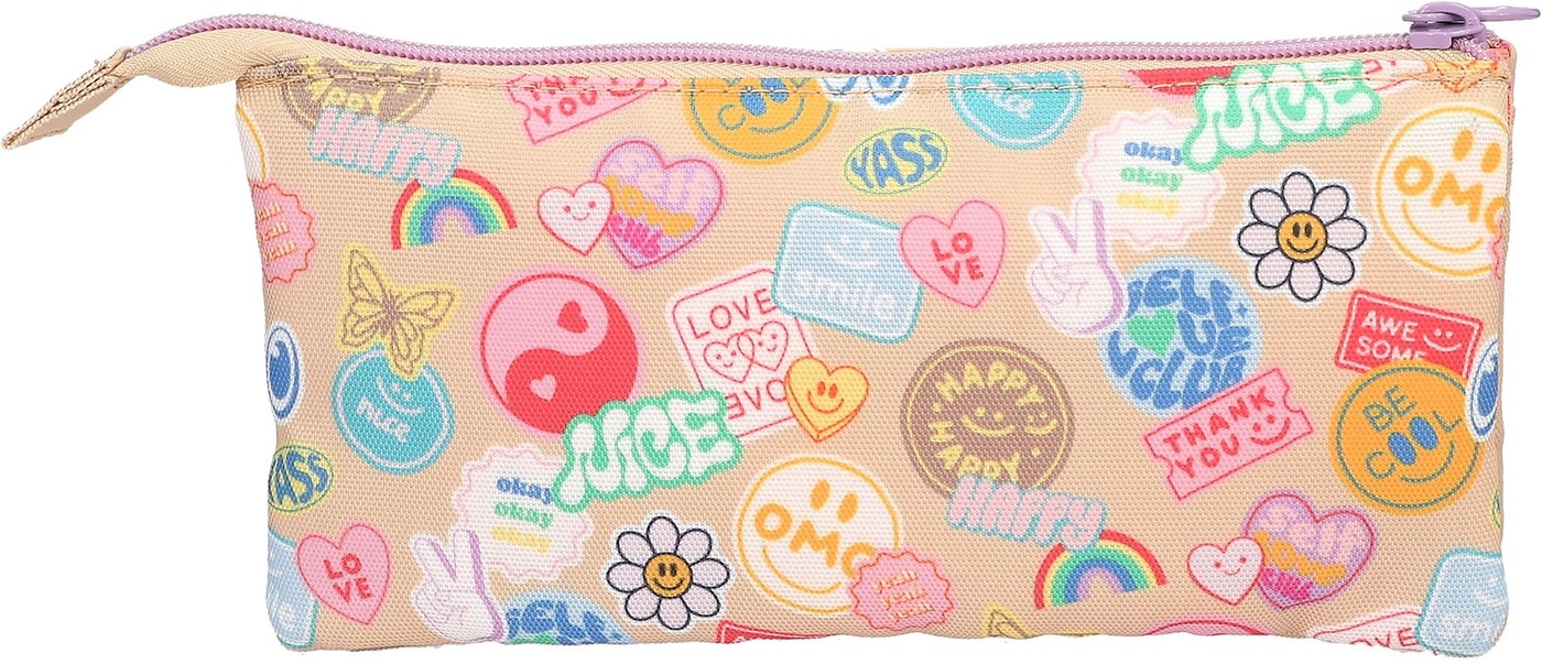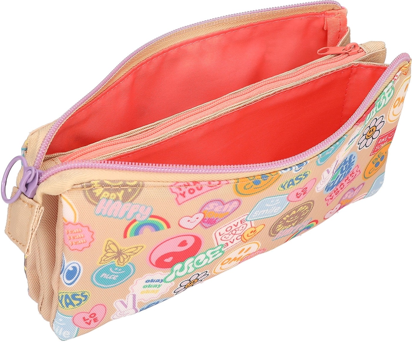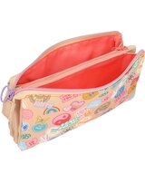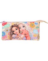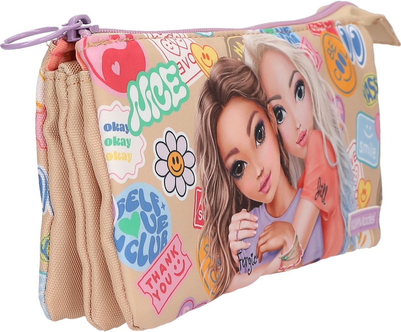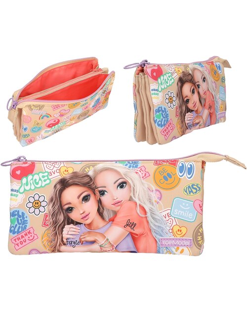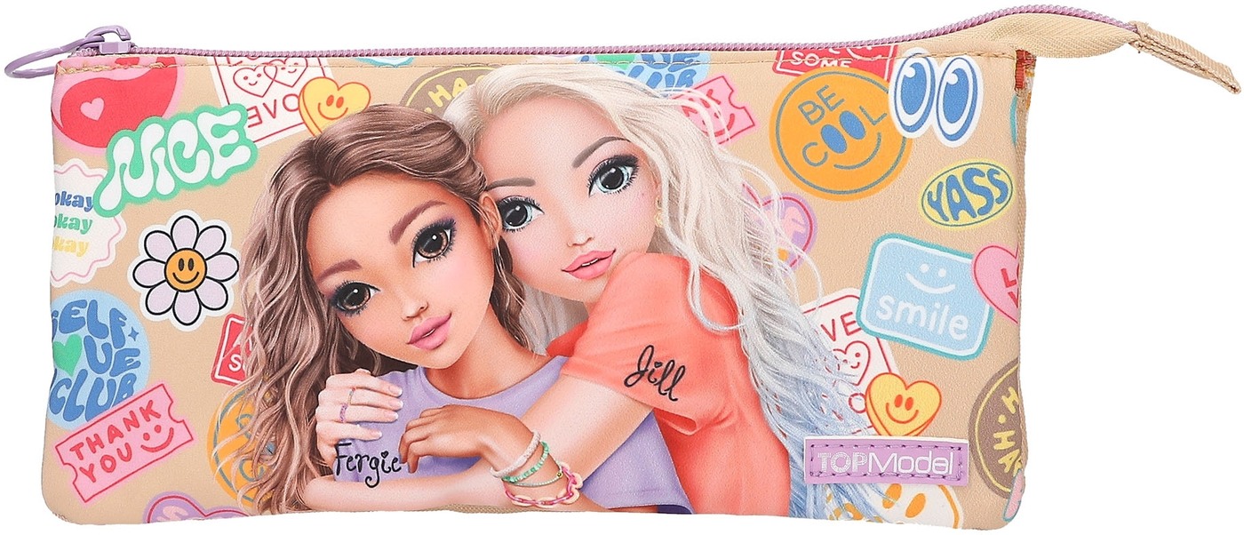 Batch-Boom! Die beigefarbene TOPModel-Schlampertasche hat auf der Front ein tolles Doppel-Modelmotiv und rundherum coole bunte Batch-Prints. Die drei Innenfächer haben korallenfarbenes Futter, das mittlere Innenfach hat einen zusätzlichen Reißverschluss.
