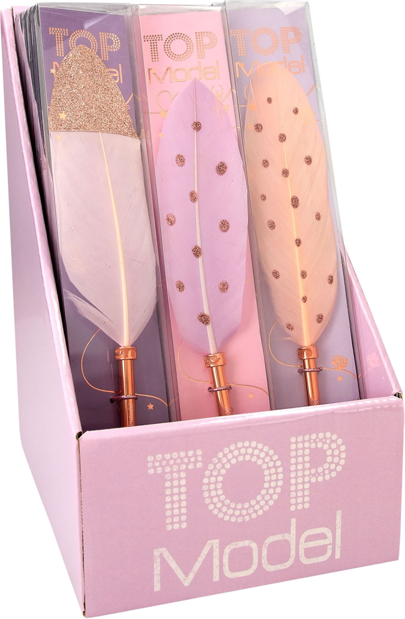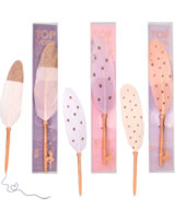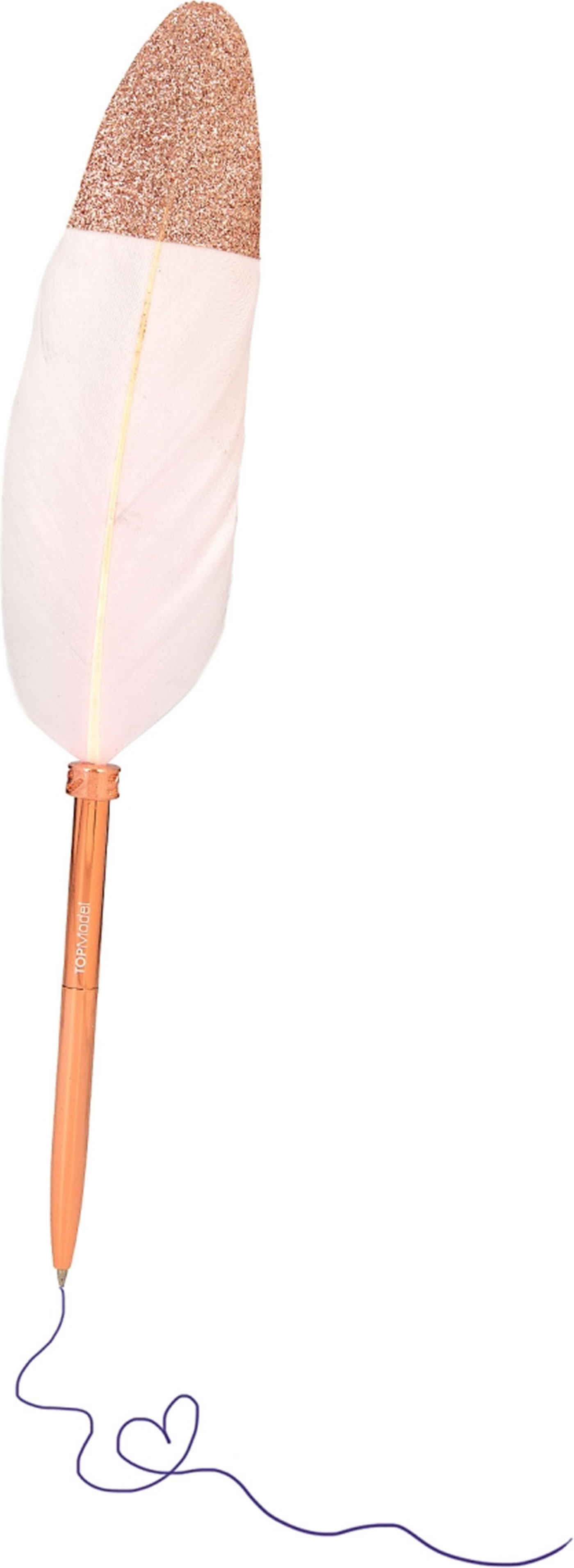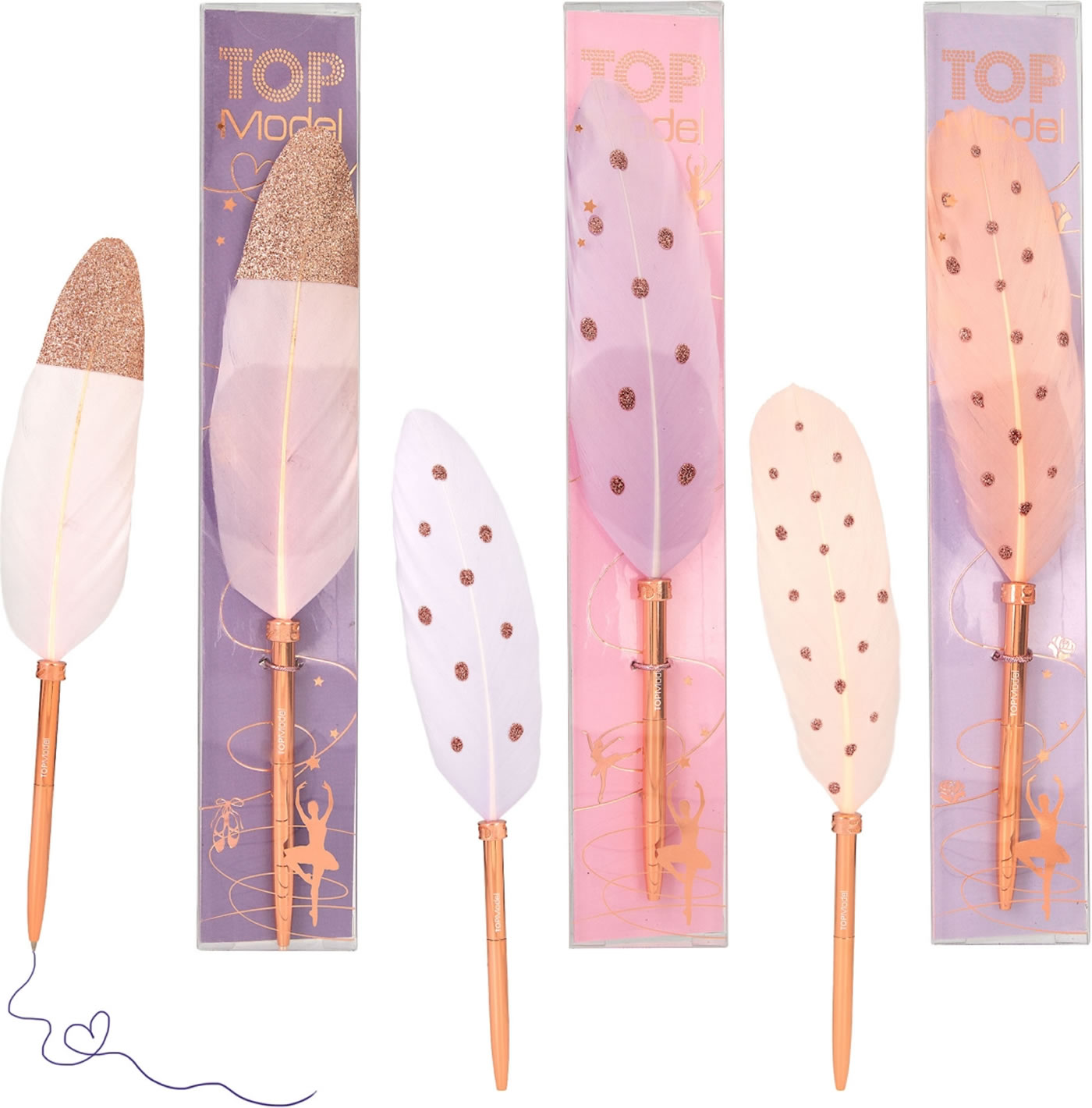Traumhaft schön schreiben mit den Feder-Kugelschreibern von TOPModel. Die goldenen Stift-Schäfte haben einen kleinen Logo-Druck und die Federn in pudrigem Rosé, Lila und Apricot haben zarte Glitzer-Details in Roségold.