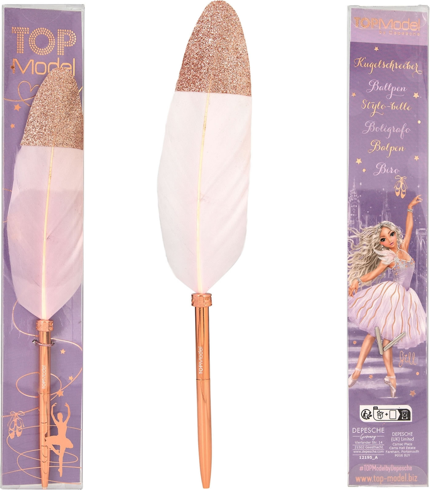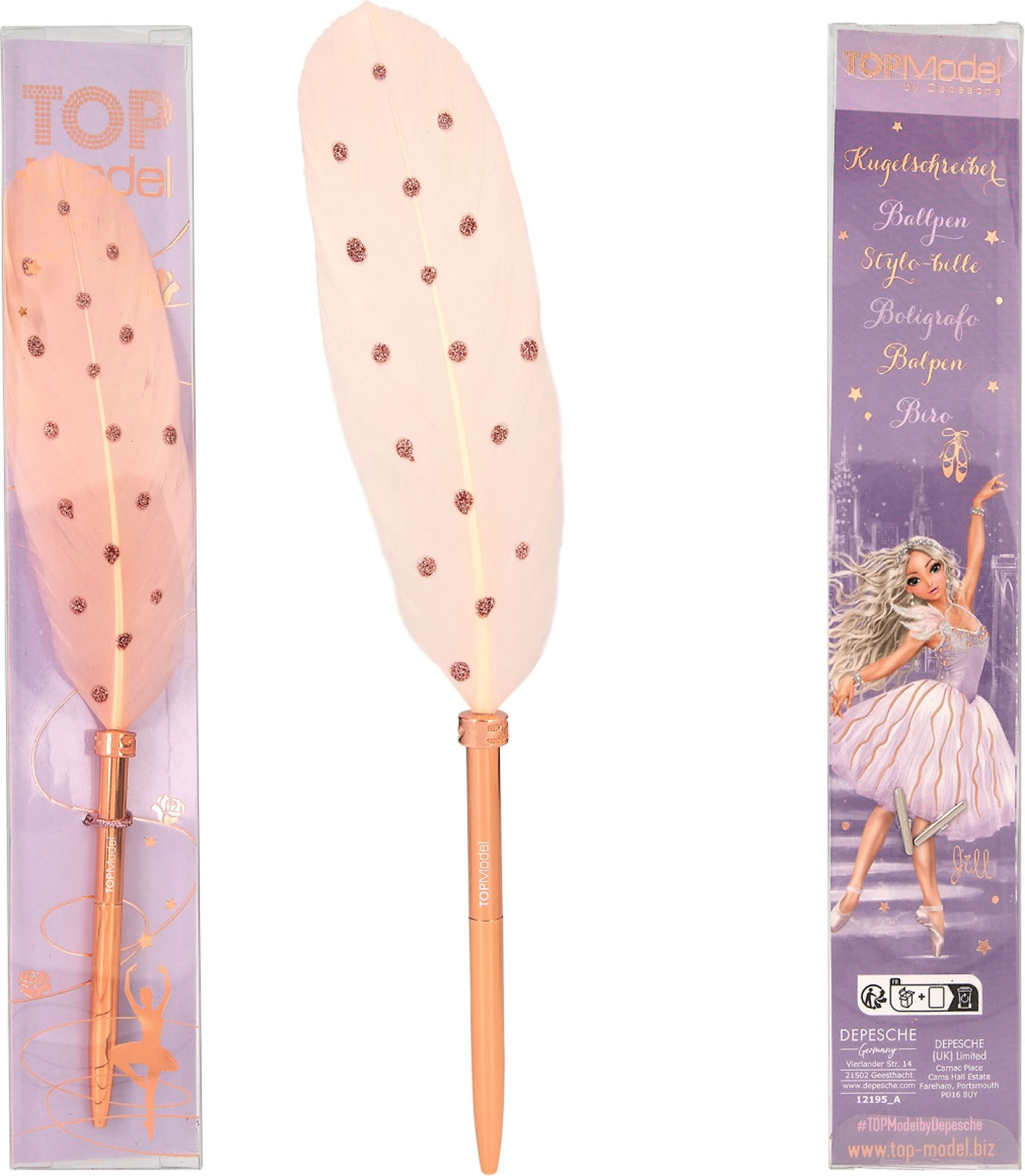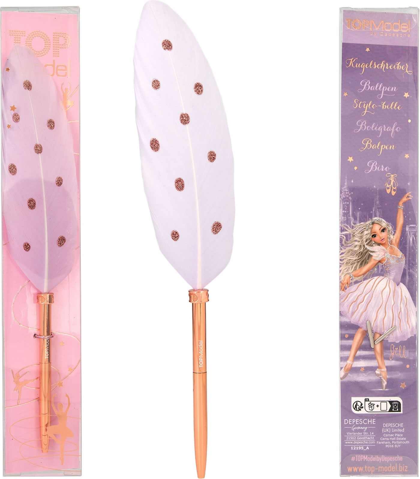 Traumhaft schön schreiben mit den Feder-Kugelschreibern von TOPModel. Die goldenen Stift-Schäfte haben einen kleinen Logo-Druck und die Federn in pudrigem Rosé, Lila und Apricot haben zarte Glitzer-Details in Roségold.