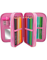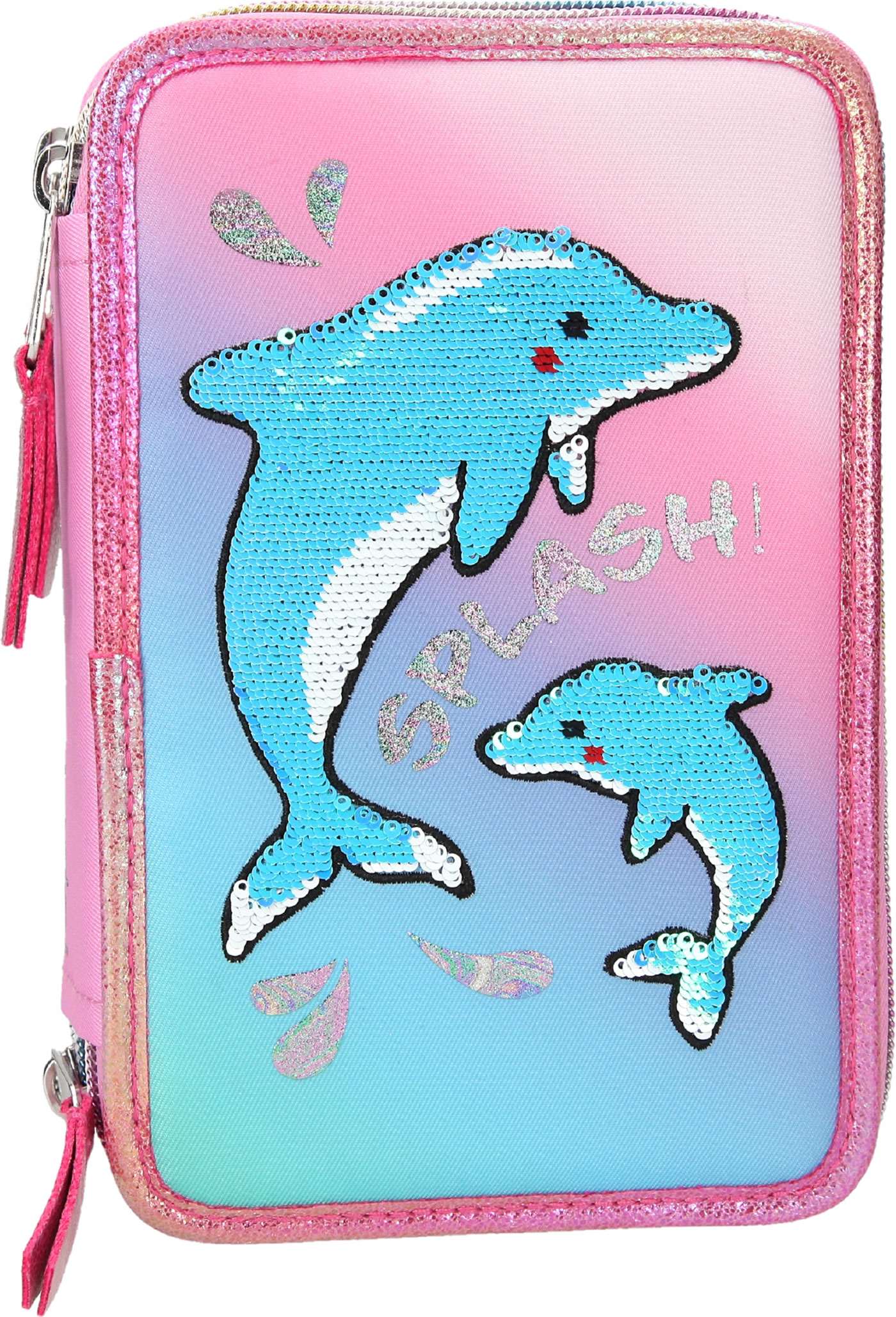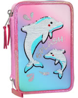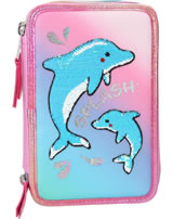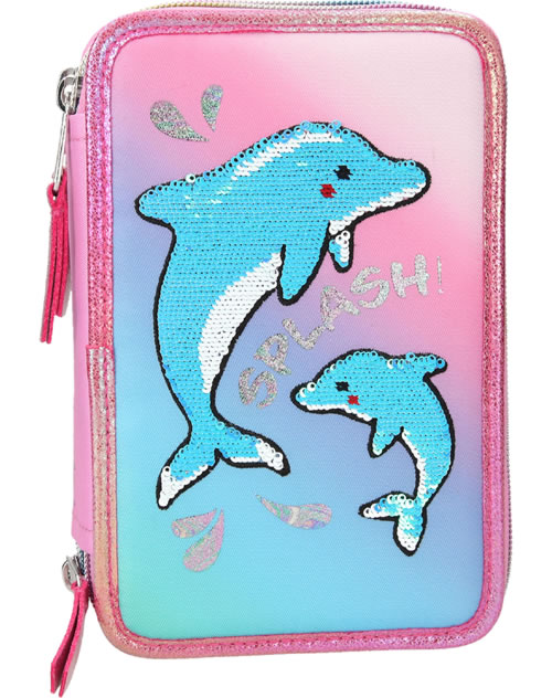 Splish Splash! Putzige Delfine mit Streichpailletten auf Farbverlauf, moderne Druckdetails im irisierenden Multicolor - all das bietet die 3fach Federtasche. Gefüllt mit Lineal, Schere, Klebestift, 2 Bleitiften, Radierer, Anspitzer, 18 Bunt- & Filstiften.