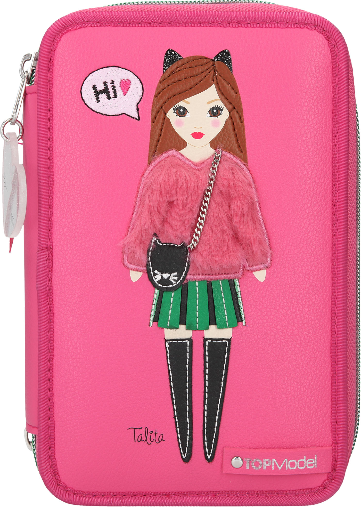 TOPModel Talita befindet sich als Applikation auf der Vorderseite. Mit ihrem Kuschelpulli und der echten Kette für ihre Handtasche ist sie ein Blickfang.
