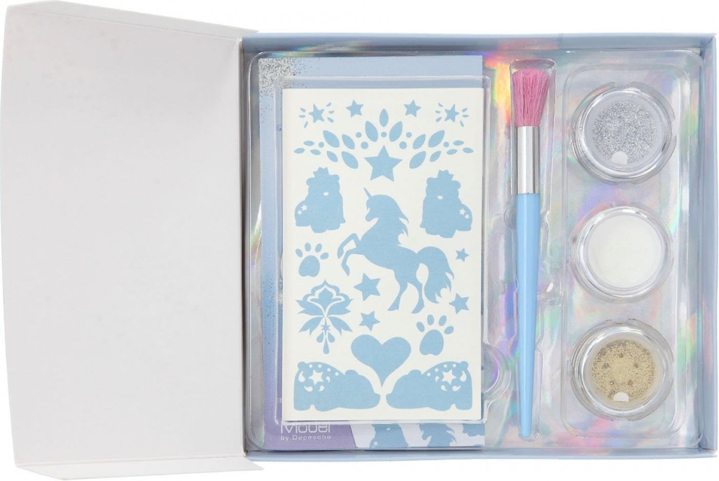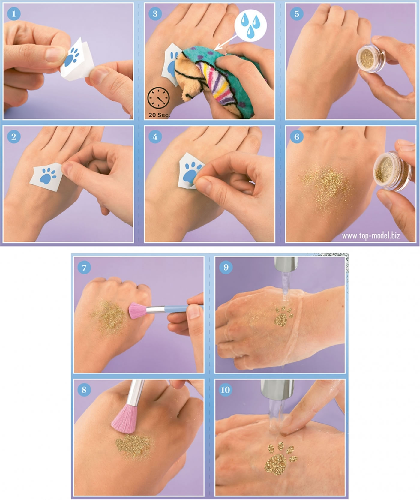 Inhalt: 43 Tattoo Schablonen, 3 Glitzer-Puder, 1 Pinsel, 1 Anleitung