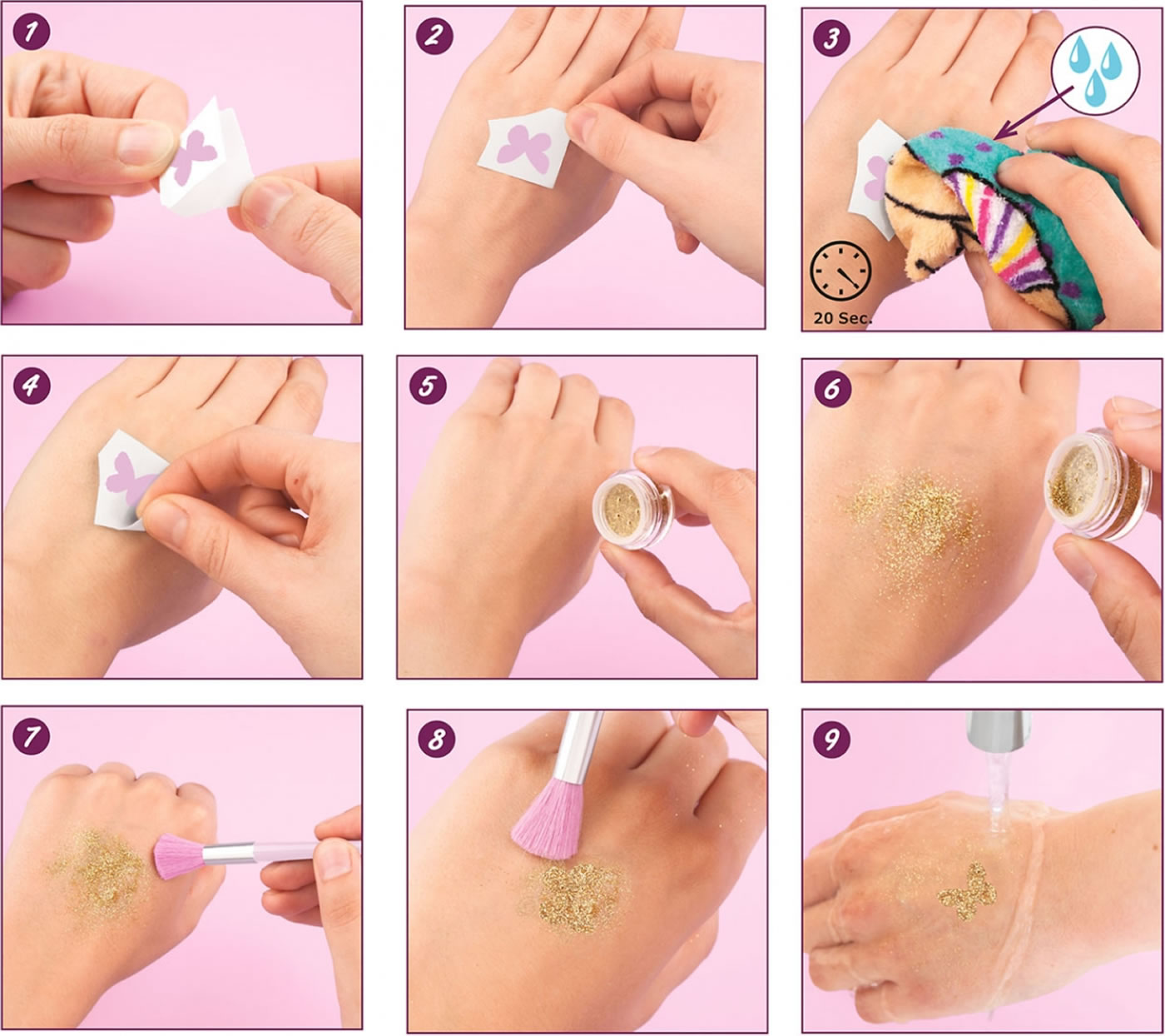 Wähle aus 49 Motiven und drei Glitzer-Pudern - und zaubere funkelnde Hingucker auf deine Haut.