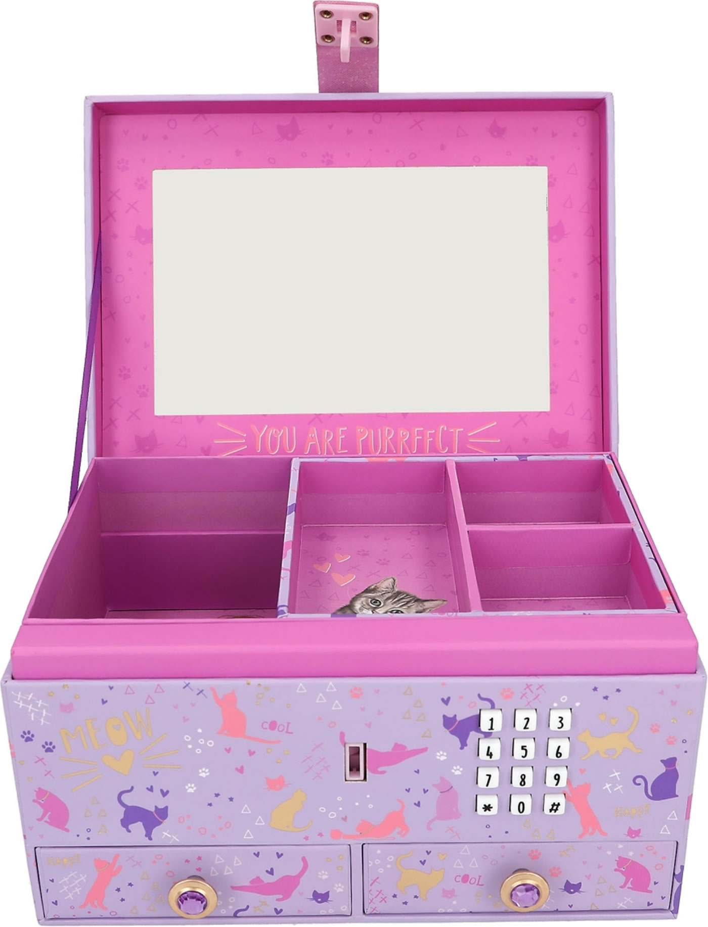 Für kleine Kostbarkeiten und Geheimnisse: Das Schloss des Schmuckkästchens von TOPModel öffnet sich nur, wenn der richtige vierstellige Code (persönlich einstellbar) eingegeben wird. Dann ertönt außerdem der Top-Hit Shivers für ca. 20 Sekunden. Außen in wunderschönen Lila- und Pinktönen, mit niedlichen Kätzchen sowie einem stylishen Doppel-Model-Motiv. Innen hat das Schmuckkästchen einen Spiegel im Klappdeckel, ein herausnehmbares Inlay mit drei Fächern sowie zwei Schubladen mit Schmucksteinen am Griff-Knopf.