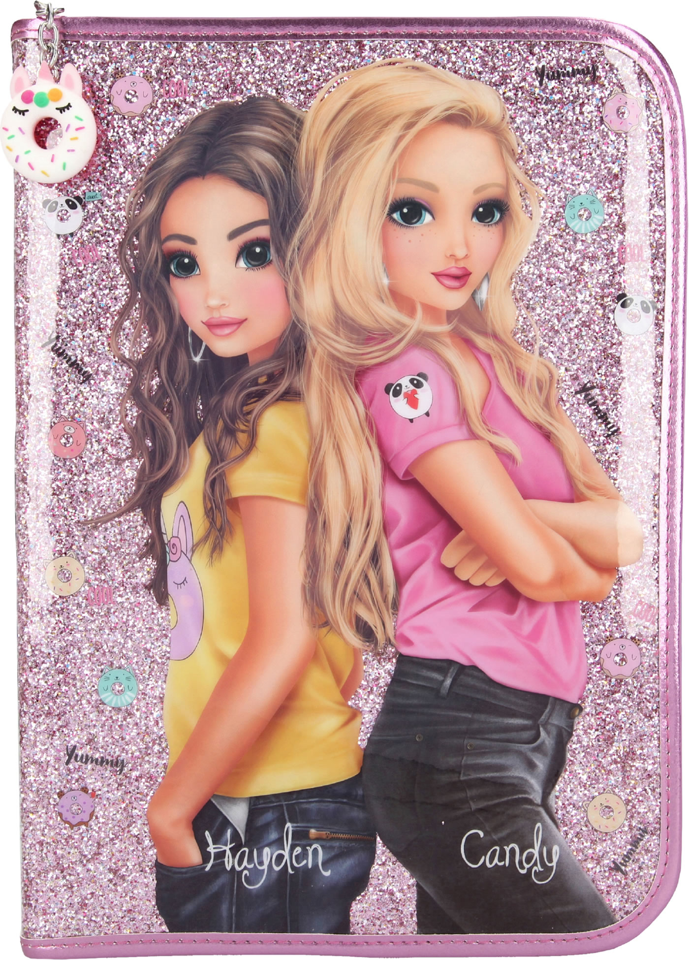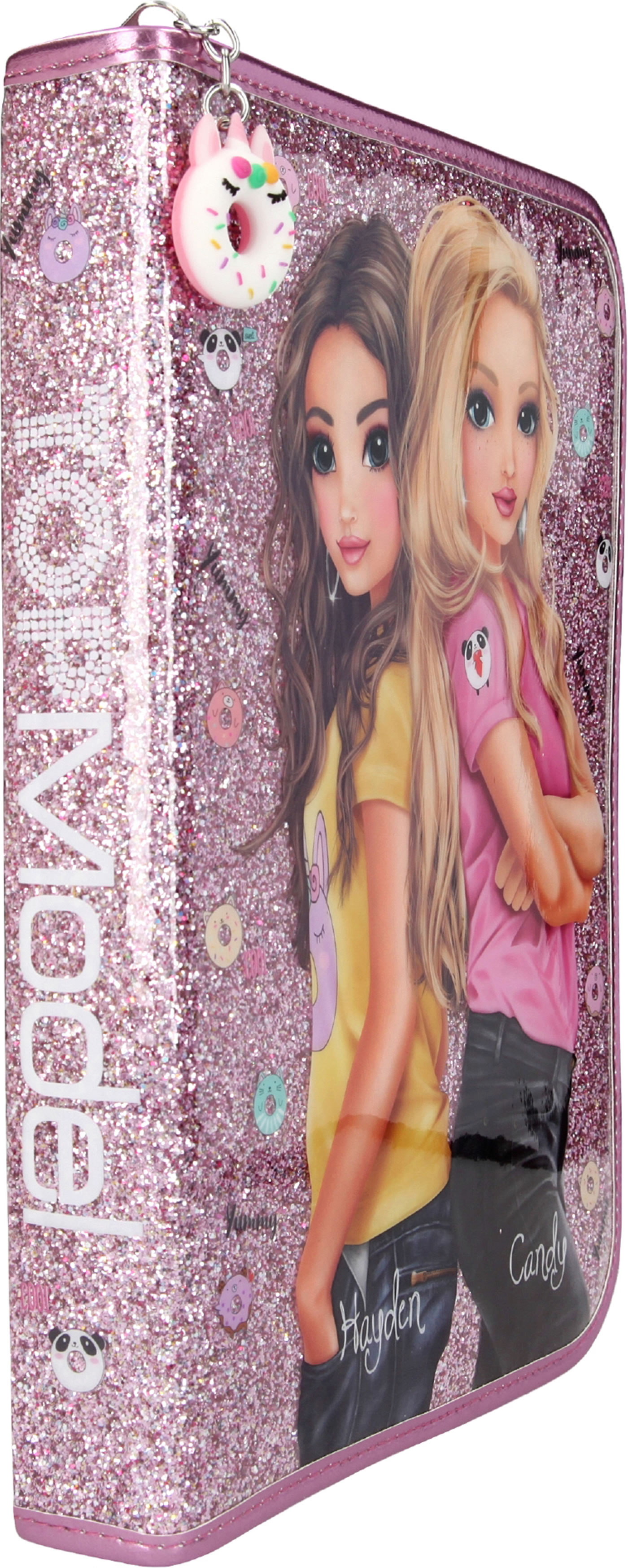 Ein Hingucker ist die glitzernde Vorderseite mit den beiden TOPModel Hayden und Candy und ein besonderes Detail ist der Donut am Reißverschluss.