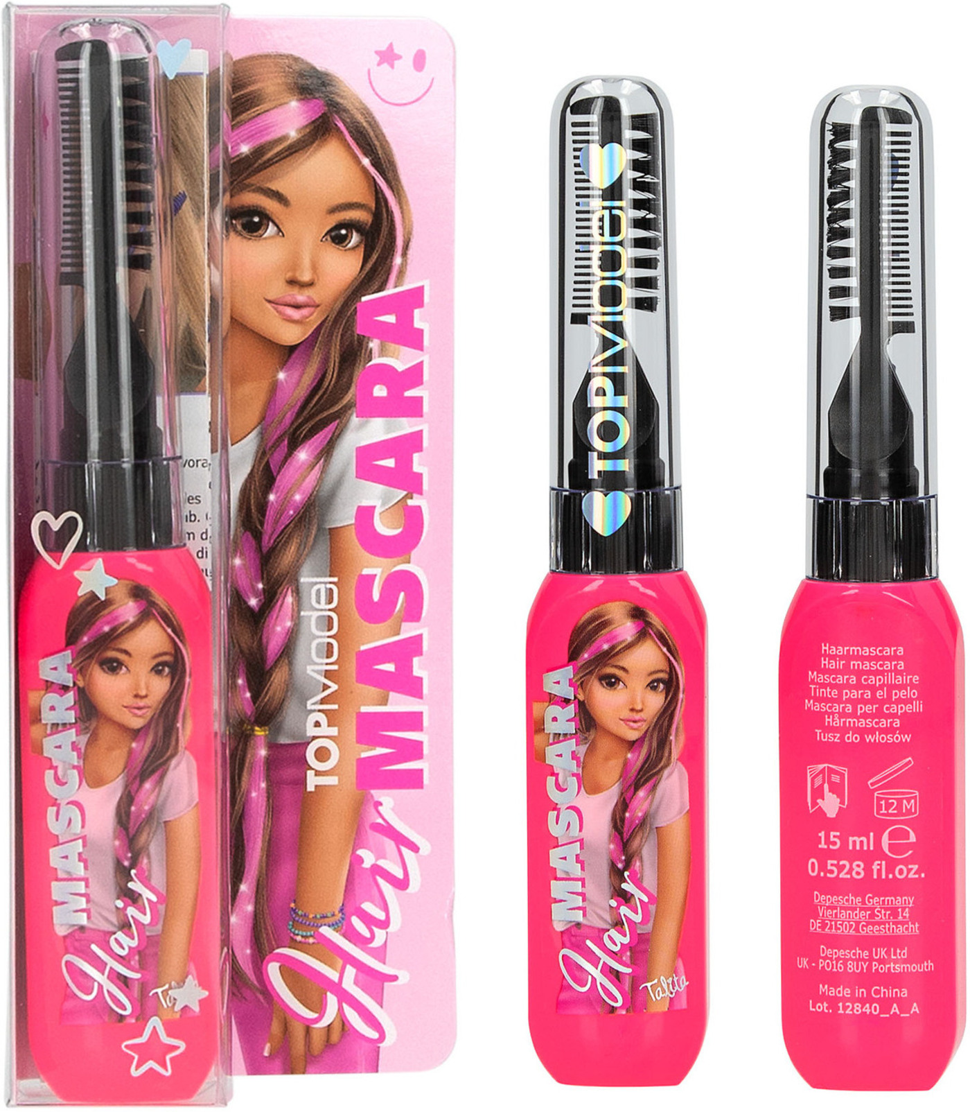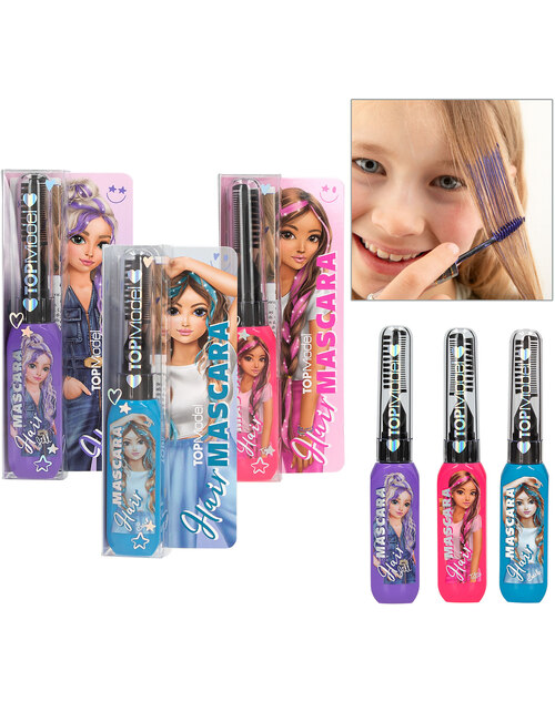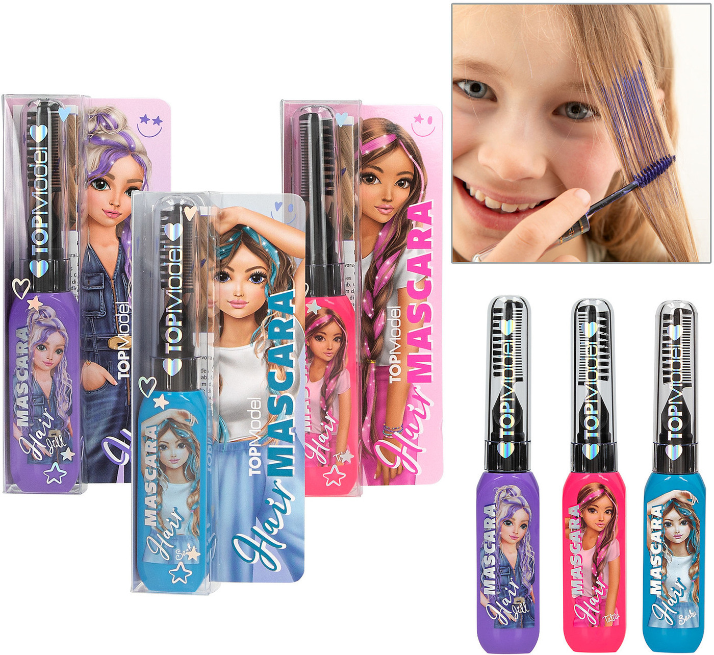 Für coole Farb-Akzente im Haar: Die Haarmascara von TOPModel macht kinderleicht tolle Strähnen. Mit dem Bürstchen die Farbe auftragen, dann mit dem kleinen Kamm im Deckel nachkämmen. In Blau, Pink und Lila. Die Farbe lässt sich problemlos auswaschen. Je 15 ml Haarmascara pro Fläschchen.