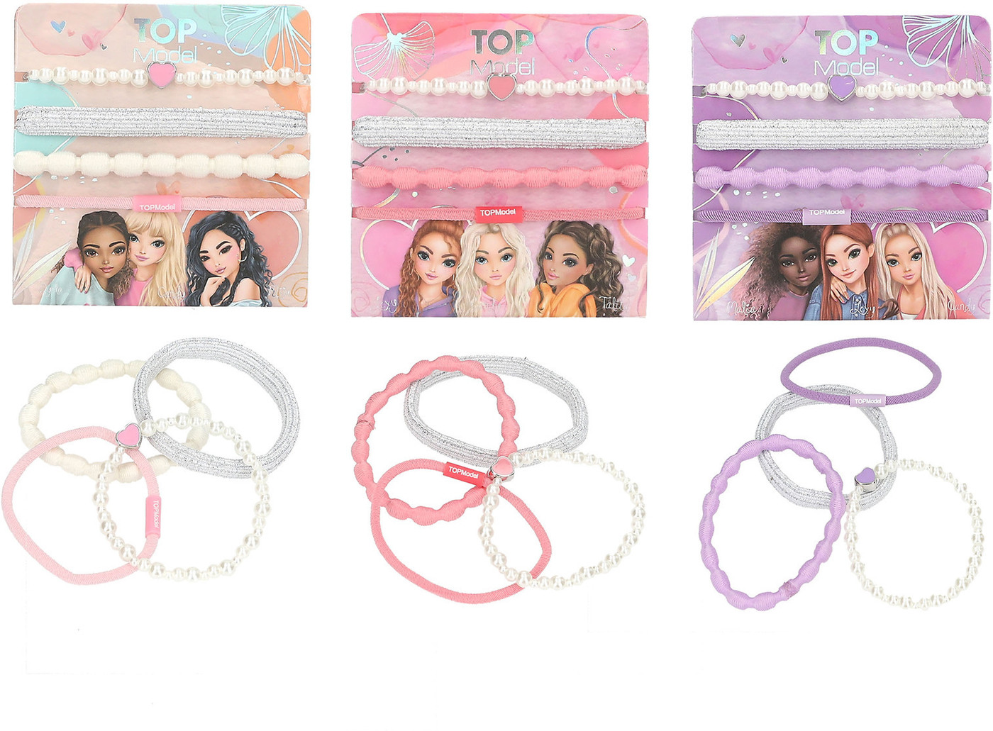Superschön als Haarband, aber genauso stylish als Armband: jeweils ein Band mit weißen Perlen und einem farbigen Herz, ein breites silberfarbenes Band, ein wellenförmiges Band und ein schmales Band mit TOPModel-Logo. Es gibt 3 Sets: in Rosé, in Lila und in Pink.