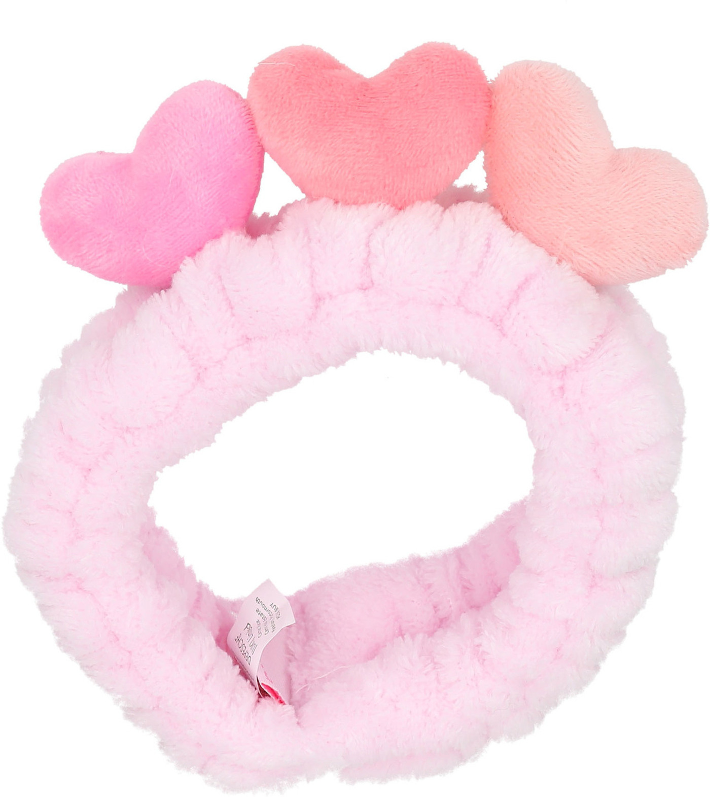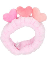 Kuschelig weich und perfekt für die Beauty-Routine: Das supersofte rosafarbene Haarband mit drei abstehenden Plüschherzen in unterschiedlichen Rosa-Tönen