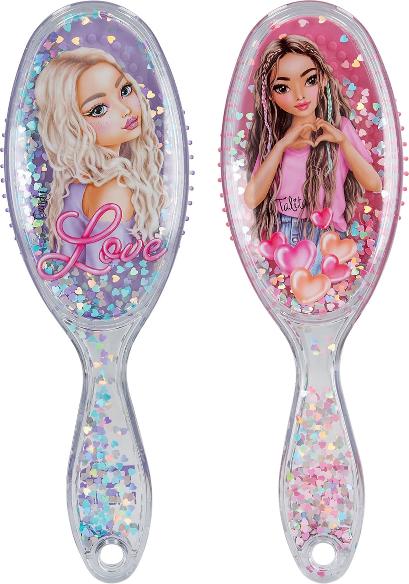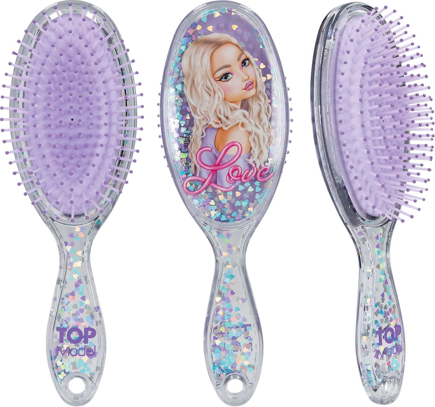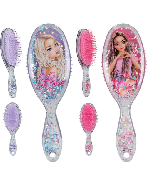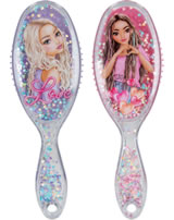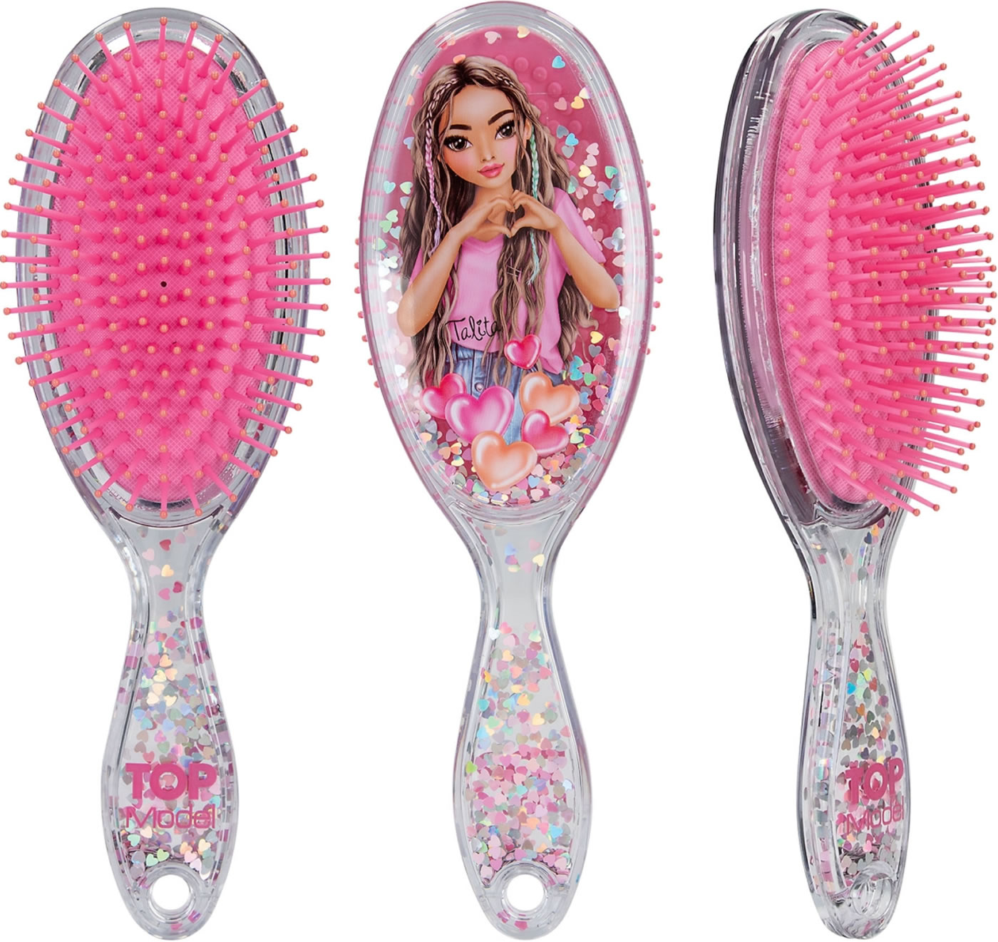 Konfetti-cool: Die transparenten TOPModel-Haarbürsten sind mit buntem Herzchen-Konfetti gefüllt, das sich bei Bewegung lustig hin- und herbewegt. Zwei Designs mit tollen Model-Motiven, weichem Gummikissen und flexiblen Plastikborsten.