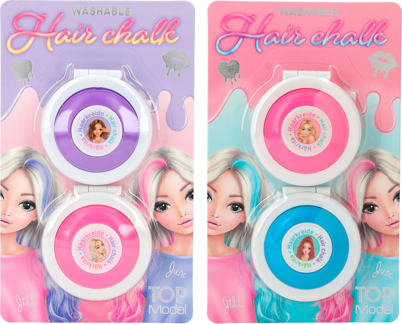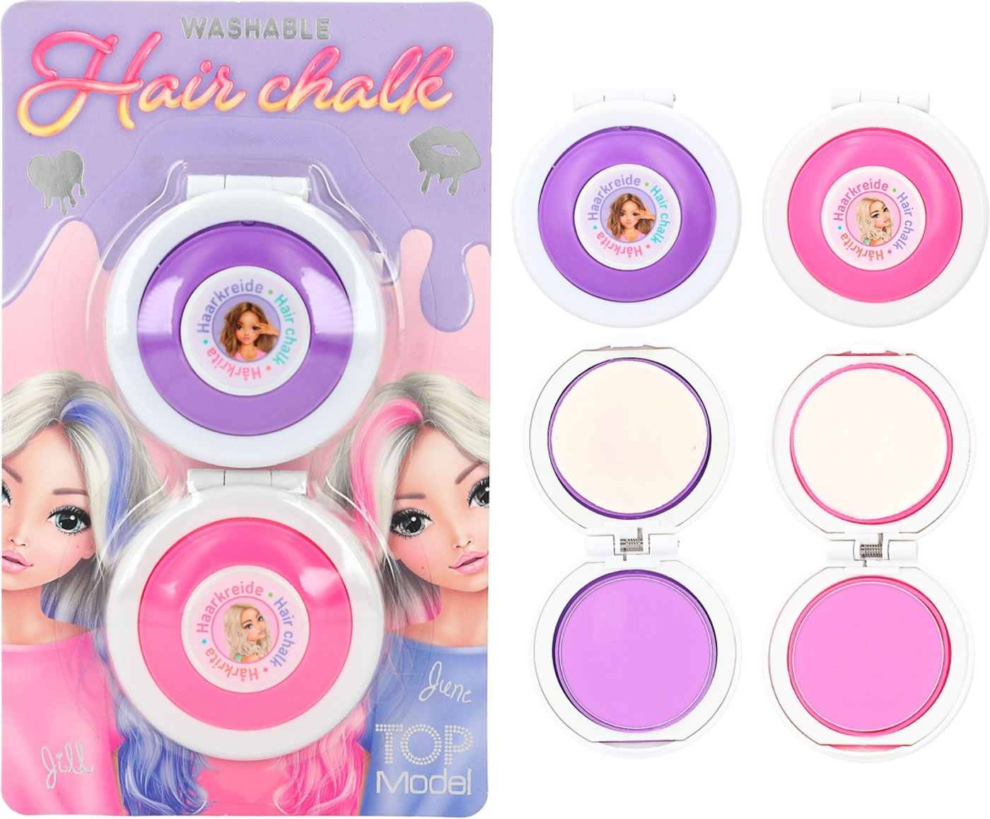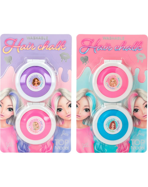 Mehr Spaß im Haar: Mit der Haarkreide von TOPModel kann man sich kinderleicht bunte Strähnen ins Haar zaubern. Zwei Farben pro Set: Lila und Pink (je 2,1 g) oder Pink und Blau (je, 2,1 g). Die Farbe ist leicht auswaschbar.