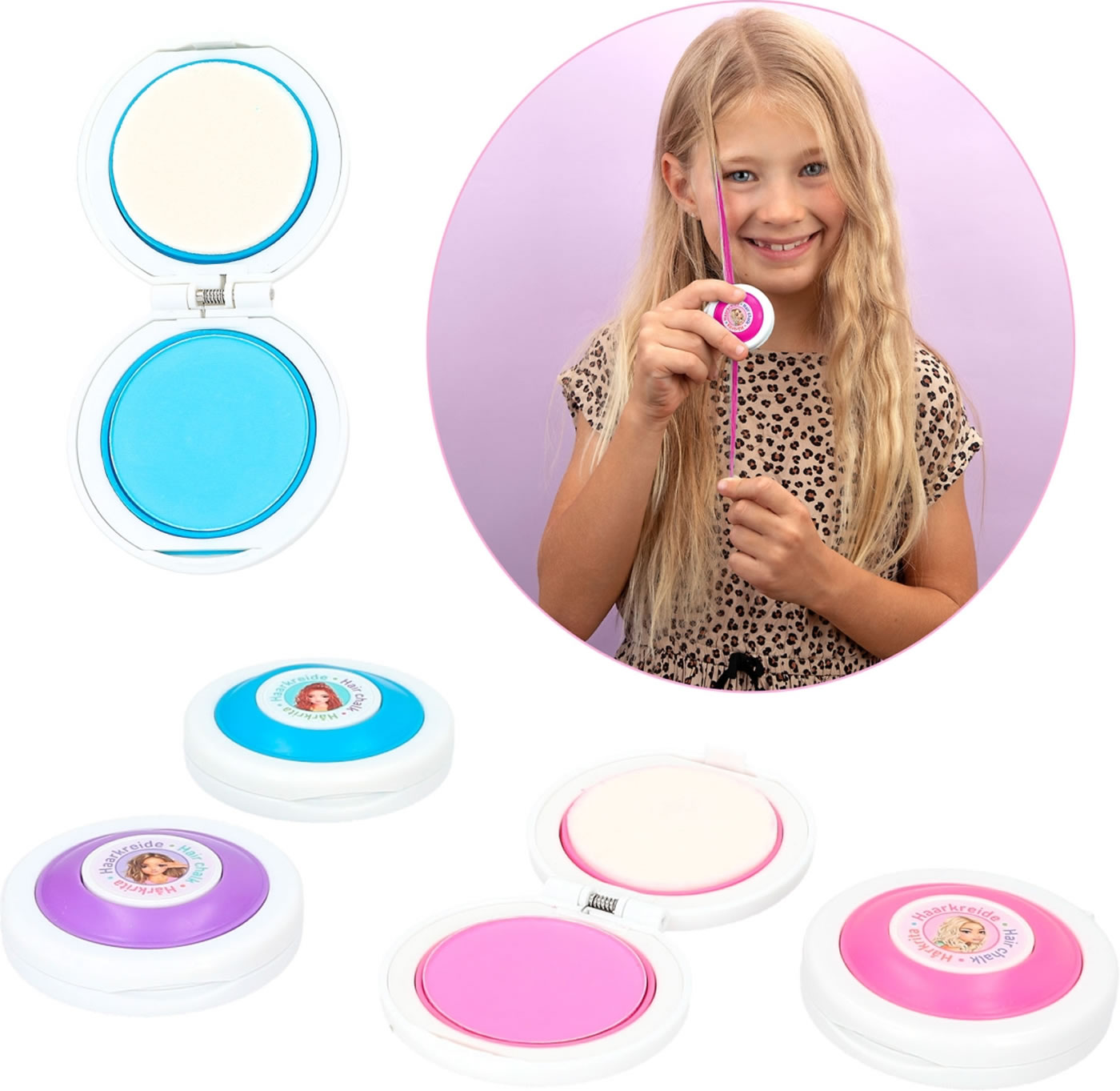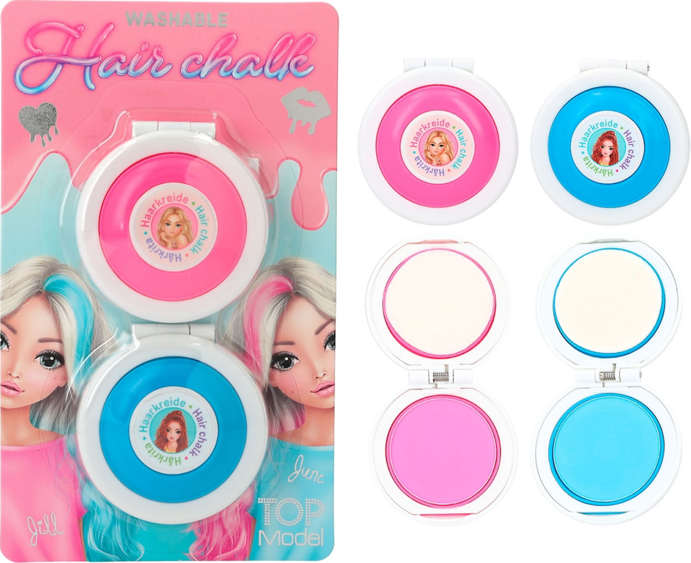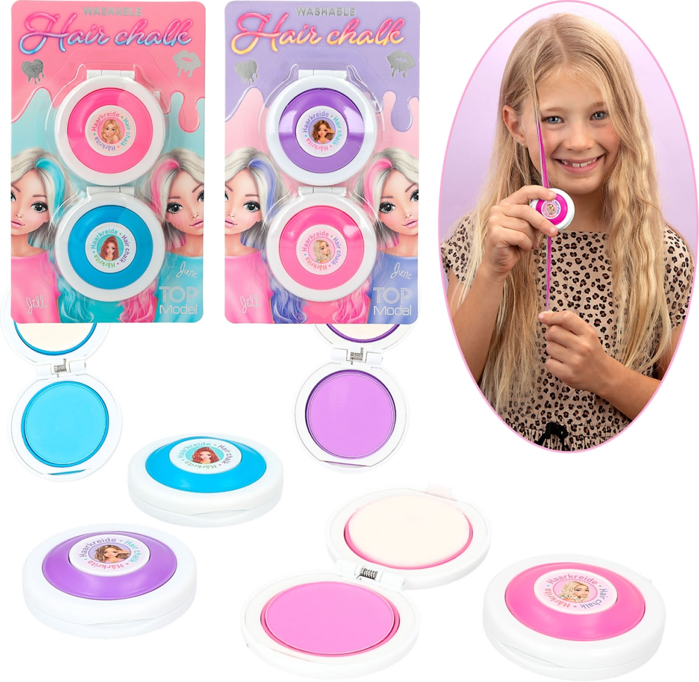Mehr Spaß im Haar: Mit der Haarkreide von TOPModel kann man sich kinderleicht bunte Strähnen ins Haar zaubern. Zwei Farben pro Set: Lila und Pink (je 2,1 g) oder Pink und Blau (je, 2,1 g). Die Farbe ist leicht auswaschbar.