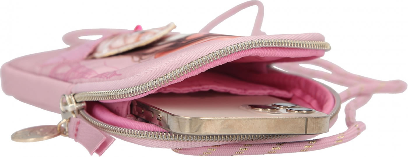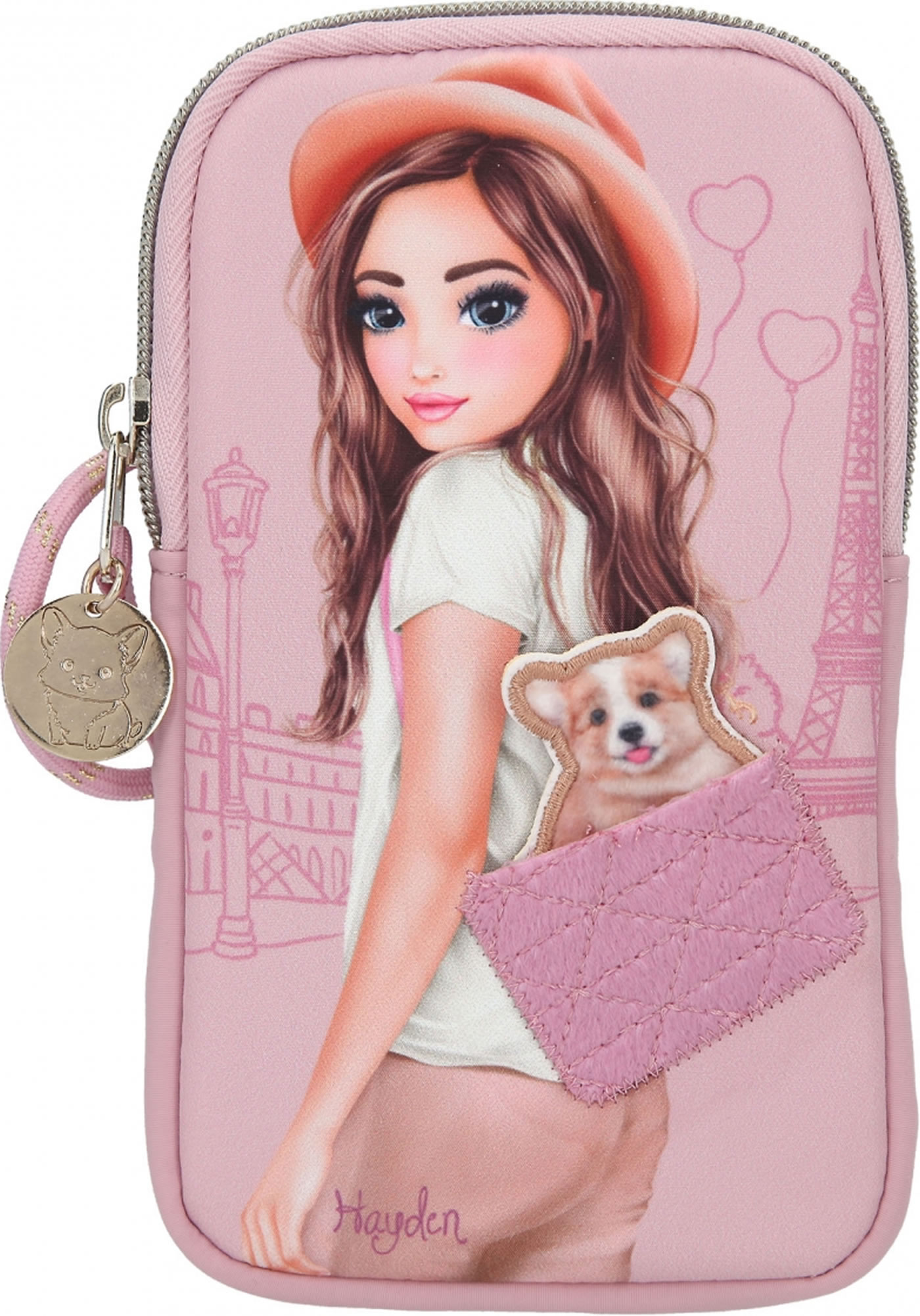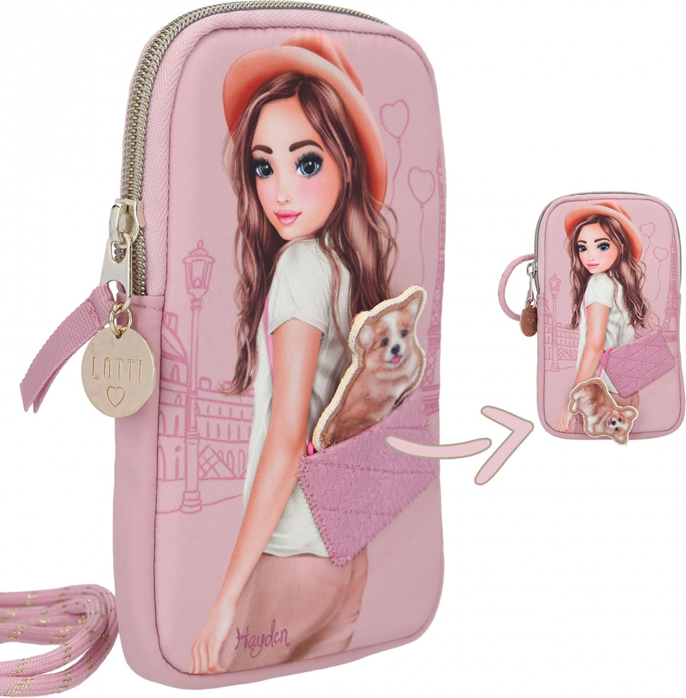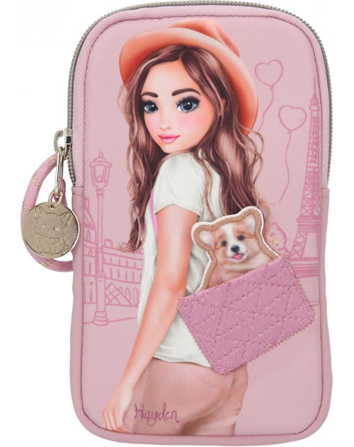 Ganz in rosa ist diese Handytasche mit dem TOPModel Hayden. Sie hat ihren süßen Corgi dabei, der in der Tasche sitzt aber auch herausgenommen werden kann.