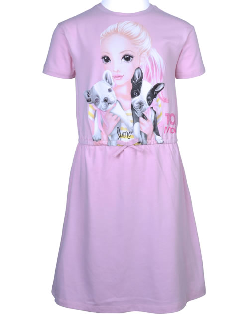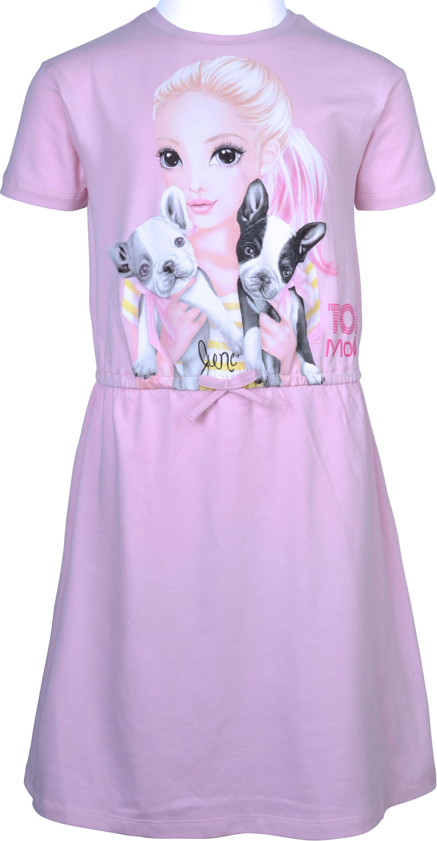 Sommerliches Kurzarm-Kleid in rosa von TOPMODEL mit dem Model June auf der Vorderseite. Das Kleid ist mit einem Gummizug tailliert. Zusätzlich ist es mit einer kleinen Schleife verziert. Der TOPModel Schriftzug ist leicht glitzernd.