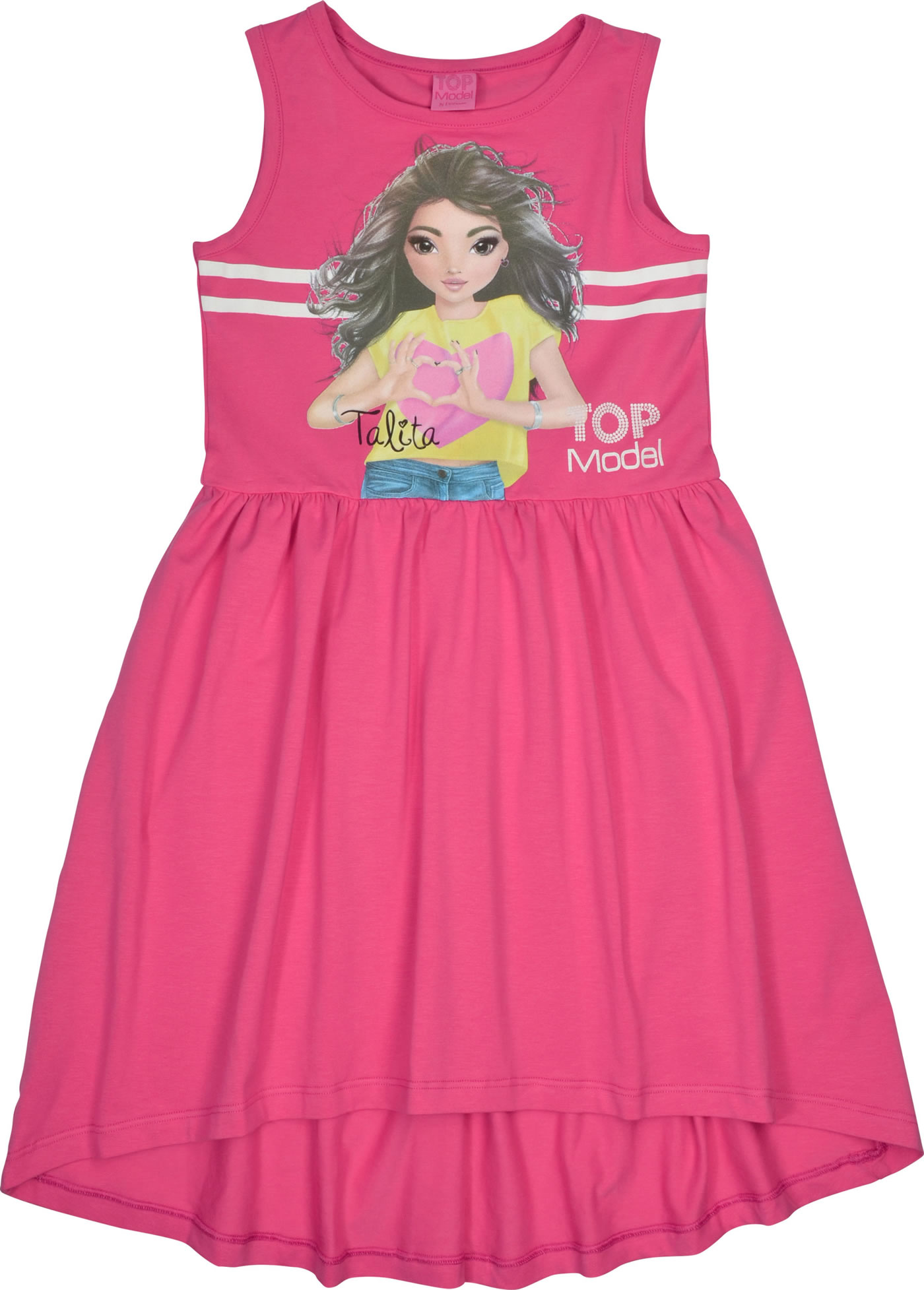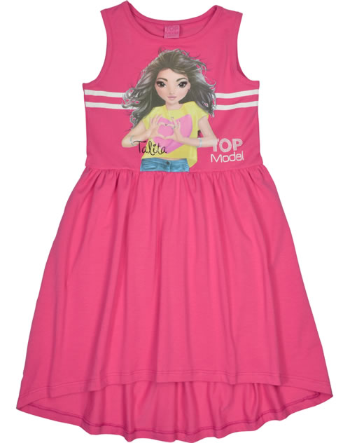 Hübsches Ärmelloses Kleid in pink von TOPModel mit dem Model Talita auf der Vorderseite. Zusätzlich wird das Shirt von einem glitzernden Print TOPModel geziert. Das kleid ist hat in der tailie einen leichten Gummizug und ist hinten länger geschnitten. Das angenehme Material bietet einen hohen Tragekomfort.