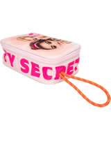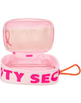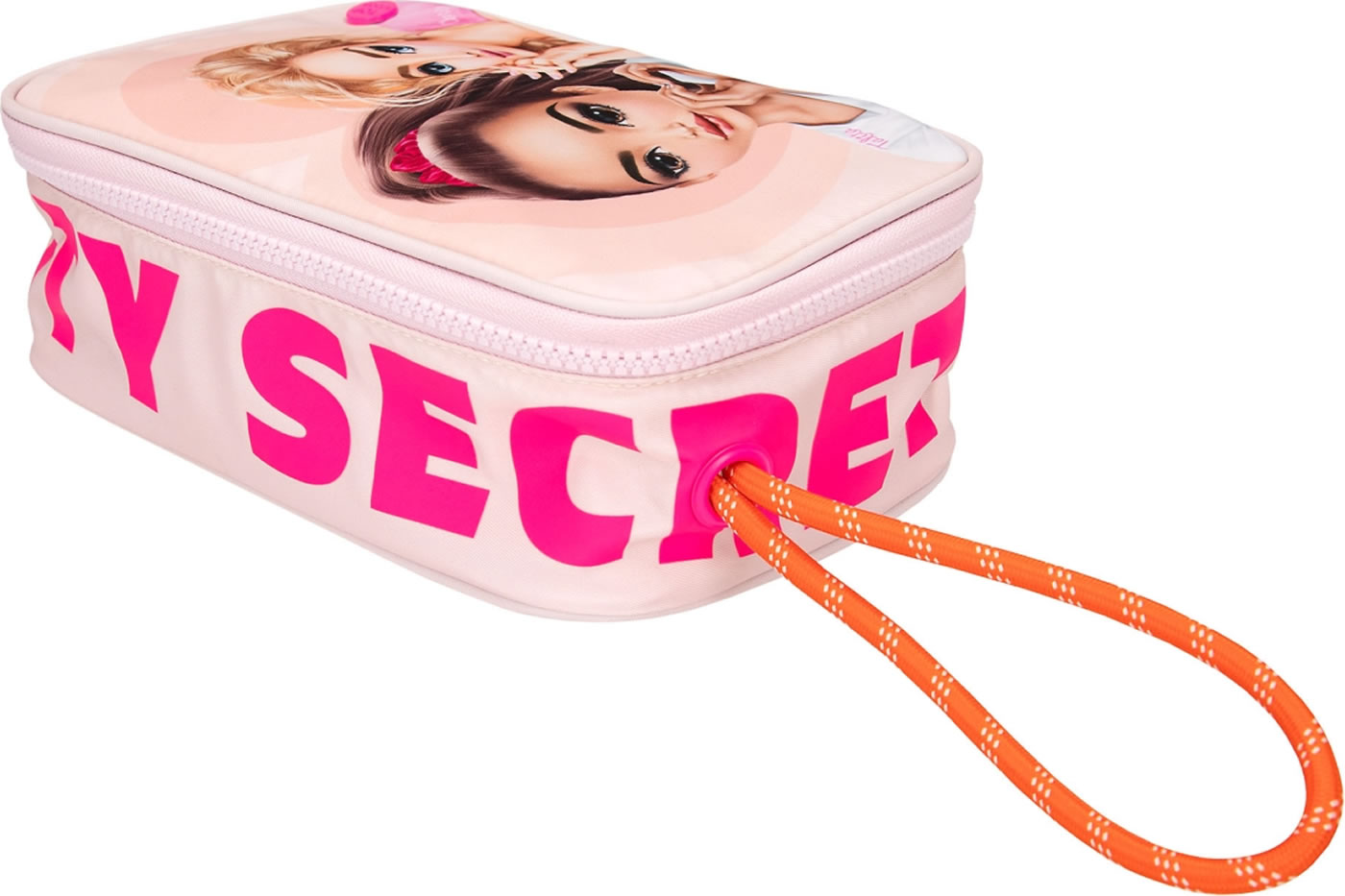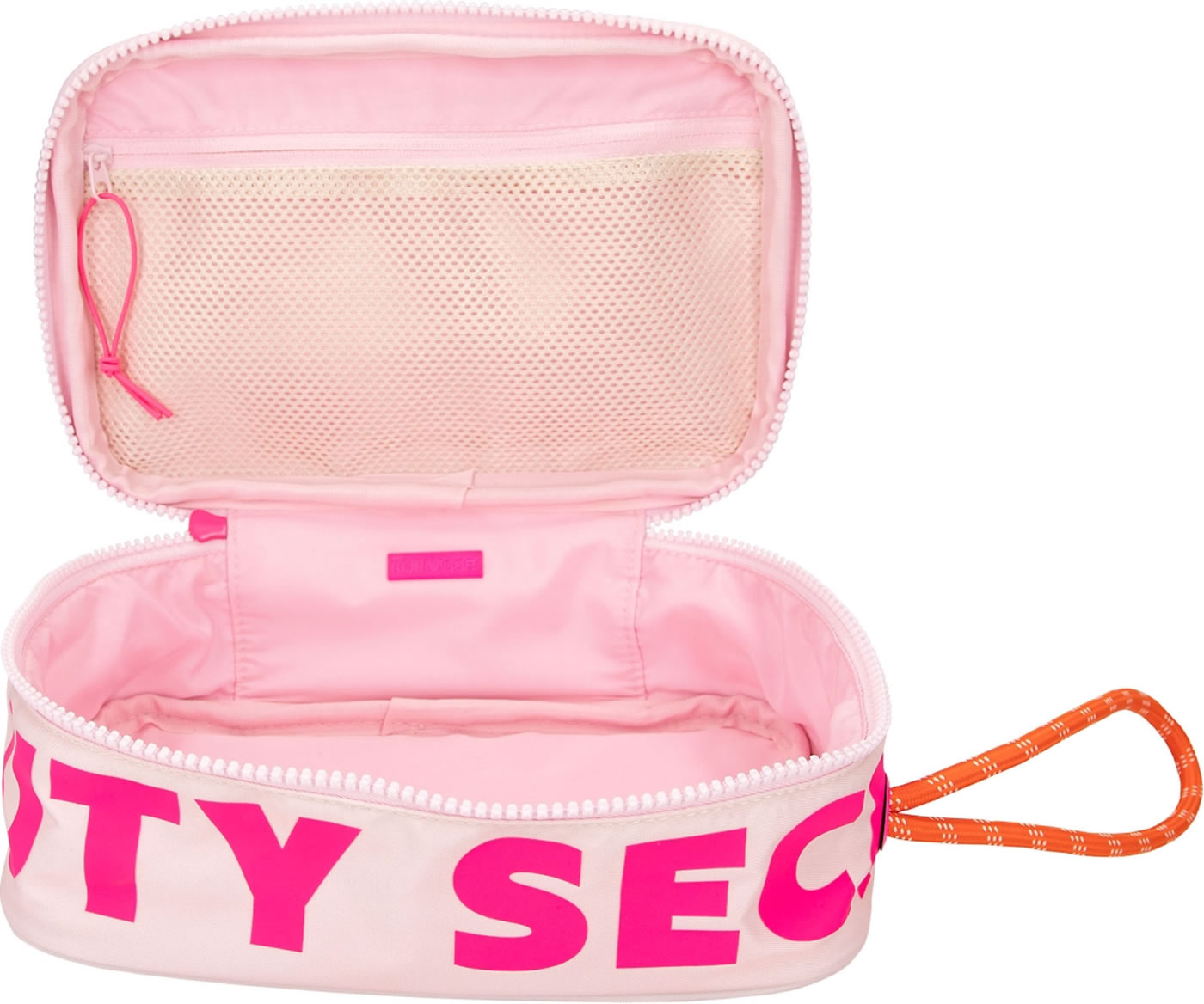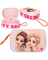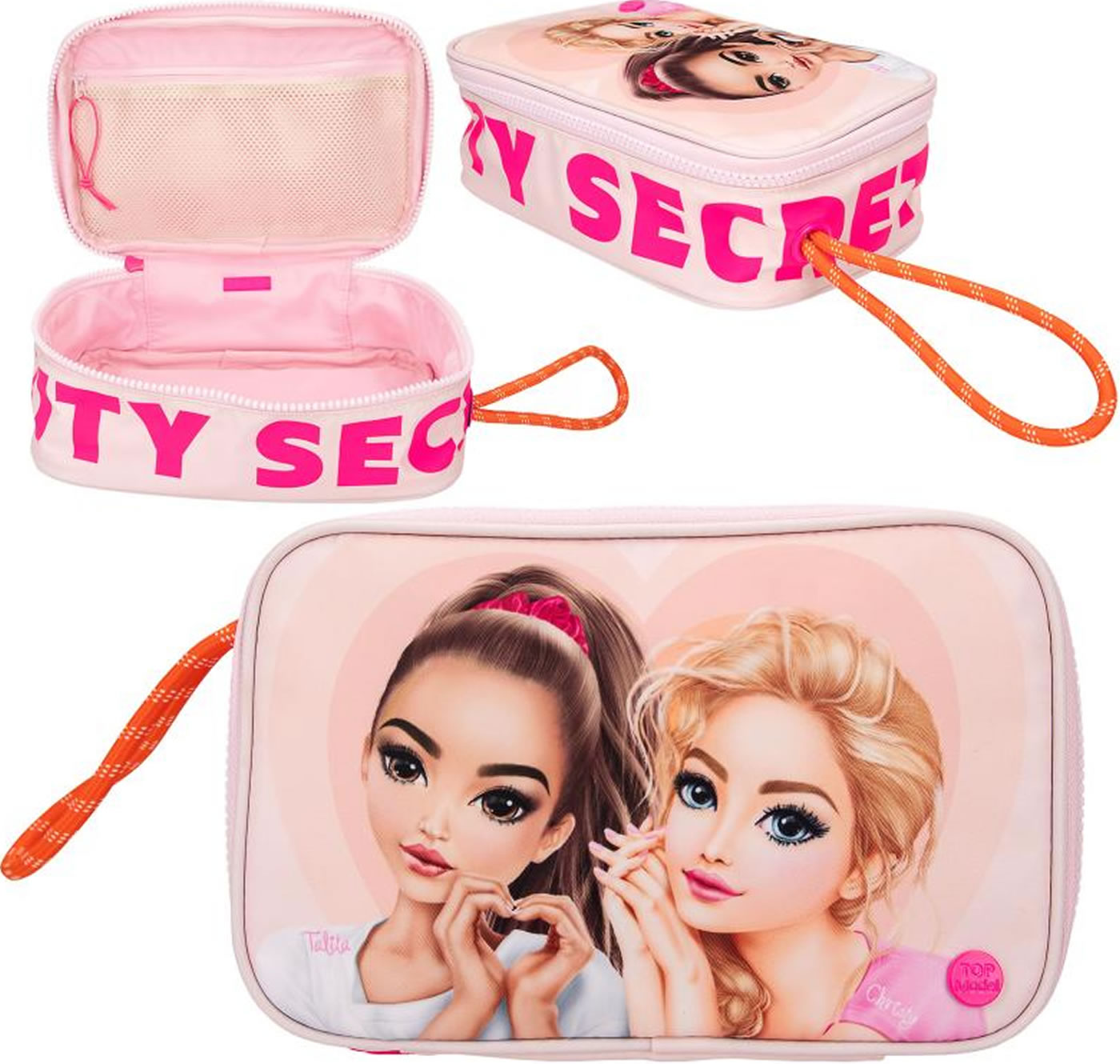 Die TOPModel-Kosmetiktasche in zartem Rosa hat coole Neon-Detail, ein seitlich umlaufendes plakatives Wording (BEAUTY SECRETS) und ein stylishes Model-Motiv auf der Front. Total praktisch: die orangefarbene Kordel zum Aufhängen.