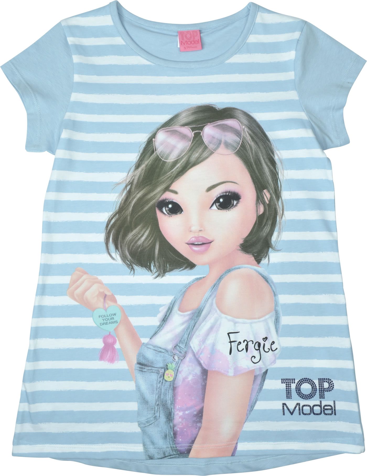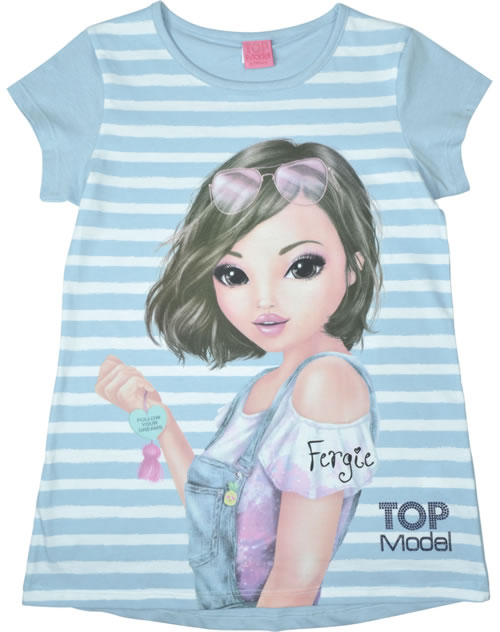 Sommerliches Kurzarm-Shirt in blau von TOPMODEL mit dem Model Fergie auf der Vorderseite.