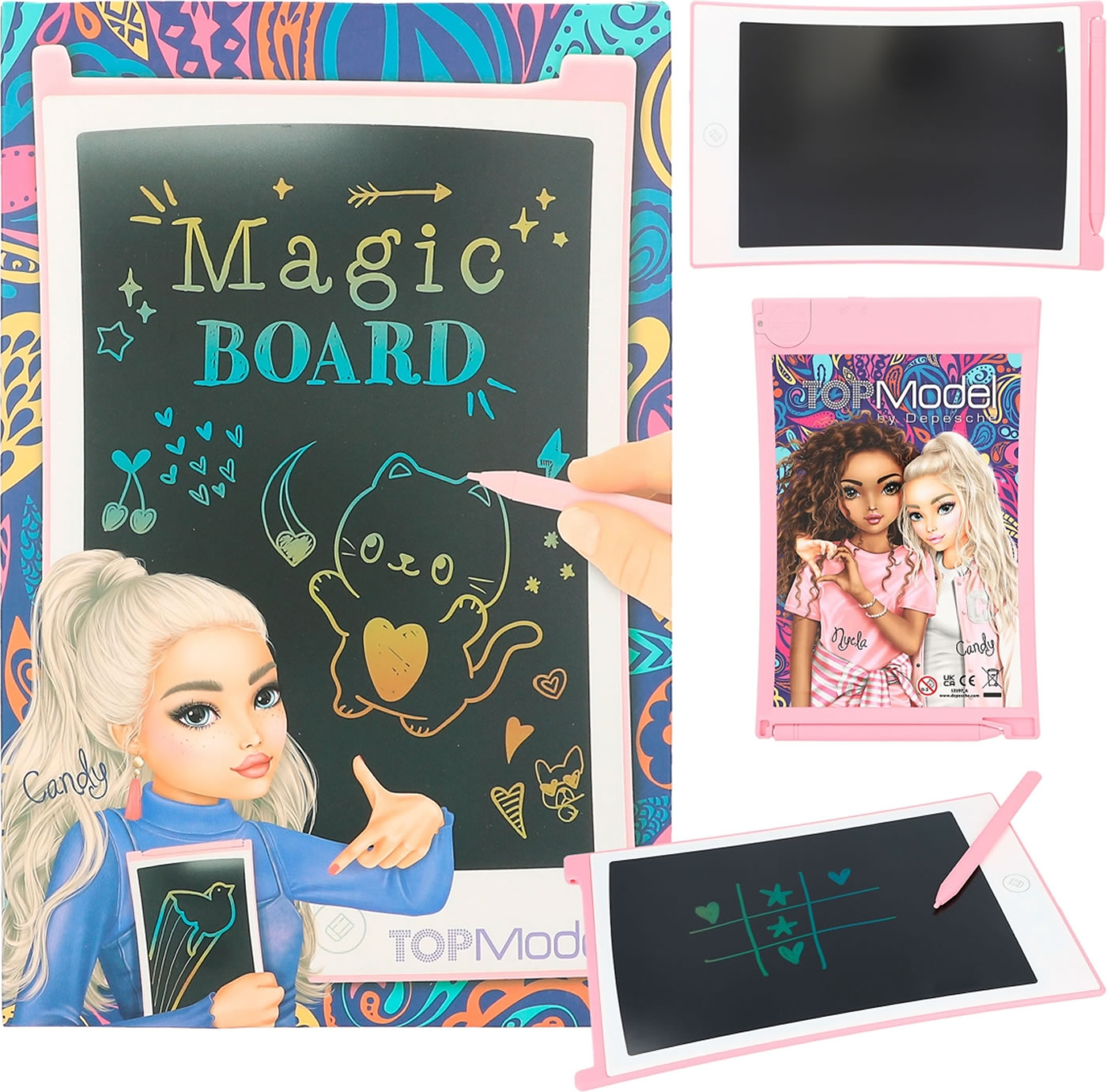 Immer wieder Malen und Schreiben: Auf der LCD-Tafel von TOPModel kann man seiner Kreativität freien Lauf lassen. Zeichnet man mit dem beiliegenden Stift, erscheinen auf dem Display die Farben Gelb, Orange, Grün und Blau. Mit Taste zum Löschen und Schalter zum Sichern eines Kunstwerkes. Das Display im rosa Gehäuse mit coolem TOPModel-Motiv auf der Rückseite misst 8,5 Zoll. Knopfbatterie enthalten und austauschbar.