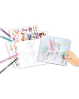 Das Create your Fantasy Friend Malbuch enthält 12 farbige Fantasy-Tiere, die mit den 458 enthaltenen Stickern verschönert werden können und 12 schwarz-weiße Vordrucke, die selbst farbig gestaltet werden können. Ob Einhorn-Lama, Schmetterlings-Pegasus oder Feuerpferd, die Tiere sind sehr kreativ gestaltet. Meine Tochter liebt diese Stickerbücher - ob Topmodel oder die Fantasy-Variante. Das kompakte Format ist ideal, um das Stickerheft in den Urlaub, ins Restaurant etc. mitzunehmen.