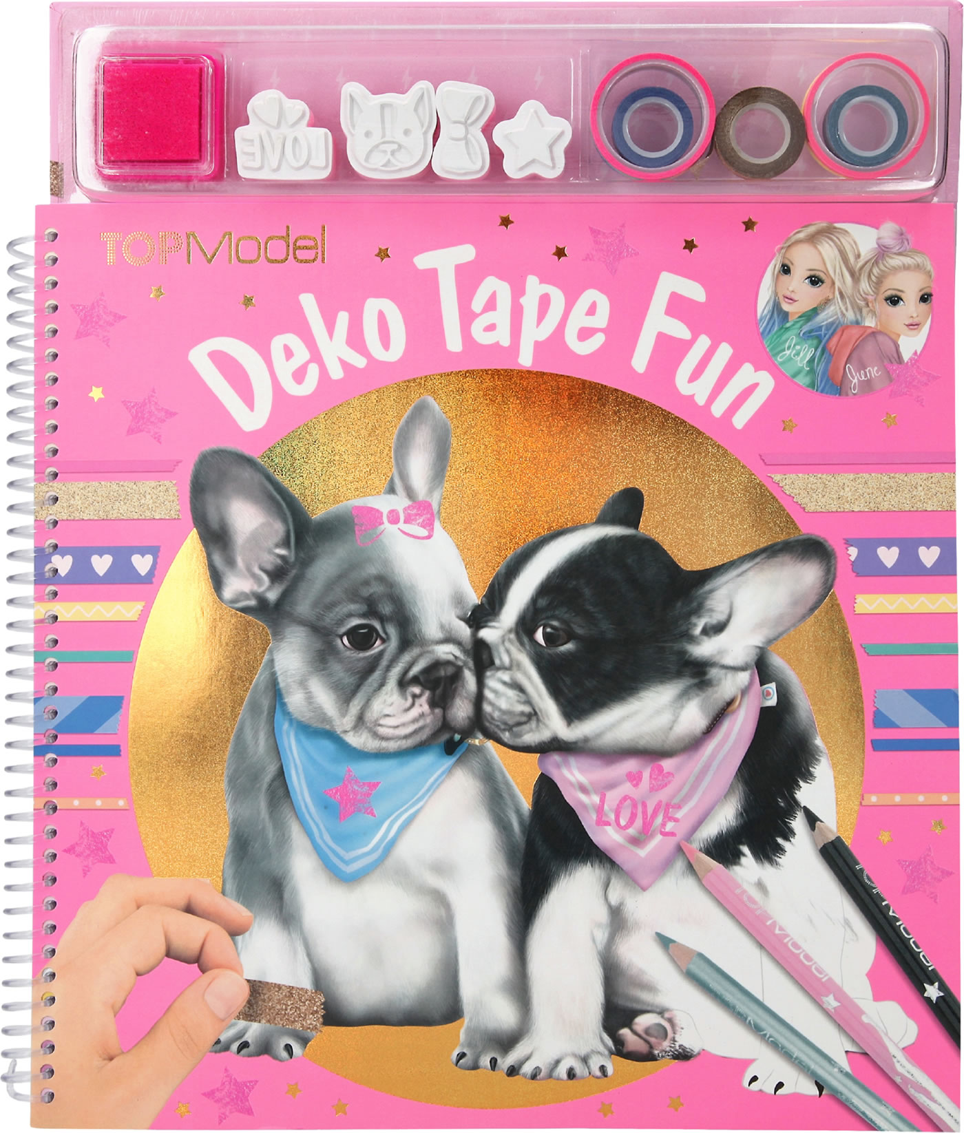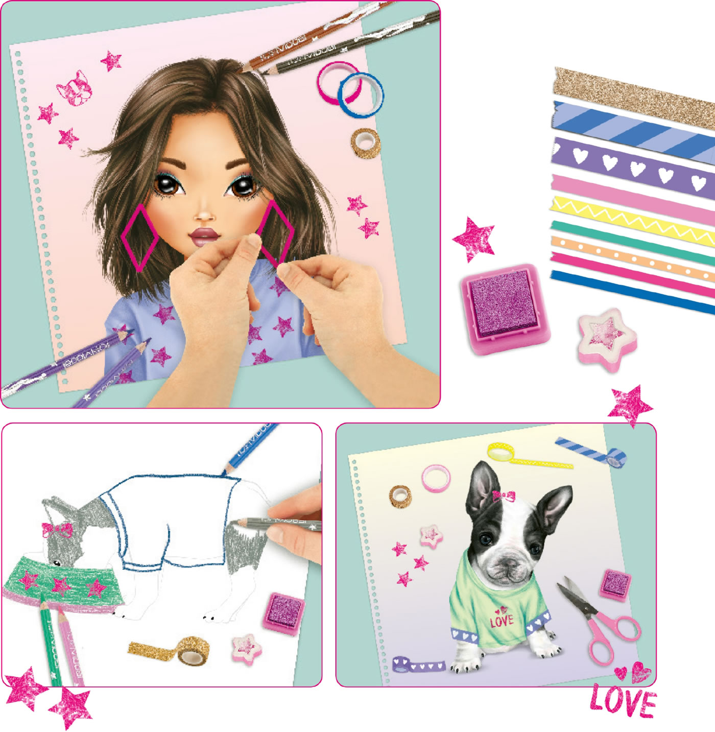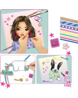 In diesem Malbuch findest du viele tolle Motive aus der TOPModel-Welt. Du kannst sie ausmalen und auch mit dem Deko Tape bekleben. Außerdem hast du vier Stempel, mit denen du tolle Motive drucken kannst.