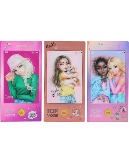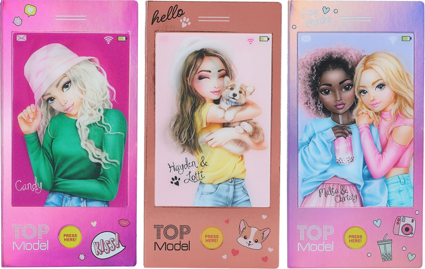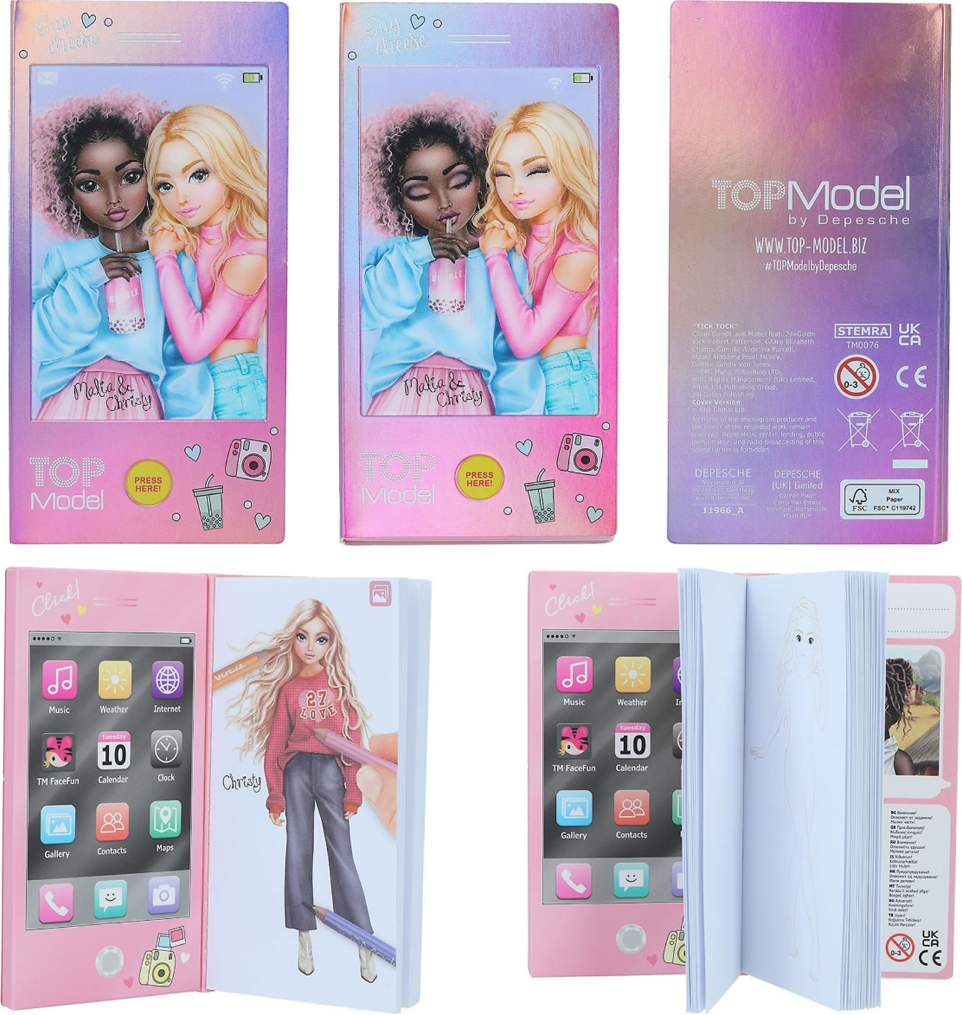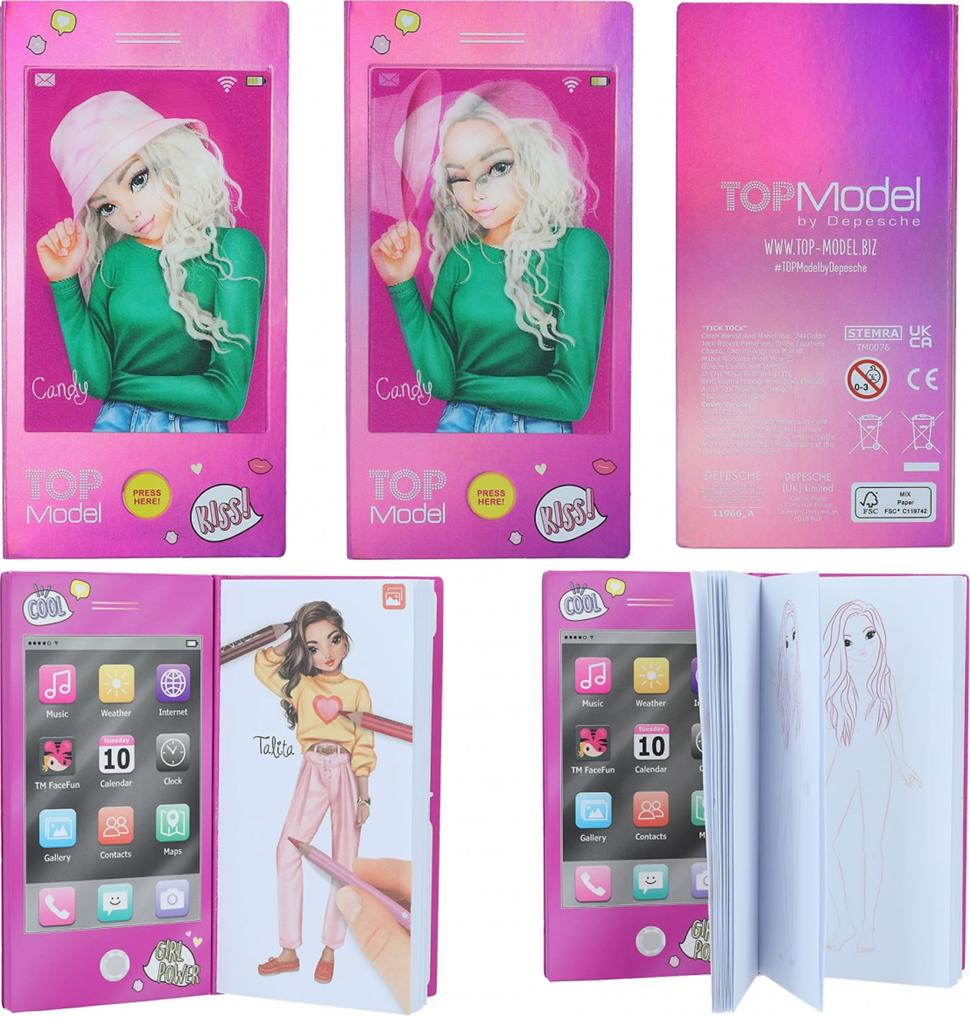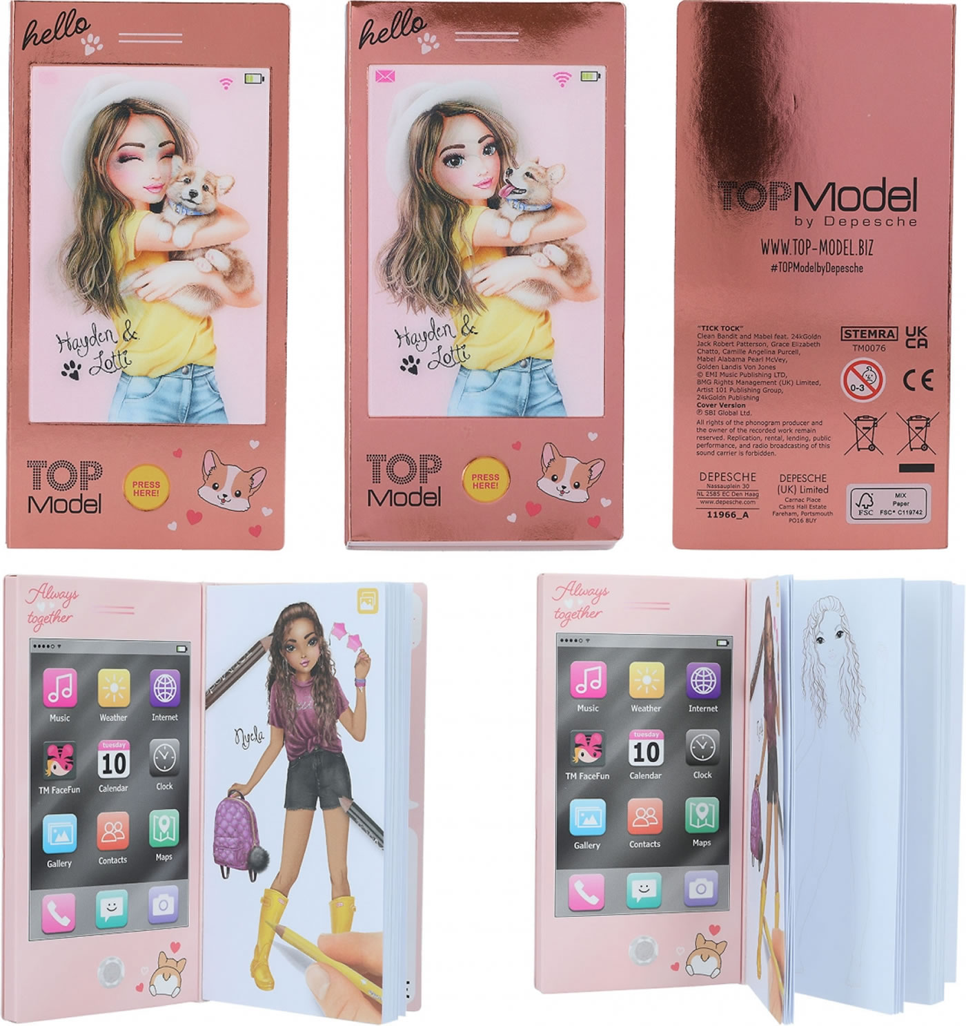 In dem kleinen Malbuch findest du 80 Seiten mit den TOPModel zum Ausmalen. Das Buch hat die Form eines Smartphones und wenn man auf den Cover-Button drückt, hörst du den Hit "Tick Tock".