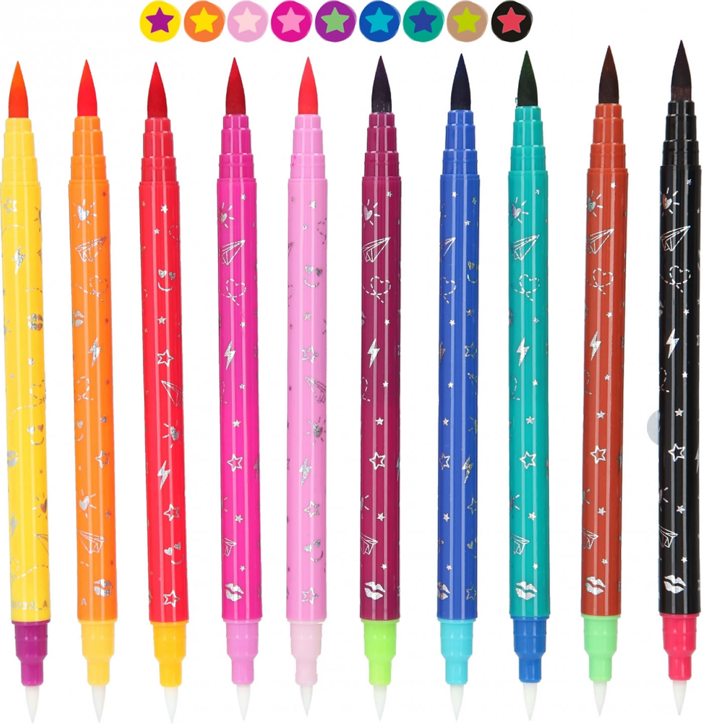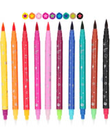 Jeder Stift hat eine farbige Pinselspitze (0,5-2 mm) und eine Magic-Spitze (0,5-2 mm). Malt man mit der Magic-Spitze über die zuvor gemalte Farbe, wechselt diese ihren Ton.