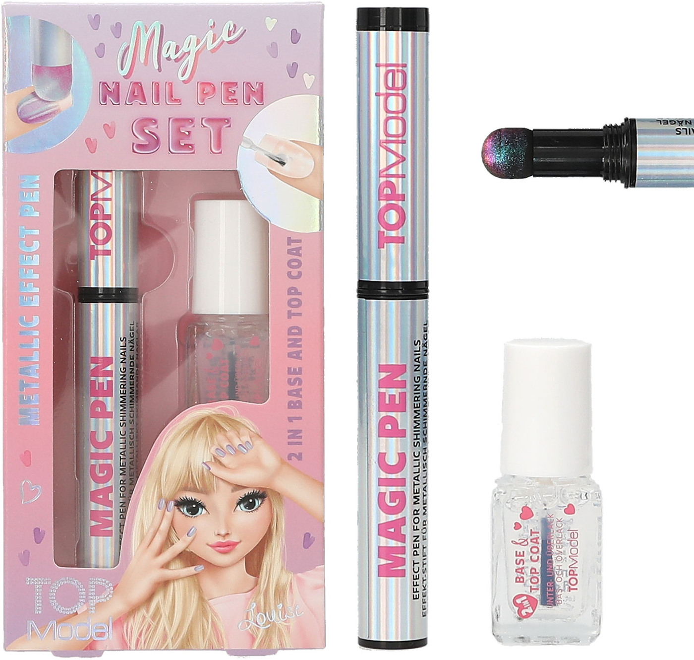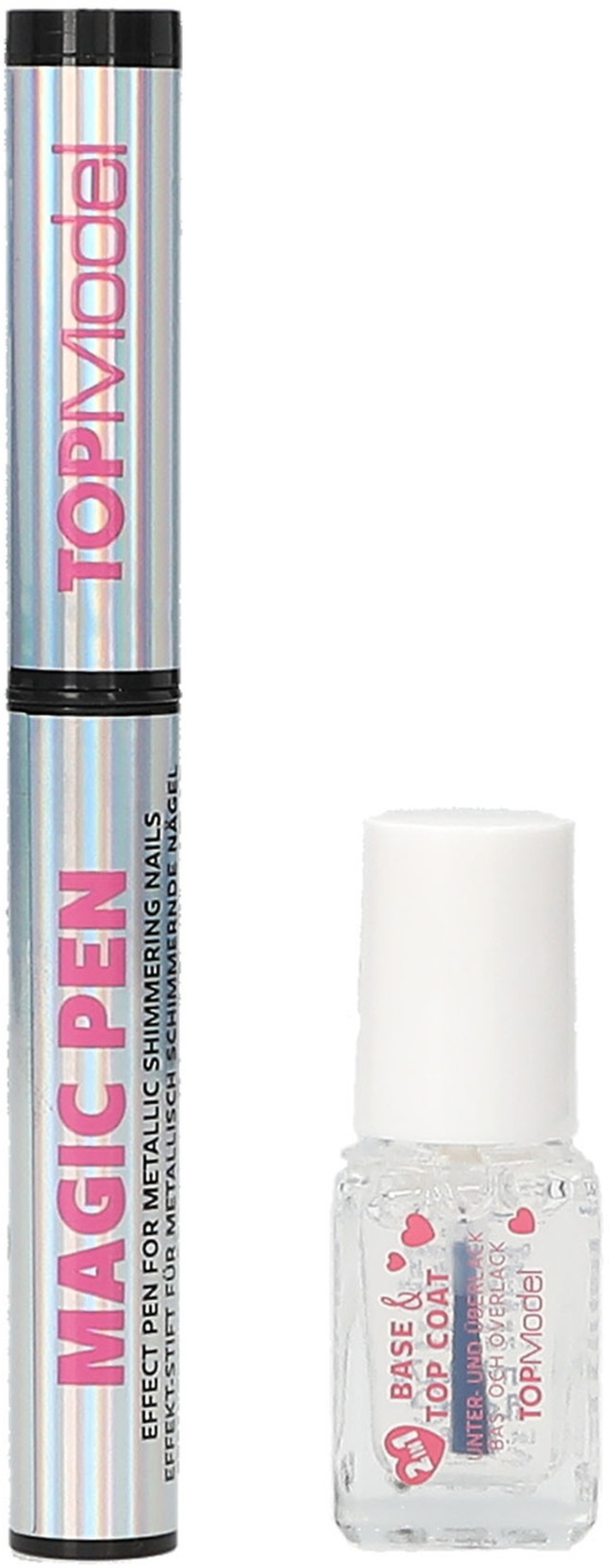 Mit dem magischen Nagel-Stift von TOPModel zaubert man ganz leicht coole metallische Looks auf die Fingernägel. Mit dabei: ein transparenter 2-in-1-Nagellack (5 ml), der als Base und Überlack aufgetragen wird. Der Nagellack ist auf Wasserbasis und lässt sich leicht abziehen.