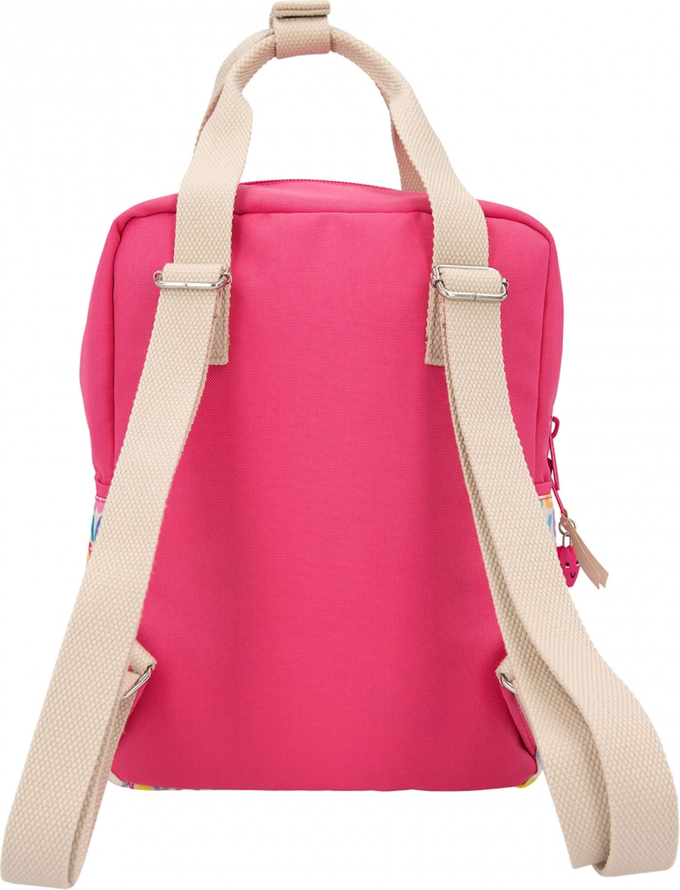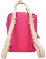 Verschlossen wird der Rucksack mit einem Reißverschluss. Er hat ein geräumiges Hauptfach mit Innentasche und Bodenverstärkung und eine kleine Vordertasche mit Reißverschluss. Die Träger sind längenverstellbar.