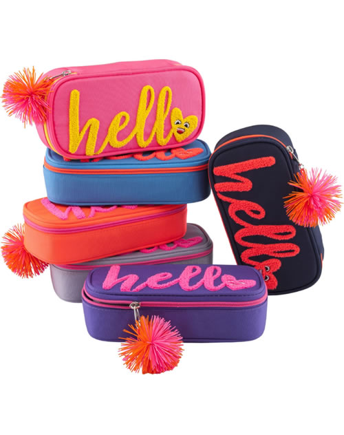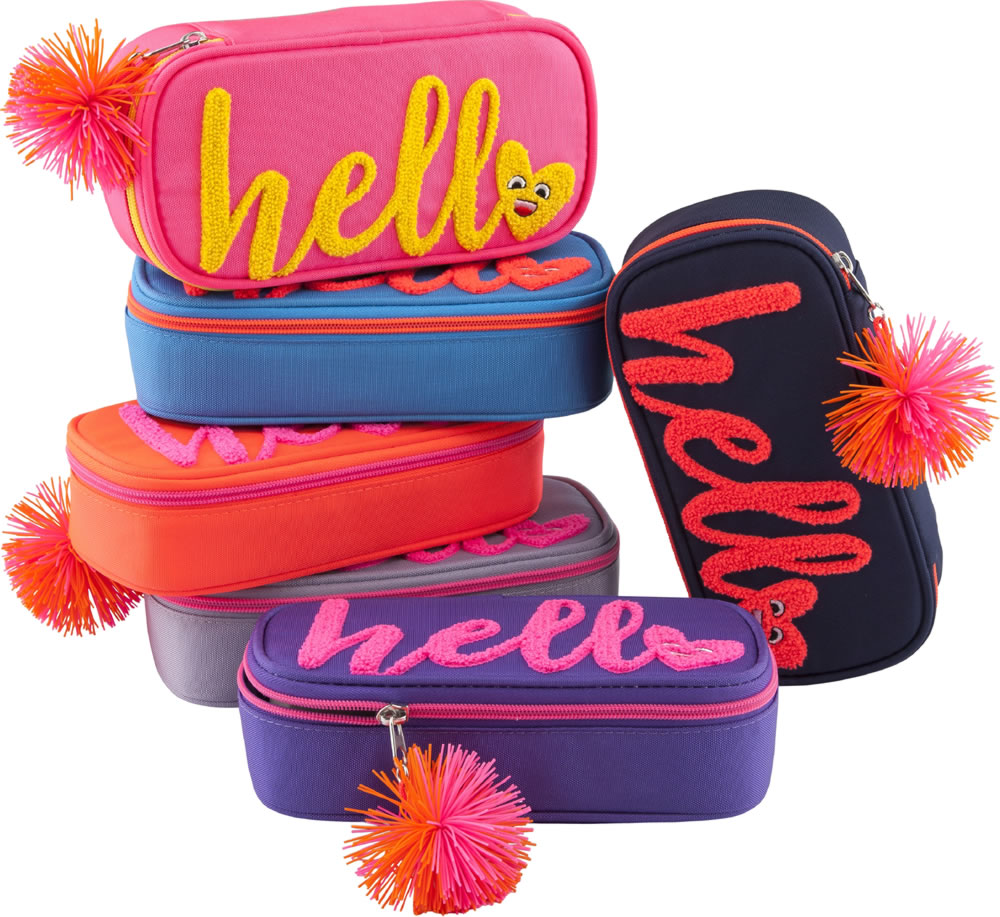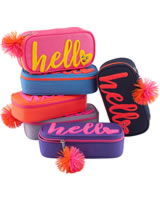 Praktisches Stiftemäppchen in poppigen Farben mit dem Schriftzug HELLO. Am Reißverschluss befindet sich ein bunter Bommel.