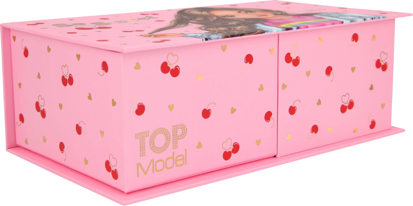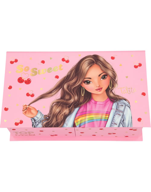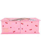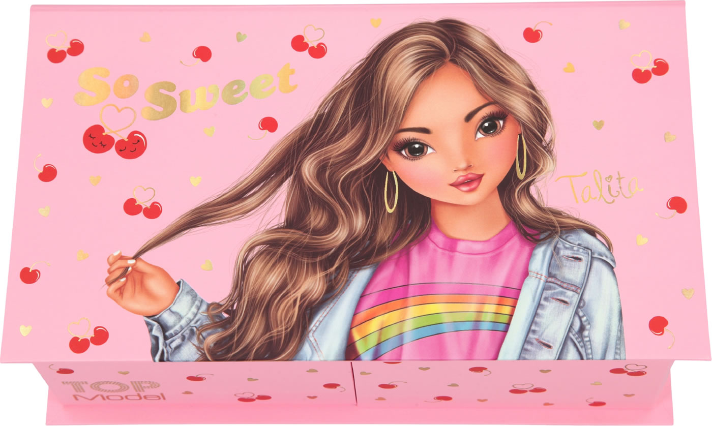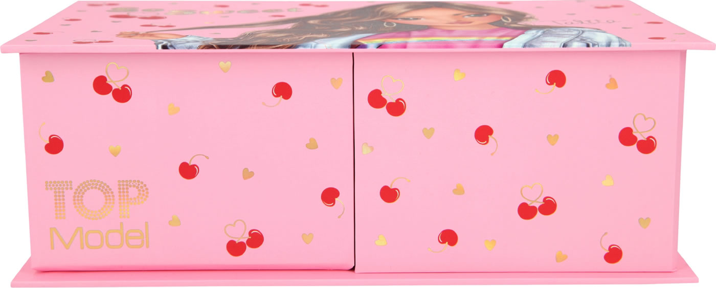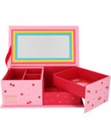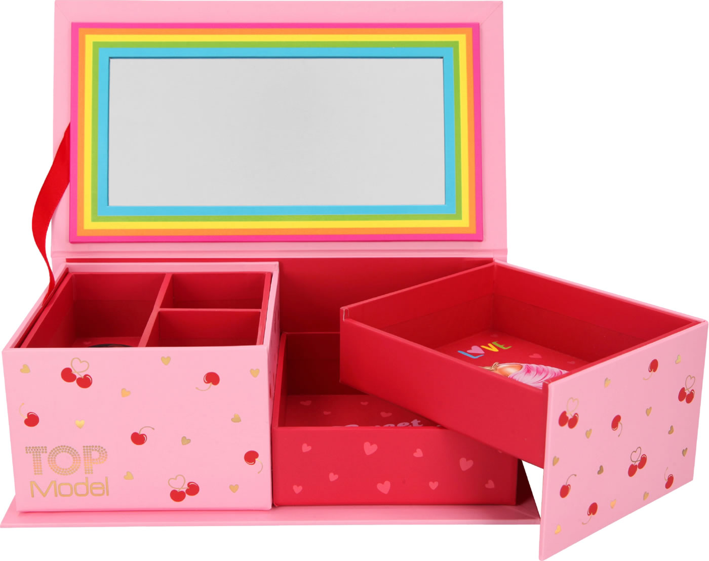 Das Schmuckkästchen hat 4 Fächer, von denen jeweils eines herausnehmbar und eines ausziehbar ist. Auf der Deckel-Innenseite befindet sich ein Spiegel.